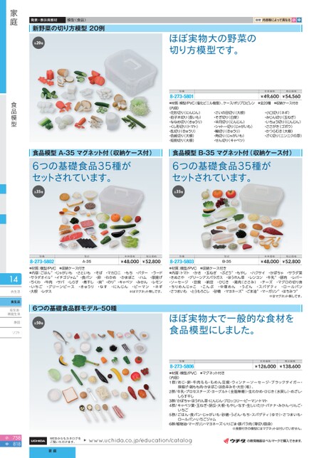 発表・表示用教材模型(食品)新野菜の切り方模型20例全20種目安内容等によって異なる小中ほぼ実物大の野菜の切り方模型です。型番本体価格税込価格8-273-5801●材質:模型/PVC(塩化ビニル樹脂)、ケース/ポリプロピレン●全20種●収納ケース付き¥49,600¥54,560〈内容〉・花形切り(にんじん)・拍子木切り(長いも)・ななめ切り(きゅうり)・くし形切り(トマト)・乱切り(きゅうり)・色紙切り(大根)・短冊切り(大根)・さいの目切り(大根)・そぎ切り(白菜)・半月切り(にんじん)・シャトー切り(じゃがいも)・輪切り(きゅうり)・角切り(じゃがいも)・せん切り(キャベツ)・小口切り(ネギ)・みじん切り(玉ねぎ)・いちょう切り(にんじん)・ささがき(ゴボウ)・かつらむき(大根)・ざく切り(ニンニクの芽)食品模型A-35マグネット付(収納ケース付)食品模型B-35マグネット付(収納ケース付)6つの基礎食品35種がセットされています。6つの基礎食品35種がセットされています。全35種全35種型番型式本体価格税込価格型番型式本体価格税込価格A-35●収納ケース付き8-273-5802●材質:模型/PVC●内容:ごはん※・じゃがいも・さといも・そば・マカロニ・もち・バター・ラード・サラダオイル※・イチゴジャム※・食パン・卵・わかめ・かまぼこ・ハム・厚揚げ・ちくわ・牛肉・サバ・しらす・煮干し・貝※・のり※・キャベツ・みかん・レモン・いちご・グリーンピース・きゅうり・なす・にんじん・ピーマン・ネギ・大根・レタス※はマグネット無しです。¥48,000¥52,800B-35●収納ケース付き8-273-5803●材質:模型/PVC●内容:トマト・かき・玉ねぎ・ぶどう※・もやし・ハクサイ・かぼちゃ・サラダ菜・きぬさや・グリーンアスパラガス・ほうれん草・レンコン・牛乳※・豚肉・レバー・ソーセージ・豆腐・納豆・ひじき・鶏肉(ささみ)・チーズ・マグロの切り身・ちりめんじゃこ・こんぶ・中華めん・うどん・スパゲティ・ロールパン・さつまいも・とうもろこし・砂糖・マヨネーズ※・ごま油※・マーガリン※・はちみつ※¥48,000¥52,800※はマグネット無しです。6つの基礎食品群モデル・50種全50種ほぼ実物大で一般的な食材を食品模型にしました。家庭食品模型衣生活食生活住生活・・家庭生活掛図ソフトソ型番8-273-5806●材質:模型/PVC●マグネット付き本体価格税込価格¥126,000¥138,600〈内容〉1群/あじ・卵・牛肉もも・もめん豆腐・ウィンナーソーセージ・ブラックタイガー・厚揚げ・鶏もも肉・かまぼこ・淡色辛みそ・大豆(乾)、2群/牛乳・プロセスチーズ・ヨーグルト(全脂無糖)・生わかめ・ひじき(水戻し)・めざし・3群/かぼちゃ・ほうれん草・にんじん・ブロッコリー・ピーマン・トマト4群/キャベツ葉・玉ねぎ・胡瓜・大根・もやし・なす・生しいたけ・バナナ・みかん・りんご・しらす干しいちご5群/ごはん・食パン・じゃがいも・砂糖・うどん・もち・スパゲティ(ゆで)・さつまいも・ロールパン・いちごジャム6群/植物油・マーガリン・マヨネーズ・いりごま・豚バラ肉(薄切り脂身)※食器付きの模型にはマグネットは付いていません。小中WEBからもカタログをご覧いただけます。www.uchida.co.jp/education/catalogの教育機器はベルマークで購入できます。家庭