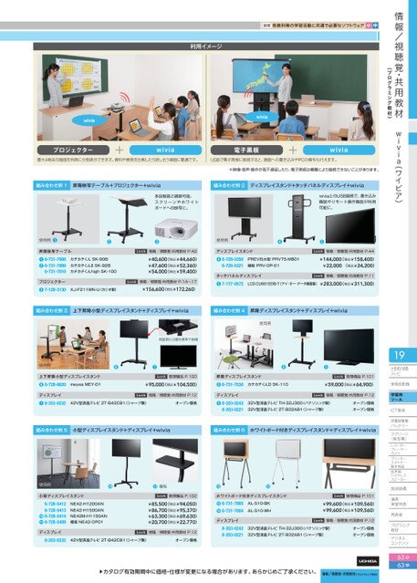 情報/視聴覚・共用教材wivia(ワイビア)(プログラミング教材)大型提示装置・型提示装置・テレビビ実物投影機学習用ツールICT家具T家具充電保管庫・・バッテリーッテリースクリーンクリーン(映写幕)レコーダー・レコーダー・プレーヤー・プレーヤー・カメララプリンター・プリンター・スキャナー・スキャナー・製本用品製本用品拡声器・拡声器・ワイヤレスヤススピーカースピーカー放送設備道具・実習用具発表板プログラミング教材デジタルコンテンツテンツ小中目安各教科等の学習活動に共通で必要なソフトウェア小中利用イメージwiviawiviaプロジェクターwivia電子黒板wivia最大4端末の画面を同時に分割表示できます。資料や意見を比較したり話し合う場面に最適です。USBで電子黒板に接続すると、画面への書き込みやPCの操作も行えます。※映像・音声・操作が若干遅延したり、電子黒板は機種により接続できないことがあります。組み合わせ例1昇降映写テーブル+プロジェクター+wivia組み合わせ例2ディスプレイスタンド+タッチパネルディスプレイ+wivia多段階高さ調節可能。スクリーンやホワイトボードへの映写に。wiviaとのUSB接続で、書き込み機能やリモート操作機能が利用可能に。使用例❶❷❸使用例❹❺昇降映写テーブル❶6-731-7008❷6-731-70096-731-7010カチカチくんSK-90BカチカチくんⅡSK-92BカチカチくんhighSK-100Look情報/視聴覚・共用教材P.42¥40,600(税込¥44,660)¥47,600(税込¥52,360)¥54,000(税込¥59,400)プロジェクター❸7-120-3130XJ-F211WN-U〈カシオ製〉Look情報/視聴覚・共用教材P.14〜17¥156,600(税込¥172,260)ディスプレイスタンド❹6-728-53506-728-5321PREVIS大型PRV75-MB01棚板PRV-OP-01Look情報/視聴覚・共用教材P.44¥144,000(税込¥158,400)¥22,000(税込¥24,200)Look情報/視聴覚・共用教材P.11タッチパネルディスプレイ❺7-177-0572LCD-CU651EDB-T〈アイ・オー・データ機器製〉¥283,000(税込¥311,300)組み合わせ例3上下昇降小型ディスプレイスタンド+ディスプレイ+wivia組み合わせ例4昇降ディスプレイスタンド+ディスプレイ+wivia背面側には棚を標準で装備使用例使用例❻❼❽❾上下昇降小型ディスプレイスタンド❻6-728-8620meyesMEY-D1Look管理備品P.100¥95,000(税込¥104,500)昇降ディスプレイスタンド❽6-731-7030カチカチくんDSK-110ディスプレイ❼8-203-023242V型液晶テレビ2T-B42CB1〈シャープ製〉オープン価格Look情報/視聴覚・共用教材P.12ディスプレイ❾8-203-02438-203-022132V型液晶テレビTH-32J300〈パナソニック製〉32V型液晶テレビ2T-B32AB1〈シャープ製〉オープン価格オープン価格Look管理備品P.101¥59,000(税込¥64,900)Look情報/視聴覚・共用教材P.12組み合わせ例5小型ディスプレイスタンド+ディスプレイ+wivia組み合わせ例6ホワイトボード付きディスプレイスタンド+ディスプレイ+wivia使用例❿⓫棚板⓬⓭小型ディスプレイスタンド6-728-54126-728-5413❿6-728-5414⓫6-728-5409NE42-H1200ANNE42-H1500ANNE42M-H1150AN棚板NE42-OP01Look管理備品P.102¥85,500(税込¥94,050)¥86,700(税込¥95,370)¥63,300(税込¥69,630)¥20,700(税込¥22,770)ディスプレイLook情報/視聴覚・共用教材P.128-203-023242V型液晶テレビ2T-B42CB1〈シャープ製〉オープン価格ホワイトボード付きディスプレイスタンド⓬6-731-7005⓭6-731-7004AL-S10-WHAL-S10-BKディスプレイLook管理備品P.101¥99,600(税込¥109,560)¥99,600(税込¥109,560)Look情報/視聴覚・共用教材P.128-203-02438-203-022132V型液晶テレビTH-32J300〈パナソニック製〉32V型液晶テレビ2T-B32AB1〈シャープ製〉オープン価格オープン価格▲カタログ有効期間中に価格・仕様が変更になる場合があります。あらかじめご了承ください。情報/視聴覚・共用教材(プログラミング教材)