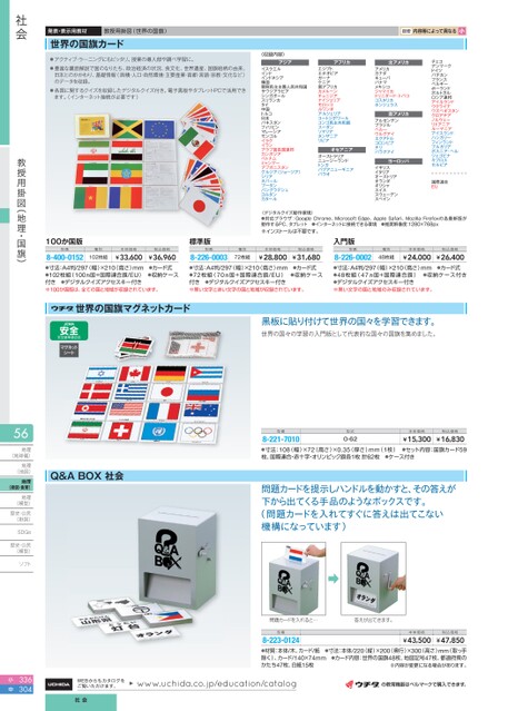 発表・表示用教材教授用掛図(世界の国旗)世界の国旗カード●アクティブ・ラーニングにもピッタリ。授業の導入部や調べ学習に。●豊富な裏面解説で国のなりたち、政治経済の状況、食文化、世界遺産、国旗絵柄の由来、日本とのかかわり、基礎情報(面積・人口・自然環境・主要産業・首都・言語・宗教・文化など)のデータを収録。●各国に関するクイズを収録したデジタルクイズ付き。電子黒板やタブレットPCで活用できます。(インターネット接続が必要です)目安内容等によって異なる小〈収録内容〉アジアイスラエルインドインドネシア韓国朝鮮民主主義人民共和国サウジアラビアシンガポールスリランカタイ中国トルコ日本パキスタンフィリピンマレーシアモンゴルイラクイランアラブ首長国連邦カンボジアベトナムミャンマーアフガニスタングルジア(ジョージア)シリアネパールブータンバングラデシュヨルダンカタールアフリカエジプトエチオピアガーナケニア南アフリカカメルーンチュニジアナイジェリアモロッコルワンダアルジェリアコートジボワールコンゴ民主共和国スーダンソマリアタンザニアリビアオセアニアオーストラリアニュージーランドトンガパプアニューギニアパラオ北アメリカアメリカカナダキューバパナマメキシコジャマイカトリニダード・トバココスタリカホンジュラス南アメリカアルゼンチンブラジルペルーウルグアイエクアドルコロンビアチリパラグアイヨーロッパイギリスイタリアオーストリアオランダギリシャスイススウェーデンスペインチェコデンマークドイツバチカンフランスベルギーポーランドポルトガルロシア連邦アイルランドウクライナウズベギスタンクロアチアノルウェーリトアニアルーマニアアイスランドハンガリーフィンランドブルガリアボスニア・ヘルツェゴビナキプロスセルビア国際連合EU〈デジタルクイズ動作環境〉●対応ブラウザ:GoogleChrome、MicrosoftEdge、AppleSafari、MozillaFirefoxの各最新版が動作するPC、タブレット●インターネットに接続できる環境●推奨解像度:1280×768px※インストールは不要です。100か国版型番種別本体価格税込価格102枚組8-400-0152¥36,960¥33,600●寸法:A4判/297(幅)×210(高さ)mm●カード式●102枚組(100ヵ国+国際連合旗/EU)●収納ケース付き●デジタルクイズアクセスキー付き※100か国版は、全ての国と地域が収録されています。標準版型番種別本体価格税込価格入門版型番種別本体価格税込価格72枚組8-226-0003¥31,680¥28,800●寸法:A4判/297(幅)×210(高さ)mm●カード式●72枚組(70ヵ国+国際連合旗/EU)●収納ケース付き●デジタルクイズアクセスキー付き※黒い文字と赤い文字の国と地域が収録されています。48枚組8-226-0002¥26,400¥24,000●寸法:A4判/297(幅)×210(高さ)mm●カード式●48枚組(47ヵ国+国際連合旗)●収納ケース付き●デジタルクイズアクセスキー付き※黒い文字の国と地域のみ収録されています。世界の国旗マグネットカードマグネットシート黒板に貼り付けて世界の国々を学習できます。世界の国々の学習の入門版として代表的な国々の国旗を集めました。型番型式本体価格税込価格8-221-7010¥16,830●寸法:108(幅)×72(高さ)×0.35(厚さ)mm(1枚)●セット内容:国旗カード59枚、国際連合・赤十字・オリンピック旗各1枚計62枚●ケース付き¥15,300O-62Q&ABOX社会問題カードを提示しハンドルを動かすと、その答えが下から出てくる手品のようなボックスです。(問題カードを入れてすぐに答えは出てこない機構になっています)問題カードを入れると…答えが出てきます。型番本体価格税込価格8-223-0124¥47,850●材質:本体/木、カード/紙●寸法:本体/220(縦)×200(奥行)×300(高さ)mm(取っ手除く)、カード/140×74mm●カード内容:世界の国旗48枚、地図記号47枚、都道府県のかたち47枚、白紙15枚※内容が変更になる場合があります。¥43,500WEBからもカタログをご覧いただけます。www.uchida.co.jp/education/catalogの教育機器はベルマークで購入できます。情報/視聴覚(ICT教具)社会社会教授用掛図(地理・国旗)地理(地球儀)(地理(地図)()地理(掛図・食育)地理(模型)歴史・公民歴史・(掛図)(SDGsSDG歴史・公民歴史・(模型)(ソフトソ小中