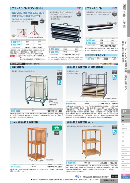 図画工作/美術ブラックライト/画板整理棚/用紙整理棚/画板・粘土板整理棚19絵画展示版画ブラックライトスタンド型階段など、段差のあるところにも設置できる三脚スタンドです。それぞれ別の方向に照明角度が変えられるブラックライト。消費電力20W×2段差での使用例型番8-268-01018-265-3306本体価格(税込価格)※コンセントは2個必要です。型式20W20W種別50Hz60Hz各¥56,000(¥61,600)●材質:スチール製●組み立て寸法:約800〜1100(直径)×約1140〜2300(高さ)mm●質量:約6.2kg●電源:100V●コード:1.95m中間スイッチ付き×2本●ブラックライト:20W×2本付き関連品ブラックライト用パネルボードを掲載しています。総合的な学習の時間P.22をご覧ください。Look道具・実習用具教材画板整理箱整理用教材(整理戸棚)置き場所を取らないコンパクト設計。●床面に置いて下から上を照射するタイプのブラックライトです。●それぞれ別の方向に照明角度が変えられます。小中消費電力20W×2ブラックライト床面・壁面や工作作品等に直付けできる、活用の幅の広いブラックライトです。小中消費電力20W型番8-265-33048-265-3305本体価格(税込価格)型式US型US型種別50Hz60Hz各¥43,500(¥47,850)●寸法:650(幅)×120(奥行)×325(高さ)mm●電源:100V●コード:1.95m中間スイッチ付き×2本●ブラックライト:20W×2本付き型番8-265-33028-265-3303本体価格(税込価格)型式SS型SS型種別50Hz60Hz各¥14,500(¥15,950)●寸法:610(幅)×50(奥行)×75(高さ)mm●電源:100V●コード:1.9m中間スイッチ付き●ブラックライト:20W×1本付き関連別売品型番8-265-4752交換ランプ型式20W本体価格¥5,500税込価格¥6,050目安内容等によって異なる小中画板・粘土板整理棚付用紙整理棚少量収納のときも倒れにくい仕様です。材質スチール製キャスター付きキャスター付き底面部は画板を傷めないクッションゴム仕様。※画板は別売型番型式本体価格税込価格8-265-3358●材質:角・丸スチール製●寸法:500(幅)×390(奥行)×680(高さ)mm●質量:8.5kg●メタリックグレー塗装●収納能力:5.5mmベニヤ画板(大・小とも)50枚●組立式●キャスター付き(ストッパー2個付き)¥28,800¥31,680GH型番型式本体価格税込価格※画板・粘土板は別売NH-6¥138,8008-268-0106¥152,680●材質:本体/スチール製・ハンマートングレー焼付塗装・組立済、用紙棚/ラワン合板(表面ポリエステル化粧板)・組立式●寸法:940(幅)×500(奥行)×1005(高さ)mm●質量:34.5kg●キャスター4個付き(ストッパー2個付き)●画板・粘土板収納可能数:すべてに画板(6mm厚)を収納する場合、143枚収納/すべてに粘土板(15mm厚)を収納する場合、56枚収納/画板(6mm厚)を左側スペースに40枚・粘土板(15mm厚)を残りのスペースに40枚収納●引き出し:大(四つ切り画用紙用、内幅546mm)、小(八つ切り画用紙用、内幅274mm)、各6段、1段の縦幅40mm画板・粘土板整理棚画板・粘土板整理棚組立式中間に収納物の倒れを防ぐ支柱が付いた軽量の整理棚です。キャスター付き彫刻彫塑陶芸木工金工紙工作各種加工整理用具色彩掛図鑑賞資料ソフトト小中▲カタログ有効期間中に価格・仕様が変更になる場合があります。あらかじめご了承ください。図画工作/美術マークの商品は運賃・荷造費を別途いただきます。型番型式本体価格税込価格TMS-2型8-263-6106●材質:スチール製、ブラウン焼付塗装仕上げ●寸法:720(幅)×515(奥行)×1160(高さ)mm●質量:24kg●棚板:スチール製2段、内寸480(高さ)mm×2段●上下段各100枚収納(画板厚6mm)●キャスター4個付き(ストッパー2個付き)●組立式※組立には六角レンチが必要です。¥75,580¥83,138キャスター付き470mmmm004※画板は別売60m0m型番型式本体価格税込価格2-510-2010¥52,800●材質:木製●寸法:400(幅)×600(奥行)×1135(高さ)mm●2段式●50〜60枚収納●キャスター付き¥48,000CW-20