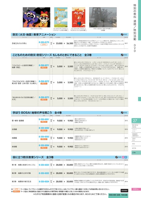 特別の教科道徳/特別活動DVD忍者玉丸の火の用心もしものときにできること「ぐらぐらどーん!自然災害編①」もしものときにできること「めらめらもくもく!生活安全編①」学ぼうBOSAI地球の声を聞こう台風編防災(火災・地震)教育アニメーションタイトル型番時間本体価格税込価格内容DVD制作年忍者玉丸の火の用心8-335-6175L不可13分¥33,000¥36,300幼児・小学校低学年向けの火災予防アニメーション教材です。忍者玉丸とくのニンが、師匠のじい丸や黒丸と一緒に、火災の恐ろしさを学んでいきます。子供たちに火災の恐ろしさを知ってもらい、火遊びが原因である火災をなくすことを目的とした作品です。文部科学省選定〉2017こどものための防災・防犯シリーズもしものときにできること全3巻タイトル型番時間本体価格税込価格内容DVD制作年「ぐらぐらどーん!自然災害編①/地震・津波」8-258-6271学校のみ32分¥5,000¥5,500「びゅうびゅうざざー!自然災害編②/風水害・雪害・土砂災害・火山噴火」8-258-6272学校のみ29分¥5,000¥5,500●もしものときにできることいえにいるときおおきなじしんがおこったら…/そとにいるときおおきなじしんがおこったら…/どうしてじしんがおきるの?/じしんがおさまったあとはどうする?/もしものときのために…●こどもを守るために地震による被害を避けるためには/こどもたちを守るために地震災害への備え/災害時の連絡方法/津波からの避難について/心のケアについて●もしものときのうた「ぐらぐらどーん!」2012●もしものときにできることおおあめがふってきたら…/かみなりのときにやってはいけないこと/たいふうがちかづいてきたら…/たいふうのときにきをつけること/かざんがふんかしたら…/ゆきがふったら…●こどもを守るために台風・大雨による被害を避けるためには/避難するときの注意点/雷による被害を避けるためには/雪による被害を避けるためには●もしものときのうた「びゅびゅうざざー!」2012「めらめらもくもく!生活安全編①/火災」8-258-6273学校のみ24分¥5,000¥5,500●もしものときにできることかじのもとはちかくにある/かじになってしまったら…/119ばんのかけかた/いろいろなひのけしかた●こどもを守るために火災を防ぐためには/こどもの防災教育について/火災が発生した場合には/火災への備え●もしものときのうた「めらめらもくもく!」2012学ぼうBOSAI地球の声を聞こう全4巻タイトル型番時間本体価格税込価格内容雷・竜巻・猛暑編台風編地震編津波編8-335-6351学校のみ8-335-6352学校のみ8-335-6353学校のみ8-335-6354学校のみ30分¥9,000¥9,900・雷から身を守ろう・竜巻の正体を知ろう・猛暑と熱中症20分¥9,000¥9,900・台風の進路を予測しよう・自分の町を知って台風に備えよう30分¥9,000¥9,900・地震波が教えてくれること・地震はなぜ起こるの?・地球は生きている20分¥9,000¥9,900・津波はどうして起きる?・津波から命を守るには?DVD制作年201520152015201527黒板・掲示板・板発表板スポットトライトト実験観察・観・体験用教材伝統と文化掛図紙芝居ソフト役に立つ防災教育シリーズ全3巻タイトル型番時間本体価格税込価格内容DVD小中制作年第1巻地震と津波のメカニズム8-335-632325分¥28,000¥30,800地震と津波のメカニズムに関する知識を深めます。地震や津波のメカニズムをわかりやすくCGなどを使って学びます。2014第2巻地震のときの行動8-335-632225分¥28,000¥30,800震災においての対処行動を学びます。緊急地震速報のことや、色々な場所での地震から身を守る方法、安全な避難場所と危険な避難場所などを学びます。2014第3巻地震後の被災生活8-335-632421分¥28,000¥30,800地震後の避難生活で必要なことなどを学びます。応急手当や救命救助、高齢者や幼児への対応、子供にもできる活動(炊き出し、運搬、給水、清掃など)を学びます。2014●●L不可学校のみマーク品は、ライブラリーには販売できませんのでご了承ください。なお、ライブラリー購入価格につきましては別途お問い合わせください。マーク品は、学校教育法に指定された施設および専門学校・保育園での購入に対してのみの販売となります。999小▲カタログ有効期間中に価格・仕様が変更になる場合があります。あらかじめご了承ください。特別の教科道徳/特別活動