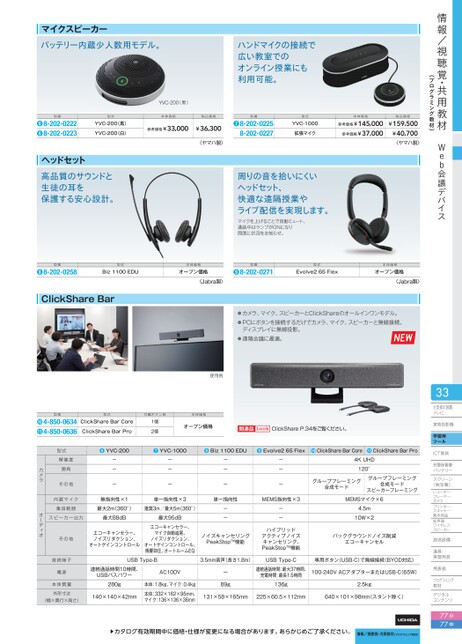 情報/視聴覚・共用教材Web会議デバイス(プログラミング教材)33大型提示装置・型提示装置・テレビビ実物投影機学習用ツールICT家具T家具充電保管庫・・バッテリーッテリースクリーンクリーン(映写幕)レコーダー・レコーダー・プレーヤー・プレーヤー・カメララプリンター・プリンター・スキャナー・スキャナー・製本用品製本用品拡声器・拡声器・ワイヤレスヤススピーカースピーカー放送設備道具・実習用具発表板プログラミング教材デジタルコンテンツテンツ77小77中●カメラ、マイク、スピーカーとClickShareのオールインワンモデル。●PCにボタンを接続するだけでカメラ、マイク、スピーカーと無線接続。ディスプレイに無線投影。●遠隔会議に最適。使用例本体価格税込価格型番参考価格¥33,000¥36,300〈ヤマハ製〉❼8-202-02258-202-0227型式YVC-1000拡張マイク本体価格参考価格¥145,000参考価格¥37,000税込価格¥159,500¥40,700〈ヤマハ製〉型式YVC-200(黒)YVC-200(白)型番8-202-02228-202-0223❻❻YVC-200(黒)マイクスピーカーバッテリー内蔵少人数用モデル。ハンドマイクの接続で広い教室でのオンライン授業にも利用可能。ヘッドセット高品質のサウンドと生徒の耳を保護する安心設計。周りの音を拾いにくいヘッドセット、快適な遠隔授業やライブ配信を実現します。マイクを上げることで自動ミュート、通話中はランプがONになり周囲に状況をお知らせ。型番❽8-202-0258型式Biz1100EDU本体価格オープン価格型番❾8-202-0271型式Evolve265Flex〈Jabra製〉本体価格オープン価格〈Jabra製〉ClickShareBar型式付属ボタン数本体価格ClickShareBarCoreClickShareBarPro1個2個オープン価格関連品LookClickShareP.34をご覧ください。型番4-850-06344-850-0636❿⓫❻YVC-200❼YVC-1000❽Biz1100EDU❾Evolve265Flex❿ClickShareBarCore⓫ClickShareBarPro------------4KUHD120°グループフレーミング合成モードグループフレーミング合成モードスピーカーフレーミング無指向性×1単一指向性×3単一指向性MEMS指向性×3MEMSマイク×6最大2m(360°)推奨3m/最大5m(360°)スピーカー出力最大88dB最大95dBエコーキャンセラー、ノイズリダクション、オートゲインコントロールエコーキャンセラー、マイク自動追尾、ノイズリダクション、オートゲインコントロール、残響抑圧、オートルームEQ--ノイズキャンセリングPeakStopTM機能--ハイブリッドアクティブノイズキャンセリング、PeakStopTM機能4.5m10W×2バックグラウンドノイズ削減エコーキャンセルUSBType-B3.5mm音声(長さ1.8m)USBType-C専用ボタン(USB-C)で無線接続(BYOD対応)連続通話時間10時間、USBバスパワーAC100V280g140×140×42mm本体:1.8kg、マイク:0.4kg本体:332×162×95mm、マイク:136×136×36mmー89g連続通話時間:最大37時間、充電時間:最長1.5時間136g100-240VACアダプターまたはUSB-C(65W)2.5kg131×58×165mm225×60.5×112mm640×101×98mm(スタンド除く)▲カタログ有効期間中に価格・仕様が変更になる場合があります。あらかじめご了承ください。情報/視聴覚・共用教材(プログラミング教材)型式解像度画角その他内蔵マイク集音範囲その他接続端子電源本体質量外形寸法カメラオーディオ(幅×奥行×高さ)