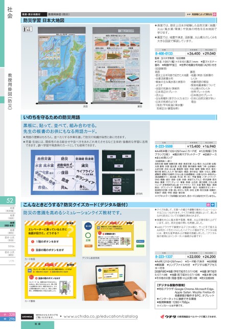 発表・表示用教材教授用掛図(防災)防災学習日本大地図目安内容等によって異なる小●表面では、歴史上日本が経験した自然災害(地震/火山/風水害/雪害)や気候の特色を日本地図で学びます。●裏面では、地震や津波、活断層、火山噴火のしくみを大きな図説で解説しています。型番8-400-0133本体価格税込価格¥26,400¥29,040表面裏面いのちを守るための防災用語黒板に、貼って、並べて、組み合わせる。先生の板書のお供にもなる用語カード。●用語の理解はもちろん、並べたりする作業を通して防災の知識が自然と身に付きます。●児童・生徒には、関係性のある組合せや並べ方をあれこれ考えさせるなど主体的・協働的な学習に活用できます。調べ学習や発表用のカードとしても使用できます。使用例使用例こんなときどうする?防災クイズカード〔デジタル版付〕防災の意識を高めるシミュレーションクイズ教材です。カード表面デジタル版使用例監修:玉川大学教授/松田博康●寸法:1057(幅)×1510(高さ)mm●面ファスナー留め●両面PP加工●世界の地震分布地図(A2判)付き〈収録事項〉表面・歴史上日本列島で起きた大地震・主要活断層分布・戦後の主な風水害と被害のようす・全国の気象台/測候所・日本周辺のプレート・活火山・主な発電所(原子力・火力・水力)・日本の気候のようす(海流/平均気温と降水量/気候区分/豪雪地帯)裏面・地震/津波/活断層のしくみ・地震用語の解説・緊急地震速報について・火山噴火のしくみ・世界プレート分布・日本周辺のプレート・日本に自然災害が多い理由型番本体価格税込価格¥16,940¥15,4008-223-5508●A4判半裁(105×297mm)カード式●122枚組(うちブランク2枚)●掲示用マグネットテープ●収納ケース●まとめ用リング〈収録用語(一部)〉自然災害・地震・地震災害・津波・津波災害・火山・噴火・火山災害・台風・大雨豪雨・水害・風水害・大雪・雪害・集中豪雨・梅雨つゆ・土砂崩れ・土砂災害・洪水はん濫・暴風雪・地形・気候・被害・情報・防災・被災・被災者被災した人々・取り組み・標語・身の安全・堤防・ひなん避難・避難所避難する場所(ひなん地広域避難地)・公園・なだれ・砂防ダム・津波避難タワー・放水路・市(区・町・村)・予報警報・ハザードマップ・SNS・標識・減災・自助・公助・共助・津波てんでんこ・防災訓練・防災用品・震度・マグニチュード・竜巻・高潮・土石流・濱口梧陵・ひなん用リュック非常用持ち出し袋ライフラインガス水道電気電話・救助救出・ボランティア・防潮堤・避難訓練・協力・地震防災センター・地域防災計画・災害・地いきの人住民・会社企業・防災会議・地震計・気象庁・病院・学校・施設・被災地など※マグネットテープは同梱になります。各カードには貼付されていません。小中●クイズを通して、災害への備えや避難行動をシミュレーションすることにつながります。クイズの解答と解説によって、楽しみながら防災についての理解を深められます。●地震を中心に風水害や落雷、雪害、火山災害を取り上げています。また、防災全般の問いも用意しました。●webブラウザで展開するデジタル版と、サッと手で扱えるA4判カードをセットにしたハイブリッド教材です。デジタル版には、便利な音声読み上げ機能を搭載しました。(デジタル版の使用にはインターネット接続が必要です)型番本体価格税込価格¥22,0008-223-1337●A4判(210×297mm)●カード紙・穴あき●60枚組●解説書●リングファイル付き●デジタル版アクセスキー付き¥24,200【収録内容】●地震〈学校で起きたら?〉10枚●地震〈家で起きたら?〉14枚●地震〈町で起きたら?〉10枚●風水害12枚●その他の災害(落雷・雪害・火山災害)6枚●防災全般8枚[デジタル版動作環境]●対応ブラウザ:GoogleChrome、MicrosoftEdge、AppleSafari、MozillaFirefoxの各最新版が動作するPC、タブレット●インターネットに接続できる環境●推奨解像度:1280×768px※インストールは不要です。カード裏面小中328296情報/視聴覚(ICT教具)社会WEBからもカタログをご覧いただけます。www.uchida.co.jp/education/catalogの教育機器はベルマークで購入できます。社会教授用掛図(防災)52地理(地球儀)(地理(地図)()地理(掛図・食育)地理(模型)歴史・公民歴史・(掛図)(SDGsSDG歴史・公民歴史・(模型)(ソフトソ