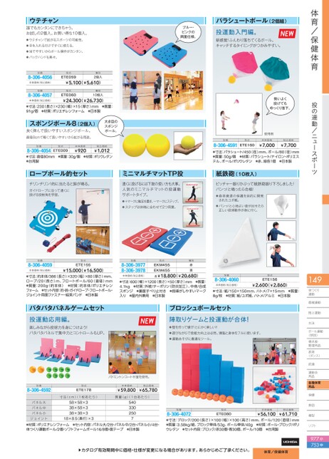 体育/保健体育投の連動/ニュースポーツ149体つくりり運動器械運動陸上運動水泳ボール運動(球技)得点板・整理用品表現(ダンス)ン)武道運動会用品各種体育用品保健掛図模型ソフトト977小753中ウテチャン誰でもカンタンにできちゃう。お試しの2個入。お買い得な10個入。●ウテチャンで拡がるスポーツの可能性。●手を入れるだけですぐに使える。●当てやすいからボール操作がカンタン。●バックハンドも楽々。ブルー・ピンクの両面仕様。パラシュートボール(2個組)投運動入門編。新感覚!ふんわり落ちてくるボール。キャッチするタイミングがつかみやすい。型番8-306-4056本体価格(税込価格)型番8-306-4057本体価格(税込価格)型式ETE059種別2個入¥5,100(¥5,610)型式種別ETE060¥24,300(¥26,730)10個入●寸法:230(長さ)×230(幅)×15(厚さ)mm91g/個●材質:ポリエチレンフォーム●日本製●質量:スポンジボール8(2個入)良く弾んで扱いやすいスポンジボール。直径8cmで軽くて扱いやすいから拡がる用途。大き目のスポンジボール。型番型式本体価格ETE009¥920税込価格¥1,012●質量:30g/個●材質:ポリウレタン8-306-4054●寸法:直径80mm●台湾製勢いよく投げてもゆっくり落下。型番型式本体価格税込価格使用例ETE160¥7,0008-306-4591●寸法:パラシュート/450(径)mm、ボール/80(径)mm●質量:50g/個●材質:パラシュート/ナイロン・ポリエステル、ボール/ポリウレタン●赤、緑各1個●日本製¥7,700ロープボール的セットチリンチリン!的に当たると鈴が鳴る。ガイドロープに沿って遠くに投げる投射角を学習。ミニマルチマットTP投遠くに投げるには下肢の使い方も大事。人気のミニマルチマットの投運動サポートタイプ。●+マークに軸足を置き、ーマークにステップ。●ステップは体格に合わせて2つ用意。紙鉄砲(10枚入)ピッチャー振りかぶって紙鉄砲振り下ろしました!パンっ!と鳴ったら合格!●森林資源の保護を目的に開発されたユポ紙。●パンっ!と心地よい音が出せたら正しい投球動作が身に付く。型番8-306-4059本体価格(税込価格)型式ETE155¥15,000(¥16,500)●寸法:的本体/386(長さ)×320(幅)×80(厚さ)mm、ロープ/20(長さ)m、フロートボール/60(直径)mm●質量:200g(的本体)●材質:的本体/ポリエチレンフォーム●セット内容:的・鈴・ガイドロープ・フロートボール・ジョイント用面ファスナー・結束バンド●日本製型番8-306-39778-306-3978本体価格(税込価格)型式種別EKM455EKM455各¥18,800(¥20,680)赤青●質量:●寸法:600(幅)×1200(長さ)×50(厚さ)mm●材質:外被/ターポリン(防炎加工)、中身/合成4.1kgスポンジ●裏面すべり止付き●指導がしやすいマーク入り●屋内外兼用●日本製型番8-306-4060本体価格(税込価格)型式ETE156¥2,600(¥2,860)●寸法:紙/150×150mm、ハトメ/7×15mm8g/枚●材質:紙/ユポ紙、ハトメ/アルミ●日本製●質量:パタパタパネルゲームセット投運動応用編。楽しみながら投球力を身につけよう!パタパタパネルで集中力とコントロールもUP。ブロッシュボールセット陣取りゲームと投運動が合体!●壁を作って壊す!とにかく楽しい!!●遊びながらで投能力向上は必然。頭脳と身体をフルに使います。●運動あそびに最適なツール。バドミントンコート半面を使用。型番8-306-4592型式ETE178本体価格¥59,800税込価格¥65,780寸法(cm)(1枚あたり)質量(g)(1台あたり)パネル大パネル中パネル小ジョイント58×58×338×58×338×38×318×8.5(奥行)×35403302507●材質:ポリエチレンフォーム●セット内容:パネル大/2台・パネル中/2台・パネル小/4台・体つくり運動ボール/2個・ソフトフォームボール16/8個・面テープ●日本製型番型式本体価格税込価格8-306-4072¥61,710●寸法:ブロック/200(長さ)×100(幅)×100(高さ)mm、ボール/120(直径)mm●質量:3.58kg/組、ブロック単体/53g、ボール単体/40g●材質:ボール・ブロック/ポリウレタン●セット内容:ブロック/赤30個・青30個、ボール/10個●台湾製¥56,100ETE080▲カタログ有効期間中に価格・仕様が変更になる場合があります。あらかじめご了承ください。体育/保健体育