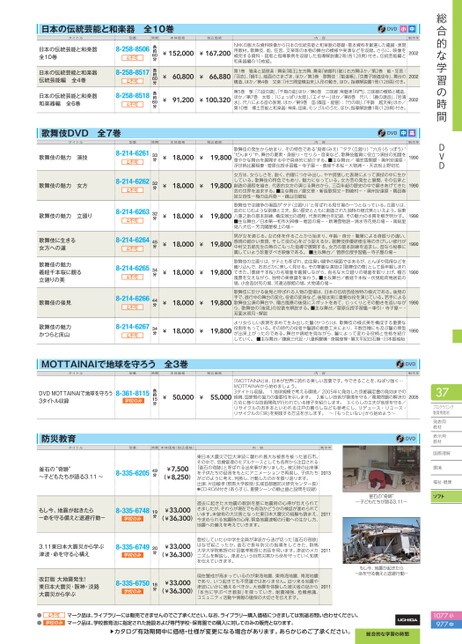 総合的な学習の時間DVD37プログラミング教育用教材材発表用教材表示用教材国際理解環境福祉・健康康ソフトDVD小中制作年2002¥152,000¥167,200NHKの膨大な資料映像から日本の伝統芸能と和楽器の基礎・基本資料を厳選した鑑賞・表現用教材。歌舞伎、能、狂言、文楽等の本物の舞台の模様や実演などを収録。さらに、映像を補完する資料・図版と指導事例を収録した指導解説書2冊(各128頁)付き。伝統芸能編と和楽器編の10枚組。¥60,800¥66,880¥91,200¥100,320第1巻雅楽と琵琶楽:舞楽「陵王」左方舞、舞楽「納曽利(破)」右方舞ほか/第2巻能・狂言:「羽衣」、蝸牛」、能面のさまざま、ほか/第3巻歌舞伎:「勧進帳」、京鹿子娘道成寺」、舞台の構造、ほか/第4巻文楽:「卅三間堂棟由来」人形の動き、ほか。指導解説書1冊(128頁)付き。2002第5巻筝:「六段の調」、千鳥の曲」ほか/第6巻三味線:常磐津「将門」、三味線の種類と構造、ほか/第7巻太鼓:「じょっぱり太鼓」、エイサー」ほか/第8巻尺八:「鹿の遠音」、岩清水」、尺八による音の表現、ほか/第9巻笛(篠笛・能管):「竹の唄」、平調越天楽」ほか/第10巻郷土芸能と和楽器:神楽、田楽、モンゴルのうた、ほか。指導解説書1冊(128頁)付き。2002DVD中高各約60分各約60分各約60分8-258-8506L不可8-258-8517L不可8-258-8518L不可日本の伝統芸能と和楽器全10巻日本の伝統芸能と和楽器伝統芸能編全4巻日本の伝統芸能と和楽器和楽器編全6巻歌舞伎DVD全7巻日本の伝統芸能と和楽器全10巻タイトル型番時間本体価格税込価格内容制作年1990タイトル型番時間本体価格税込価格内容歌舞伎の魅力演技歌舞伎の魅力女方歌舞伎の魅力立廻り歌舞伎に生きる女方への道歌舞伎の魅力義経千本桜に観る立廻りの美歌舞伎の後見歌舞伎の魅力かつらと床山8-214-6261L不可8-214-6262L不可8-214-6263L不可8-214-6264L不可8-214-6265L不可8-214-6266L不可8-214-6267L不可33分¥18,000¥19,800歌舞伎の発生から始まり、その特色である"見得(みえ)""タテ(立廻り)""六方(ろっぽう)""だんまり"や、舞台の要素・身振り・せりふ・音楽など、歌舞伎鑑賞に役立つ演技の知識を華やかな舞台を展開する中で具体的に紹介する。■主な舞台/積恋雪関扉・奥州安達原・浮世柄比翼稲妻・菅原伝授手習鑑-寺子屋-・義経千本桜-大物浦-・天衣紛上野初花32分¥18,000¥19,80032分¥18,000¥19,80045分¥18,000¥19,80034分¥18,000¥19,80044分¥18,000¥19,80034分¥18,000¥19,800女方は、女らしさを、鋭く、的確につかみ出し、やや誇張した表現によって演技の中に生かしている。歌舞伎の特色でもあり、魅力になっている。女方芸の発生と展開、その伝承と創造の過程を描き、代表的女方の演じる舞台から、三百年超の歴史の中で磨きあげてきた芸の世界を追求する。■主な舞台/廓文章・新版歌祭文-野崎村-・奥州安達原・隅田春妓女容性-梅の由兵衛-・鏡山旧錦絵歌舞伎では闘争の場面が"タテ(立廻り)"と呼ばれる見せ場の一つとなっている。立廻りは、血のにじむような訓練と工夫、長い歴史とともに創造された独特の様式美といえよう。坂東八重之助の基本訓練、構成演出の過程、代表的舞台を記録、その魅力の本質を解き明かす。■主な舞台/日本第一和布刈神事-竜宮の場-・新薄雪物語-清水寺花見の場-・南総里見八犬伝-芳流閣屋根上の場-19901990男が女を演じる。女の体を作ることから始まり、年齢・身分・職業による身振りの違い、感情の細かい表現、そして役の心をどう捉えるか。歌舞伎俳優研修生等のきびしい修行が中村又五郎先生の熱のこもった指導で展開する。女方の基本訓練を追求し、昔なら秘事に属していよう珍重すべき映像である。■主な舞台/菅原伝授手習鑑-寺子屋の場-1990歌舞伎の立廻りは、タテとも呼ばれ、血生臭い闘争の場面ではあるが、とんぼや見得などを織り込んで、おおどかに美しく見せる。その華麗な演技は「歌舞伎の華」として長年親しまれてきた。義経千本桜」の名場面を鑑賞しながら、有名な大立廻りの場面を取り上げ、稽古風景を交えながら、独特の美意識を味わう。■主な舞台/義経千本桜-伏見稲荷鳥居前の場、小金吾討死の場、河連法眼館の場、大物浦の場-歌舞伎に於ける後見と呼ばれる人物の登場は、日本の伝統芸能独特の様式である。後見の手で、進行中の舞台の変化、役者の変身など、後見は実に重要な役を演じている。若手による歌舞伎公演の舞台や、稽古風景の後見にスポットをあて、じっくりとその動きを追いながら、歌舞伎の「後見」の役割を解説する。■主な舞台/菅原伝授手習鑑-車引・寺子屋-・双面水照月・解脱19901990より女らしい表現を求めて生み出した鬘(かつら)は、歌舞伎の様式美を構成する重要な役割をもっている。その時代の役者や鬘師の創意工夫により、千数百種にも及ぶ鬘の原型が出来上がったのである。舞台や錦絵を見ながら、鬘によって変わる役柄と性格を紹介していく。■主な舞台/鎌倉三代記・八重桐廓噺・身替座禅・碁太平記白石噺・日本振袖始1990MOTTAINAIで地球を守ろう全3巻タイトル型番時間本体価格税込価格内容DVD制作年2005「