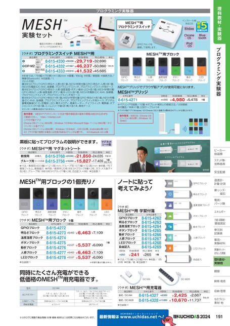 理科教材・実験器プログラミング実験器ビーカー・ビーカー・容器類器スタンド類・加熱器具加熱器具安全配慮安全配慮温度計・温度計・計量・計測計量・計測鏡・レンズ・磁石電気・気・パーツ類ーツ類エネルギーろ紙・試験紙・環境測定単元別単元別試薬表薬薬品・品・実験材料実験材料実験キット・おもしろ実験理科教材・実験器観察察飼育・栽培飼育・栽培収納・管理ものづくり・素材他材他191使用例GPIOブロック明るさブロック温度湿度ブロックボタンブロック動きブロック人感ブロックLEDブロック自由記入GPIOブロック明るさブロック温度湿度ブロックボタンブロック動きブロック人感ブロックLEDブロック[ウチダ]MESHTM用ブロック1個お申込番号M価税抜税抜価格税込価格単位商品種別GPIOブロック明るさブロック温度湿度ブロックボタンブロック動きブロック人感ブロックLEDブロック●包装数:18-615-42728-615-42738-615-42748-615-42758-615-42768-615-42778-615-4278¥6,463¥6,463¥7,1091個¥5,537¥5,537¥6,090¥6,463¥5,537¥6,463¥7,109¥5,537¥6,090※学習付箋は付属しません。同時にたくさん充電ができる低価格のMESHTM用充電器です。型式DC-M4DC-M28ACアダプターUSBケーブル同時充電数1ポート、出力/5V1A30(幅)×58(奥)×22(高)mm7ポート、出力/5V3.5A(合計7ポート)、23(幅)×144(奥)×23(高)mm、23(幅)×144(奥)×23(高)mm、専用ACアダプター付属同時4出力ケーブル1本付属同時4出力ケーブル7本付属4ブロック28ブロック[ウチダ]MESHTM用学習付箋商品種別お申込番号8-615-4262GPIOブロック8-615-4263明るさブロック温度湿度ブロック8-615-42648-615-4265ボタンブロック8-615-4266動きブロック8-615-4267人感ブロック8-615-4268LEDブロック8-615-4269自由記入M価税抜¥250税抜価格¥241税込価格¥265単位1冊●寸法/75(横)×20(縦)mm●枚数/1冊20枚●材質/紙●包装数:1DC-M4DC-M28[ウチダ]MESHTM用充電器商品種別型式/DC-M4型式/DC-M28●包装数:1お申込番号M価税抜¥2,5008-615-43278-615-4328¥11,000税抜価格¥2,425税込価格¥2,667¥10,670¥11,737単位1セット※カタログに掲載の商品情報(仕様・価格・税率など)は変更になる場合がございます。最新情報はUCHIDASww.uchidas.netwへ!インストール版対応OSWindowsChromeOSiPodOSBluetooth〈セット内容〉●本体寸法/79(幅)×79(奥)×41(高)mm●質量/約60g●材質/樹脂製●接続方法/無線(Bluetooth)●包装数/1❶:MESHブロック:GPIO・明るさ・人感×各1個、MESH学習付箋:GPIO・明るさ・人感×各1個、MESH充電器(DC-M4)、指導書、プログラミングスイッチ、プログラミングスイッチ用ケース❷:MESHブロック:GPIO・明るさ・人感・温度湿度・ボタン・動き・LED×各1個、MESH学習付箋:GPIO・明るさ・人感・温度湿度・ボタン・動き・LED×各1個、MESH充電器(DC-M4)、指導書、プログラミングスイッチ、プログラミングスイッチ用ケース❸:MESHブロック:GPIO・明るさ×各1個、MESH学習付箋:GPIO・明るさ×各1個、MESH充電器(DC-M4)、指導書、プログラミングスイッチ、プログラミングスイッチ用ケース、デジタル蓄電実験器DC-D、豆電球、LED、電子メロディ、風車モーター、ナイフスイッチ、電熱線、オプションスイッチ×各1個、ミノムシリード線(赤・黒)×各1本、専用ケース※インストール費用は含まれておりません。GPIOブロック明るさブロック人感ブロック温度湿度ブロックボタンブロック動きブロックLEDブロックMESHTMブリッジでブラウザ版アプリが使用可能になります。MESHTMブリッジお申込番号8-615-4271M価税抜¥4,980税抜価格¥4,980税込価格¥5,478単位1個●ペアリング可能数/10個●タブレット端末との接続方法/USB接続●付属品/本体×1個、USBケーブル×1本※ブラウザ版アプリ(Windows101ChromeOS)に接続する際MESHブリッジが必要となります。GPIOブロックを接続して使用します。MESHTM用ブロック単位1セットお申込番号M価税抜税抜価格税込価格ブロック3個付ブロック7個付電気の利用セット8-615-4330¥30,639¥29,719¥32,6908-615-4332¥47,667¥46,237¥50,8608-615-4333¥42,816¥41,532¥45,685DP-M2●●●商品種別[ウチダ]プログラミングスイッチMESHTM用MESH実験セットTM電気の利用セット実験例(タブレットPCは別売です。)プログラミング実験器MESHTM用プログラミングスイッチ動作環境/MESHアプリのインストール方法や動作確認済み端末の情報はMESH公式HPをご確認ください。https://meshprj.com〈ブラウザ版アプリ〉ChromeOS(バージョン90以降)、Windows1064bit/MicrosoftEdgeバージョン89以降)(※1)動作環境/対応OS:ChromeOS(バージョン90以降)、Windows10(64bit)〈インストール版アプリ〉ChromeOSバージョン89以降)、Windows10(64bit)、iOS12以降、Android6以降(※2)※1ブラウザ版で使用する場合には別売のMESHブリッジが必要です。※2Bluetooth4.0以降黒板に貼ってプログラムの説明ができます。[ウチダ]MESHTM用マグネットシートマグネットシート製商品種別お申込番号M価税抜税抜価格税込価格20枚入8-615-3768¥23,000¥21,850¥24,035教授用グループ用シートのみ8-615-3756¥16,600¥15,827¥17,409(8セット入)●寸法/教授用:400(幅)×121(高)mm、グループ用:107(幅)×32高)mm●材質/PET樹脂フィルム、樹脂磁石●内容/教授用:20枚(MESHブロック8種×2枚、オス・メス端子×各2枚)、グループ用:18枚(MESHブロ
