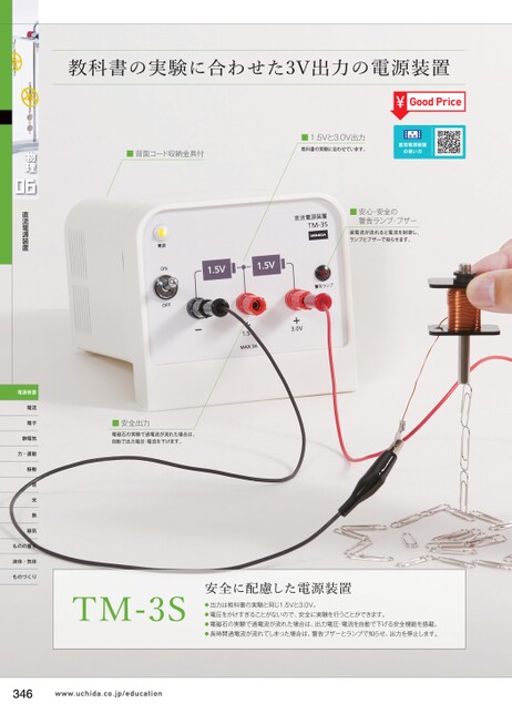 ■背面コード収納金具付■1.5Vと3.0V出力教科書の実験に合わせています。直流電源装置の使い方■安心・安全の警告ランプ・ブザー過電流が流れると電流を制御し、ランプとブザーで知らせます。■安全出力電磁石の実験で過電流が流れた場合は、自動で出力電圧・電流を下げます。●出力は教科書の実験と同じ1.5Vと3.0V。●電圧をかけすぎることがないので、安全に実験を行うことができます。●電磁石の実験で過電流が流れた場合は、出力電圧・電流を自動で下げる安全機能を搭載。●長時間過電流が流れてしまった場合は、警告ブザーとランプで知らせ、出力を停止します。物理直流電源装置電源装置電流電子静電気力・運動振動音光熱磁気ものの重さ液体・気体ものづくり346www.uchida.co.jp/education