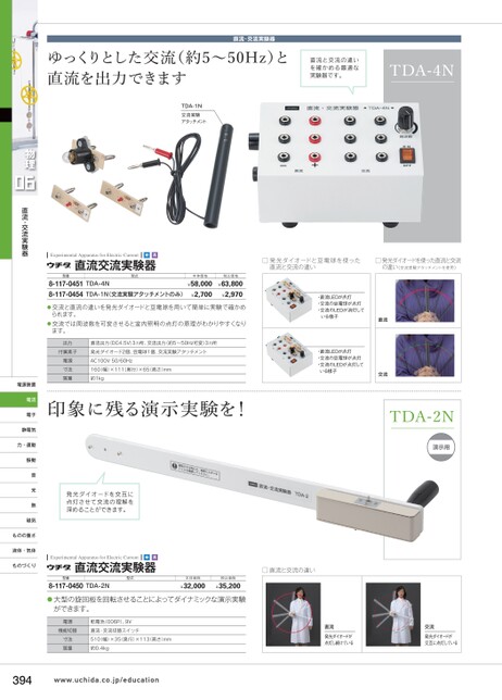 直流・交流実験器直流と交流の違いを確かめる最適な実験器です。TDA-1N交流実験アタッチメント□発光ダイオードと豆電球を使った直流と交流の違い□発光ダイオードを使った直流と交流の違い(交流実験アタッチメントを使用)・直流LEDが点灯・交流の豆電球が点灯・交流のLEDが消灯している様子・直流LEDが点灯・交流の豆電球が点灯・交流のLEDが点灯している様子直流交流演示用□直流と交流の違い直流発光ダイオードが点灯し続けている交流発光ダイオードが交互に点灯しているExperimentalApparatusforElectricCurrent中高直流交流実験器型番8-117-04518-117-0454型式TDA-4NTDA-1N(交流実験アタッチメントのみ)本体価格税込価格¥58,000¥2,700¥63,800¥2,970●交流と直流の違いを発光ダイオードと豆電球を用いて簡単に実験で確かめられます。●交流では周波数を可変させると室内照明の点灯の原理がわかりやすくなります。出力直流出力(DC4.5V)3ヵ所、交流出力(約5〜50Hz可変)3ヵ所付属素子発光ダイオード2個、豆電球1個、交流実験アタッチメント電源寸法質量AC100V50/60Hz160(幅)×111(奥行)×65(高さ)mm約1kg発光ダイオードを交互に点灯させて交流の理解を深めることができます。ExperimentalApparatusforElectricCurrent中高直流交流実験器物理直流・交流実験器電源装置電流電子静電気力・運動振動音光熱磁気ものの重さ液体・気体ものづくり型番型式8-117-0450TDA-2N本体価格¥32,000税込価格¥35,200●大型の旋回板を回転させることによってダイナミックな演示実験ができます。電源乾電池(006P)、9V機能切替直流・交流切替スイッチ寸法質量510(幅)×35(奥行)×113(高さ)mm約0.4kg394www.uchida.co.jp/education