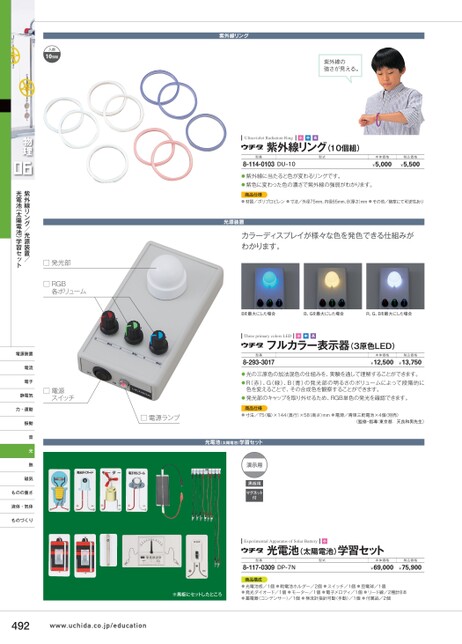 入数10個組紫外線リング紫外線の強さが見える。UltravioletRadiationRing小中高紫外線リング(10個組)型番8-114-0103DU-10型式本体価格¥5,000税込価格¥5,500●紫外線に当たると色が変わるリングです。●紫色に変わった色の濃さで紫外線の強弱がわかります。商品仕様●材質/ポリプロピレン●寸法/外径75mm、内径65mm、8(厚さ)mm●その他/暗室にて可逆性あり光源装置カラーディスプレイが様々な色を発色できる仕組みがわかります。Bを最大にした場合B、Gを最大にした場合R、G、Bを最大にした場合ThreeprimarycolorsLED小中高フルカラー表示器(3原色LED)型番8-293-3017本体価格税込価格¥12,500¥13,750●光の三原色の加法混色の仕組みを、実験を通して理解することができます。●R(赤)、G(緑)、B(青)の発光部の明るさのボリュームによって段階的に色を変えることで、その合成色を観察することができます。●発光部のキャップを取り外せるため、RGB単色の発光を確認できます。商品仕様□電源ランプ●寸法/75(幅)×144(奥行)×58(高さ)mm●電源/青単三乾電池×4個(別売)(監修・指導:東京都天良和男先生)光電池(太陽電池)学習セット演示用黒板用マグネット付□発光部□RGB各ボリューム□電源スイッチ物理紫外線リング/光源装置/光電池(太陽電池)学習セット電源装置電流電子静電気力・運動振動音光熱磁気ものの重さ液体・気体ものづくりExperimentalApparatusofSolarBattery小光電池(太陽電池)学習セット型番8-117-0309DP-7N型式本体価格税込価格¥69,000¥75,900商品構成※黒板にセットしたところ●光電池板/1個●乾電池ホルダー/2個●スイッチ/1個●豆電球/1個●発光ダイオード/1個●モーター/1個●電子メロディ/1個●リード線/2種計8本●蓄電器(コンデンサー)/1個●検流計指針可動(手動)/1個●付属品/2個492www.uchida.co.jp/education