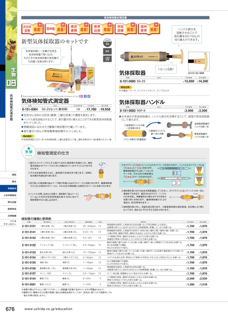 気体検知管式測定器気体検知管に一定量の空気を気体採取器で取り込み、そのときの気体検知管の変色量の%目盛りを読み取ります。気体検知管3種酸素二酸化炭素ハンドル部分を回転させることで吸引量を50/10mLの切り替えができます。MeasuringSetforOxygen&CarbonDioxideContentsofAir気体検知管式測定器小中高型番8-151-0084型式気体検知管本体価格税込価格50-2Sセット(教材用)3種¥17,780¥19,558●空気中に含まれる気体(酸素・二酸化炭素)の濃度を測定します。●ハンドル部を回転させることで、吸引量を切り替えることができる新型気体採取器をセットしました。●実験項目に合わせた3種類の検知管が付属しています。●吸引量が10mLの新型酸素検知管をセットしました。商品構成●気体採取器50-2S×1本●気体検知管/二酸化炭素2EL×1箱、二酸化炭素2EH×1箱、酸素31E-2×1箱シリンダ部分(共通部品)気体採取器型番8-151-008050-2S商品仕様くるっと回転!型式吸引切り替え機構本体価格税込価格¥13,000¥14,300●付属品/ケース、メンテナンスキット、チップホルダ気体採取器ハンドル型番8-151-008350P-9型式本体価格¥3,000税込価格¥3,300●お手持ちの気体採取器は、ハンドル部分を交換することで、新型の気体採取器として使えます。①従来型のハンドル部一式を取り外す②新型のハンドル部一式に交換従来型採取器のハンドル部一式新型採取器のハンドル部一式実験Column検知管測定の仕方①図のようにチップホルダ上部のくぼみに検知管の先端を入れ、検知管を回転させてチップホルダに内蔵されているヤスリによりきずを付けます。②そのまま検知管をたおし、検知管の先端を折り取ります。同様に反対側の先端も折り取ります。③折り取った検知管のマーク側の先端には必すカバーゴムを取り付けます。酸素検知管31E-2には青色のカバーゴム、それ以外の検知管には桃色のカバーゴムを取り付けます。④ハンドルが押し込まれた状態で、検知管の「マーク」」の矢印が気体採取器を指す方向に向けてと「検知管取付口に差し込みます。⑤ガイドマーク(赤線)とハンドルのガイドマークを合わせます。ハンドルのガイドマークには「50▲▲」と「10▲」があります。酸素検知管31E-2は「10▲」のマークを、それ以外の検知管は「50▲▲」のマークを合わせます。⑥検知管を取り付ける向きを再度確認してください。ガイドラインに沿ってハンドルを一気に最後まで引きます。固定されますので、ハンドルから手を放し、実験箇所から動かさずそのままの状態で約1分待ちます。(酸素検知管31E-2の場合は、約30秒待ちます。)⑦検知管を取り外し、目盛を読み取ります。※酸素検知管は測定直後、反応熱により熱くなっており、触れるとやけどをする恐れがあります。生物気体検知管式測定器模型標本実験器具人体学習器具野外活動飼育用具汎用機器バイオテクノロジー検知管の種類と使用例型番検知管No.測定対象気体濃度範囲本数使用例2-151-01512-151-01412-151-01422-151-01522-151-01532-151-01542-151-01552-151-01562-151-01572-151-0144一酸化炭素1EL一酸化炭素CO25〜400ppm10二酸化炭素2EL二酸化炭素CO20.03〜1%二酸化炭素2EH二酸化炭素CO20.5〜8%1010アンモニア3ELアンモニアNH32.5〜60ppm10硫化水素4EL硫化水素H2S10〜120ppm10二酸化イオウ5EC二酸化イオウSO22〜40ppm塩素8EL塩素Cl21〜16ppm窒素酸化物11EL窒素酸化物NOX1〜20ppmオゾン18ELオゾンO30.5〜10ppm・燃焼器具を使用した教室内の空気を調べる(不完全燃焼による発生)。・自動車の排ガスに含まれるCOがどの程度環境に影響しているかを調べる。・燃焼器具を使用した教室内の空気や、空気の良い場所と悪い場所の違いを調べる。・土壌の呼吸、細胞の呼吸、植物の光合成によるCO2の変化を調べる。・人や動物の呼吸、植物の光合成によるCO2の変化を調べる。・有機物が燃焼(化学反応)したときのCO2の変化を調べる。・動物の飼育小屋や公衆トイレなど臭いの強い場所で、臭いの原因の1つであるNH3を調べる。・NH3生成実験での確認。・NH3の化学反応での変化。・動物の飼育小屋や公衆トイレなど臭いの強い場所や、火山地帯や温泉場などでの臭いの原因の1つであるH2Sを調べる。・イオウ分を含む石炭、原油などが燃焼(化学反応)するとSO2が発生することを調べる。・Cl2の捕集実験での確認。・Cl2の化学反応での変化。・燃焼器具を使用した教室内の空気を調べる。・自動車の排ガスに含まれるNOXがどの程度環境に影響しているかを調べる。・オゾン発生器、殺菌器などより発生するO3を調べる。・人や動物の呼吸、植物の光合成によるO2の変化を調べる。・燃焼(化学反応)でのO2の変化を調べる。・人や動物の呼吸、植物の光合成によるO2の変化を調べる。・燃焼(化学反応)でのO2の変化を調べる。本体価格税込価格¥1,700¥1,870¥1,700¥1,870¥1,700¥1,870¥1,700¥1,870¥1,700¥1,700¥1,700¥1,700¥1,700¥2,300¥1,870¥1,870¥1,870¥1,870¥1,870¥2,530¥1,380¥1,5181010101055酸素31E8-151-0081酸素31E-2酸素O2酸素O26〜24%7〜23%※廃棄の際はガラスとして捨ててください。一部微量の試薬が含まれていますが問題ありません)※酸素31E・酸