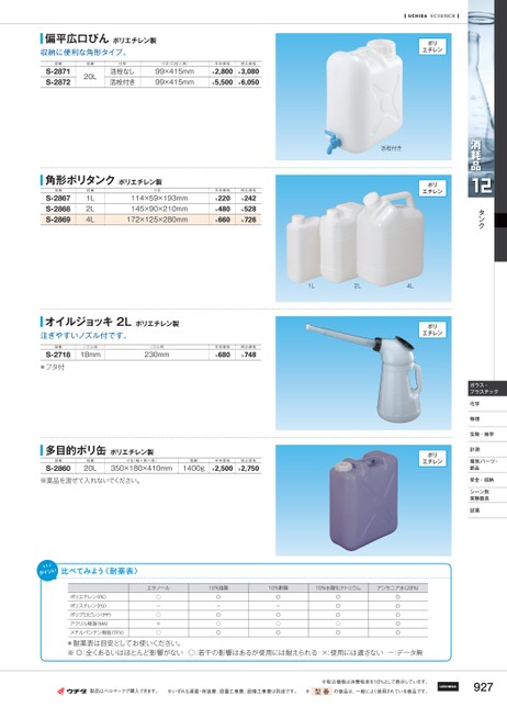 消耗品タンクガラス・プラスチック化学物理生物・地学計測電気パーツ・部品安全・収納シーン別実験器具試薬活栓付き1L2L4L偏平広口びんポリエチレン製収納に便利な角形タイプ。型番S-2871S-2872容量20L仕様活栓なし活栓付き寸法(口径×高)99×415mm99×415mm本体価格税込価格¥2,800¥5,500¥3,080¥6,050角形ポリタンクポリエチレン製型番S-2867S-2868S-2869容量1L2L4L寸法114×59×193mm145×90×210mm172×125×280mm本体価格¥220¥480¥660税込価格¥242¥528¥726オイルジョッキ2Lポリエチレン製注ぎやすいノズル付です。型番S-2718ノズル径18mm●フタ付ノズル長230mm本体価格¥680税込価格¥748多目的ポリ缶ポリエチレン製型番S-2860容量20L寸法(幅×奥×高)350×180×410mm質量1400g本体価格税込価格¥2,500¥2,750※薬品を混ぜて入れないでください。ポイント!比べてみよう〈耐薬表〉エタノール10%塩酸10%酢酸10%水酸化ナトリウムアンモニア水(28%)ポリエチレン(PE)ポリスチレン(PS)ポリプロピレン(PP)アクリル樹脂(MA)メチルペンテン樹脂(TPX)●耐薬表は目安としてお使いください。※◎:全くあるいはほとんど影響がない○:若干の影響はあるが使用には耐えられる×:使用には適さない-:データ無◎-◎○◎○-○×○◎-◎○◎◎◎◎○◎◎◎◎◎◎製品はベルマークで購入できます。※いずれも運賃・荷造費、設置工事費、設備工事費は別途です。※※税込価格は消費税率を10%として表示しています。型番の商品は、一般によく使用されている商品です。927