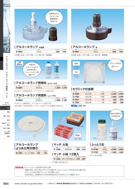 半透明の台で、アルコールの残量確認が容易です。アルコールランプ半透明アルコールランプ茶型番S-4624容量70mL本体価格¥640税込価格¥704型番S-4601容量70mL本体価格¥640税込価格¥704●材質:本体/ガラス製、ふた・受け台/樹脂製●材質:本体/ガラス製、ふた・受け台/樹脂製容量500mL主成分がエタノールなので安全性の高いアルコールランプ用燃料です。R-8207R-8204アルコールランプ用燃料エコノールS型番R-8207容量500mL本体価格税込価格¥1,250¥1,375●エタノール約95.8%、イソプロパノール約4.2%アルコールランプ用燃料ニューアル型番R-8204容量500mL本体価格税込価格¥1,000¥1,100●メタノール約90%、イソプロパノール約10%※R-8207、R-8204共に、パイトーチ式ランプには使用できません。10枚S-7000S-70021枚S-7001S-7003セラミック付金網型番S-7000S-7002S-7001S-7003寸法15cm角18cm角15cm角18cm角LOOKP.955金網セラミックを表すセマーク。入数10枚10枚1枚1枚本体価格税込価格¥2,400¥2,800¥240¥280¥2,640¥3,080¥264¥308液体が突沸するのを防ぎます。大箱12個入小箱12個入アルコールランプより糸芯用交換芯型番B-1261仕様1m、より糸製本体価格¥130税込価格¥143マッチ大箱型番P-1358入数約950本本体価格¥380税込価格¥418マッチ小箱12個入型番P-1340寸法56×18×36mm本体価格¥270税込価格¥297●1箱に約40本入り注意点アルコールランプを使用する時の注意・実験の際は、周りに燃えやすいものを置かず、アルコールランプを安全な台に置きます。・アルコールが8分目まで入っているか確認します。・使用の際は、注意書きをよく読み使用後は必ず火を消したことを確認します。500g100gふっとう石型番P-2150P-2152質量500g100g本体価格税込価格¥4,500¥1,500¥4,950¥1,650※1〜2mm弱粒消耗品アルコールランプ/アルコールランプ用燃料/マッチガラス・プラスチック化学物理生物・地学計測電気パーツ・部品安全・収納シーン別実験器具試薬954www.uchida.co.jp/educationこの他にも、「」にて消耗品を多数掲載しております。ぜひご覧ください。