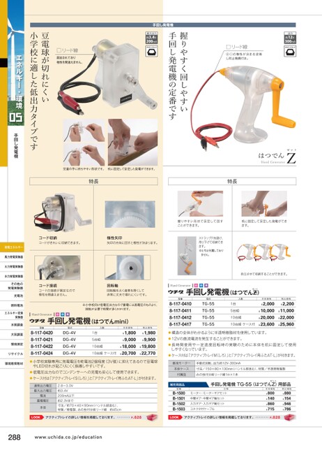 児童の手に持ちやすい形状です。机に固定して安定した発電ができます。特長特長出力約12V-300mA□リード線+-の極性が決まる逆差し防止機構付き。最大出力約3.4V-200mA手回し発電機□リード線固定されており極性を間違えません。エネルギー・環境手回し発電機発電エネルギー風力発電実験器火力発電実験器水力発電実験器その他の発電実験器光電池燃料電池エネルギー変換実験器水質調査大気調査環境測定リサイクル環境教育教材コード収納コードがきれいに収納できます。極性矢印矢印の方向に回すと極性が決まります。ストラップ穴を設け、吊り下げて収納できます。※ヒモは付属しておりません。握りやすい形状で安定して回すことができます。机に固定して安定した発電ができます。自立させて収納することができます。コード接続コードの接続が固定なので極性を間違えません。回転軸回転軸を太く歯車を厚くして非常に丈夫で壊れにくいです。※小学校向け低電圧出力なので蓄電には高電圧のものより、回転が必要で時間が多くかかります。HandGenerator小中高手回し発電機(はつでんmini)型番8-117-04208-117-04218-117-04228-117-0424型式DG-4VDG-4VDG-4VDG-4V入数1台5台組10台組10台組ケース付本体価格税込価格¥1,800¥9,000¥18,000¥20,700¥1,980¥9,900¥19,800¥22,770●小学校実験専用に発電電圧を乾電池2個程度(3V強)に抑えてあるので豆電球やLED切れが起こりにくく指導しやすいです。●低電圧出力なのでコンデンサーへの充電も安心して使用できます。●ケース付は「アクティブトレイS(しろ)」と「アクティブトレイ用ふたAT-L」が付きます。通常出力電圧最大出力電圧電流蓄電電圧本体2.8〜3.0V約3.4V200mA以下約2.3Vまで寸法/約70×40×90mm(ハンドル部含む)、材質/樹脂製、みの虫付分岐リード線約45cmHandGenerator小中高手回し発電機(はつでんZ)型番8-117-04108-117-04118-117-04128-117-0417型式TG-55TG-55TG-55TG-55入数1台5台組10台組10台組ケース付本体価格税込価格¥2,000¥10,000¥20,000¥23,600¥2,200¥11,000¥22,000¥25,960●構造の全体がわかるように半透明樹脂材を使用しています。●12Vの直流電流を発生することができます。●長時間使用や一定速度回転時の実験のために本体を机に固定して使用しやすくなっています。●ケース付は「アクティブトレイM(しろ)」と「アクティブトレイ用ふたAT-L」が付きます。直流モーター手動式回転、出力約12V-300mA本体ケース寸法/150×80×130mm(ハンドル部含む)、材質/半透明樹脂製付属品みの虫付分岐リード線1m×1本補充用部品型番B-1500B-1501B-1502B-1503手回し発電機TG-55(はつでんZ)用部品仕様本体価格税込価格モーター・モーターギアセット中間ギア・中間ギア軸セット入力ギア・入力ギア軸セットコネクタ付ケーブル¥800¥140¥860¥715¥880¥154¥946¥786LOOKアクティブトレイの詳しい情報を掲載しております。・・・・・・・・P.828LOOKアクティブトレイの詳しい情報を掲載しております。・・・・・・・・P.828288www.uchida.co.jp/education