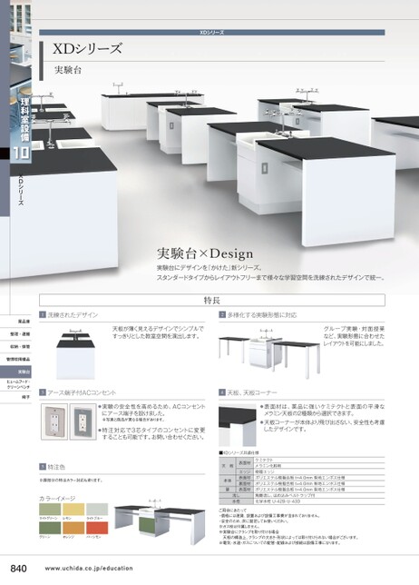 実験台にデザインを『かけた』新シリーズ。スタンダードタイプからレイアウトフリーまで様々な学習空間を洗練されたデザインで統一。1洗練されたデザイン2多様化する実験形態に対応天板が薄く見えるデザインでシンプルですっきりとした教室空間を演出します。グループ実験・対面授業など、実験形態に合わせたレイアウトを可能にしました。3アース端子付ACコンセント4天板、天板コーナー●実験の安全性を高めるため、ACコンセントにアース端子を設けました。※写真と商品が異なる場合があります。●特注対応で3芯タイプのコンセントに変更することも可能です。お問い合わせください。●表面材は、薬品に強いケミテクトと表面の平滑なメラミン天板の2種類から選択できます。●天板コーナーが本体より飛び出さない、安全性も考慮したデザインです。理科室設備XDシリーズ薬品庫整理・運搬収納・保管管理校用備品実験台ヒュームフード・クリーンベンチ椅子5特注色※扉部分の特注カラー対応も承ります。カラーイメージライトグリーンレモンライトブルーグリーンオレンジパーシモン840www.uchida.co.jp/education■XDシリーズ共通仕様天板本体扉表面材エッジ表面材裏面材表面材流し水栓ケミテクトメラミン化粧板樹脂エッジポリエステル樹脂合板t=4.0mm梨地エンボス仕様ポリエステル樹脂合板t=4.0mm梨地エンボス仕様ポリエステル樹脂合板t=4.0mm梨地エンボス仕様陶器流し、はめ込みベルトラップ付化学水栓U-42B・U-43Dご用命にあたって・価格には運賃、設置および設備工事費が含まれておりません。・安全のため、床に固定してお使いください。※ガス栓は付属しません。※実験台にクランプを取り付ける場合天板の構造上、クランプの大きさ・形状によっては取り付けられない場合がございます。※電気・水道・ガスについての配管・配線および接続は設備工事になります。XDシリーズ