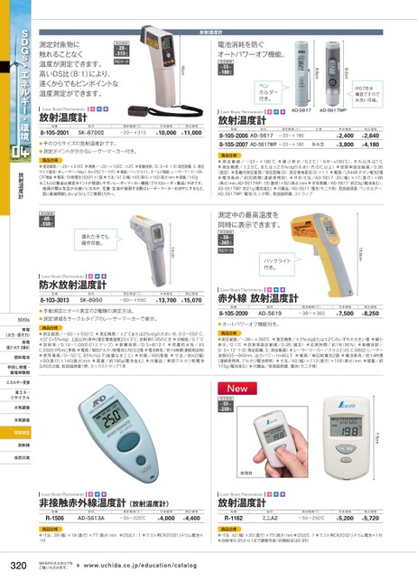 IP67防水構造ですので水洗い可能。8.2cm8.6cmペンホルダー付き。放射温度計電池消耗を防ぐオートパワーオフ機能。測定範囲ー33〜+180℃16cm測定範囲ー20〜+315℃PSCマーク測定対象物に触れることなく温度が測定できます。高いDS比(8:1)により、遠くからでもピンポイントな温度測定ができます。LaserBeamThermometer放射温度計小中高型番8-105-2001型式SK-8700Ⅱ測定範囲(℃)本体価格税込価格-20〜+315¥10,000¥11,000●手のひらサイズの放射温度計です。●測定ポイントが分かるレーザーマーカー付き。商品仕様●測定範囲/-20〜+315℃●精度/-20〜+100℃:±2℃●距離係数/D:S=8:1(D:測定距離、S:測定サイズ直径)●レーザー/Max1.0m(PSCマーク付)●機能/バックライト、ホールド機能、レーザーマーカーON・OFF機能●電源/9V乾電池(006P)×1個●寸法/41.5(幅)×65(奥行)×160(高さ)mm●質量/140g※こちらの製品は測定ポイントが視認しやすいレーザーマーカー機能(クラス2レーザー製品)付きです。使用の際は先生がお使いになるか、児童・生徒が使用する際はレーザーマーカーをOFFにするなど、目に直接照射しないようにしてご使用ください。LaserBeamThermometer放射温度計小中高AD-5617AD-5617WP型式測定範囲(℃)仕様AD-5617ー33〜+180AD-5617WPー33〜+180防水型本体価格¥2,400¥3,800税込価格¥2,640¥4,180型番8-105-20068-105-2007商品仕様●測定範囲/ー33〜+180℃●最小表示/0.2℃(-9.8〜+180℃)、それ以外は1℃●測定精度/±2.5℃、または±2.5%rdgの大きい方(0℃以上)●放射率設定範囲/0.95(固定)●距離対測定範囲/測定距離(D):測定領域直径(S)=1.1●電源/LR44形ボタン電池2個●電池寿命/約30時間(連続使用時)●外形寸法/AD-5617:20(幅)×17(奥行)×86(高さ)mm、AD-5617WP:18(直径)×82(高さ)mm●本体質量/AD-5617:約23g(電池含む)、AD-5617WP:約21g電池含む)●付属品/AD-5617:電池(モニタ用)、取扱説明書、ペンホルダー、AD-5617WP:電池(モニタ用)、取扱説明書、ストラップ15.6cm測定中の最高温度を同時に表示できます。測定範囲ー38〜+365℃PSCマークバックライト付き。14cm測定範囲ー60〜+550℃濡れた手でも操作可能。型番8-105-2009型式AD-5619測定範囲(℃)-38〜+365本体価格¥7,500税込価格¥8,250●オートパワーオフ機能付き。商品仕様●測定範囲/-38〜+365℃●測定精度/±2%rdgまたは±2℃のいずれか大きい値●最小表示/0.1℃●放射率設定範囲/0.95(固定)●応答時間/約1秒(90%)●距離係数/D:S=12:1(D:測定距離、S:測定範囲)●レーザーマーカー/クラス2(JISC6802)レーザー波長635〜660nm、出力パワー1mW以下●電源/単四乾電池2個●電池寿命/約14時間(連続使用時、アルカリ電池使用)●寸法/40(幅)×113(奥行)×156(高さ)mm●質量/約173g(電池含む)●付属品/取扱説明書、電池(モニタ用)7.5cm測定範囲ー55〜+250℃使用例LaserBeamThermometer放射温度計小中高LaserBeamThermometer小中高赤外線放射温度計LaserBeamThermometer小中高防水放射温度計型番8-103-3013型式SK-8950測定範囲(℃)本体価格税込価格-60〜+550¥13,700¥15,070●手動測定とオート測定の2種類の測定方法。●測定領域をサークルタイプのレーザーマーカーで表示。商品仕様●測定範囲/-60〜+550°C●測定精度/±2°Cまたは2%rdgの大きい方、0.0〜550°C、±(2°C+5%rdg)、上記以外(条件)測定環境温度23±3°C、放射率0.95のとき●分解能/0.1°C●放射率/0.10〜1.00(0.01ステップ)●距離係数/D:S=約12:1●防塵防水性/JISC0920IP54に準拠●電源/単四アルカリ乾電池(LRO3)2個●電池寿命/約14時間(連続測定時)●使用環境/0〜50°C、85%rh以下(結露なきこと)●材質/ABS樹脂●寸法/約42(幅)×80(奥行)×140(高さ)mm●質量/約196g(電池含む)●付属品/単四アルカリ乾電池(LR03)2個、取扱説明書1冊、ネックストラップ1本LaserBeamThermometer小中高非接触赤外線温度計(放射温度計)SDGs・エネルギー・環境放射温度計SDGs発電(火力・原子力)発電(風力・水力・太陽光)燃料電池手回し発電・蓄電実験器エネルギー変換省エネ・リサイクル大気調査水質調査環境測定放射線自然災害型番R-1506型式AD-5613A測定範囲(℃)-55〜220℃本体価格¥4,000税込価格¥4,400商品仕様型番R-1162商品仕様型式ミニA2測定範囲(℃)-55〜250℃本体価格¥5,200税込価格¥5,720●寸法:39(幅)×19(奥行)×77(高さ)mm●DS比1:1●テスト用CR2032リチウム電池×1付●寸法:42(幅)×20(奥行)×75(高さ)mm●DS比5:1●テスト用CR2032リチウム電池×1付●放射率0.05から1まで調整可能(初期設定は0.95)320WEBからもカタログをご覧いただけます。www.uchida.co.jp/education/catalog
