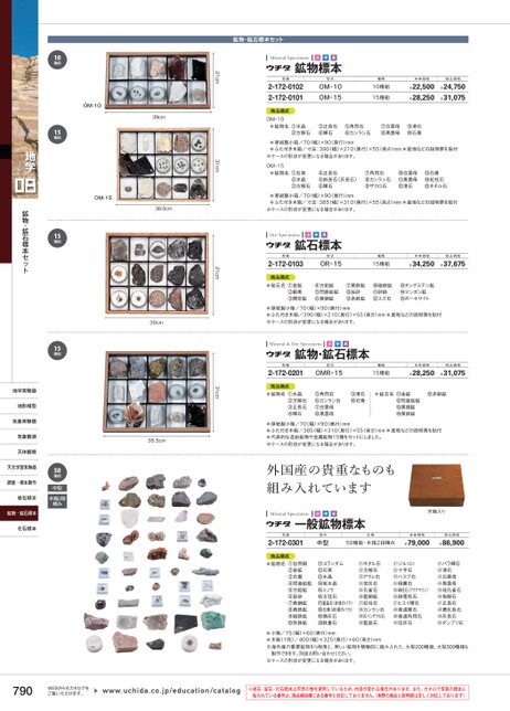 鉱物・鉱石標本セットMineralSpecimens小中高鉱物標本型番2-172-01022-172-0101型式OM-10OM-15種類10種組15種組本体価格¥22,500¥28,250税込価格¥24,750¥31,075商品構成OM-10●鉱物名①水晶②方解石③正長石④輝石⑤角閃石⑥カンラン石⑦白雲母⑧黒雲母⑨滑石⑩石膏●厚紙製小箱/70(幅)×90(奥行)mm●ふた付き木箱/寸法:390(幅)×210(奥行)×55(高さ)mm●産地などの説明票を貼付※ケースの形状が変更になる場合があります。OM-15●鉱物名①石英②水晶③方解石④正長石⑤斜長石(灰長石)⑥輝石⑦角閃石⑧カンラン石⑨ザクロ石⑩白雲母⑪黒雲母⑫滑石⑬石膏⑭紅柱石⑮ホタル石●厚紙製小箱/70(幅)×90(奥行)mm●ふた付き木箱/寸法:385(幅)×310(奥行)×55(高さ)mm●産地などの説明票を貼付※ケースの形状が変更になる場合があります。OreSpecimens小中高鉱石標本型番2-172-0103商品構成型式OR-15種類15種組本体価格税込価格¥34,250¥37,675●鉱石名①金鉱②銀黒③輝安鉱④方鉛鉱⑤閃亜鉛鉱⑥黄銅鉱⑦黄鉄鉱⑧辰砂⑨赤鉄鉱⑩磁鉄鉱⑪砂鉄⑫スズ石⑬タングステン鉱⑭マンガン鉱⑮ボーキサイト●厚紙製小箱/70(幅)×90(奥行)mm●ふた付き木箱/390(幅)×210(奥行)×55(高さ)mm●産地などの説明票を貼付※ケースの形状が変更になる場合があります。Mineral&OreSpecimens小中高鉱物・鉱石標本型番2-172-0201型式OMR-15種類15種組本体価格税込価格¥28,250¥31,075商品構成●鉱物名①水晶②方解石③正長石④輝石⑤角閃石⑥カンラン石⑦白雲母⑧黒雲母⑨滑石⑩石膏●鉱石名⑪金鉱⑫閃亜鉛鉱⑬黄銅鉱⑭黄鉄鉱⑮赤鉄鉱●厚紙製小箱/70(幅)×90(奥行)mm●ふた付き木箱/385(幅)×310(奥行)×55(高さ)mm●産地などの説明票を貼付●代表的な造岩鉱物や金属鉱物15種をセットにしました。※ケースの形状が変更になる場合があります。外国産の貴重なものも組み入れていますMineralSpecimens小中高一般鉱物標本木箱入り21cm31cm21cm31cmOM-1039cmOM-1538.5cm39cm38.5cm10種組15種組15種組15種組地学鉱物・鉱石標本セット地学実験器地形模型気象実験器気象観測天体観察天文学習実験器調査・標本製作岩石標本鉱物・鉱石標本化石標本50種組中型木箱2段積み型番2-172-0301型式中型仕様50種組・木箱2段積み本体価格¥79,000税込価格¥86,900商品構成●鉱物名①自然銅②金鉱③石墨④閃亜鉛鉱⑤方鉛鉱⑥辰砂⑦黄銅鉱⑧黄鉄鉱⑨磁鉄鉱⑩赤鉄鉱⑪コランダム⑫石英⑬水晶⑭紫水晶⑮メノウ⑯方珪石⑰重晶石(砂漠のバラ)⑱石膏(砂漠のバラ)⑲燐灰石⑳鉄重石●小箱/75(幅)×60(奥行)mm●木箱(1段)/400(幅)×325(奥行)×60(高さ)mm※海外産の重要鉱物を⅓程度と、美しい鉱物を積極的に組み入れた、大型200種組、大型300種組も31ジルコン⑳32十字石⑳33ベスブ石⑳34緑簾石⑳35緑柱石(アクアマリン)⑳36鉄電気石⑳37ヒスイ輝石⑳38普通輝石⑳39普通角閃石⑳40珪灰石⑳21ホタル石⑳22方解石⑳23アラレ石⑳24苦灰石⑳25孔雀石⑳26藍銅鉱⑳27紅柱石⑳28カンラン石⑳29灰バンザクロ石⑳30藍晶石⑳41バラ輝石⑳42滑石⑳43白雲母⑳44黒雲母⑳45珪孔雀石⑳46魚眼石⑳47正長石⑳48曹灰長石⑳49灰長石⑳50ダンブリ石⑳製作できます。別途お問い合わせください。WEBからもカタログをご覧いただけます。www.uchida.co.jp/education/catalogo※岩石・鉱石・化石標本は天然の物を使用しているため、内容が変わる場合があります。また、カタログ写真の標本に貼られている番号は、商品構成欄にある番号と対応しておりません。実際の商品と説明書は正しく対応しております)※ケースの形状が変更になる場合があります。