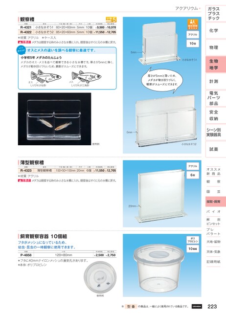 観察槽型番R-4321R-4322型名小さな水そう1小さな水そう2寸法(幅×奥×高)60×20×60mm85×20×60mm内寸5mm5mm入数10個10個本体価格¥9,980¥11,550税込価格¥10,978¥12,705●材質:アクリル●ケース入注意点メダカは観察する時のみ小さな水槽に入れ、観察後はすぐに元の水槽に戻す。ポイント!違調観察最適。5mm小学校5年・並観察小水槽。厚5mm薄、動回、観察。アクアリウム10個小さな水そう1オスしりびれが台形メスしりびれが三角形厚さが5mmと薄いため、メダカが動き回りづらく、観察がスムーズにできます。ガラスプラスチック化学物理生物地学計測電気パーツ部品5mm使用例小さな水そう2薄型観察槽型番R-4323型名寸法(幅×奥×高)内寸薄型観察槽150×50×150mm20mm入数6個本体価格¥11,550税込価格¥12,705●材質:アクリル注意点メダカは観察する時のみ小さな水槽に入れ、観察後はすぐに元の水槽に戻す。20mm飼育観察容器10個組フタがメッシュになっているため、幼虫・昆虫の一時観察に使用できます。型番P-4858寸法120×80mm本体価格¥2,500税込価格¥2,750●フタに40mmナイロンメッシュの通気孔があります。●本体:ポリプロピレン6個10個組安全収納シーン別実験器具試薬オススメオススメ新品商観園察芸採取・飼育ババイイオオ解剖解剖ピンセットットプレプレパラートパラート大地・鉱物天体・気象天体・気象記録用紙記録用紙使用例※型番の商品は、一般によく使用されている商品です。223