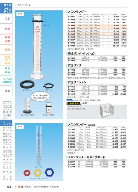 メスシリンダー安全リングガラスプラスチック化学物理生物地学計測電気パーツ部品安全収納シーン別実験器具試薬験ビーカーフラスコフラスコシャーレ試管ガラス器具器セットトメスシリンダーピペットトロトロト集気びん試薬びん採水びん洗浄びんー安全クッション安全リングメスシリンダーの転倒防止に役立ちます。安全クッション使用例安全リング使用例注射器ガラス管ガラス管ガラス棒水そううコバッッ蒸蒸発発乳るつプトト皿皿鉢ぼ94メスシリンダー用ネックガード※型番の商品は、一般によく使用されている商品です。メスシリンダー型番容量10mL20mL25mL50mL100mL100mL200mL200mL250mL500mL1000mL最小目盛0.1mL0.2mL0.2mL0.5mL1mL1mL2mL2mL2mL5mL10mL寸法(胴外径×高さ)14×215mm16×225mm17×225mm25×227mm32×280mm32×280mm40×285mm40×285mm42×350mm54×390mm70×445mm●ほうけい酸ガラス製●箱入り安全リング・クッション安全リング付安全クッション本体価格税込価格-○○○○○○○--------○-○---¥1,200¥1,380¥1,730¥1,840¥2,090¥2,190¥2,550¥2,650¥2,880¥4,830¥10,120¥1,320¥1,518¥1,903¥2,024¥2,299¥2,409¥2,805¥2,915¥3,168¥5,313¥11,132型番規格100mL用200mL用安全リング型番規格20mL用25mL用50mL用適応型番S-1005用S-1006用本体価格¥540¥740税込価格¥594¥814適応型番S-1002用S-1003用S-1004用本体価格¥120¥120¥150税込価格¥132¥132¥165●転倒した場合注ぎ口が壊れやすいため、注ぎ口に付けて破損防止に役立ちます。安全クッション型番規格100mL用200mL用500mL用1000mL用〈共通仕様〉●天然ゴム製適応型番S-1005用S-1006用S-1008用S-1009用本体価格¥370¥550¥720¥1,400税込価格¥407¥605¥792¥1,540LOOKメスシリンダー洗いを掲載しています。あると便利!詳情報掲載。メスシリンダーIWAKI製型番容量5mL10mL20mL50mL100mL200mL500mL●ほうけい酸ガラス製●逆目盛付最小目盛0.1mL0.1mL0.2mL0.5mL1mL2mL5mL寸法(胴外径×高さ)12×125mm14×180mm16×200mm25×220mm32×250mm40×275mm55×360mm本体価格¥1,470¥1,470¥1,650¥2,170¥2,550¥3,170¥5,810税込価格¥1,617¥1,617¥1,815¥2,387¥2,805¥3,487¥6,391メスシリンダー用ネックガード型番色赤黄青規格50mL用100mL用200mL用適応型番S-2383用S-2384用S-2385用本体価格¥180¥230¥280税込価格¥198¥253¥308
