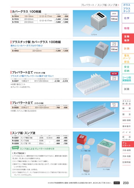カバーグラス100枚組型番S-7014S-7015S-7016寸法18×18mm22×22mm24×24mm厚さ0.12〜0.17mm0.12〜0.17mm本体価格¥500¥1,400¥1,800税込価格¥550¥1,540¥1,980プラスチック製カバーグラス100枚組割れにくいカバーガラスなので安心!型番S-4943寸法22×22mm本体価格¥1,300税込価格¥1,430プレパラート/スンプ板・スンプ液S-7014100枚組100枚組プレパラート立てプラスチック製プラスチック製でプレパラートに傷がつきづらい!型番S-5027仕様10枚立て寸法(幅×奥×高)81×125×22mm本体価格¥2,100税込価格¥2,310●材質:塩化ビニル※プレパラートは別売です。シーン別実験器具ガラスプラスチック化学物理生物地学計測電気パーツ部品安全収納試薬オススメ新品新品商商観園察芸採取・飼育標本製作バイオ解剖ピンセットットプレパラート大地・鉱物天体・気象記録用紙プレパラート立て(スライド架)型番S-5020仕様20枚立て寸法(幅×奥行×高)80×150×20mm本体価格¥760税込価格¥836●材質:ステンレス製(SUS304)スンプ板・スンプ液型番R-5207R-5208R-5209POINT品名スンプ薄板B板スンプ台板スンプ液1号入数30枚50枚20cc厚さ0.3mm-本体価格¥450¥630¥660税込価格¥495¥693¥726法作方〈法〉法、観察対象観察、観察対象表面写取、写取観察手法。①薄板表面液筆1滴置。②数秒薄板表面粘気生、調物表面貼付。③3分程置後、取。④表面下、台板穴液付貼付上。スンプ薄板B板スンプ台板スンプ液1号※カタログ有効期間中に価格・仕様が変更になる場合があります。あらかじめご了承ください。233