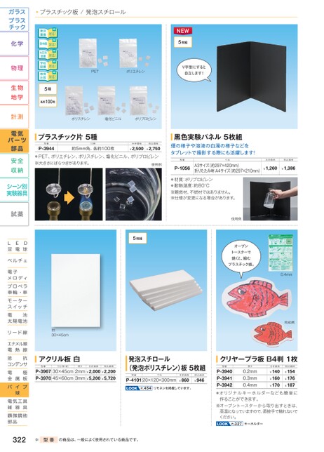 プラスチック板/発泡スチロールPETポリエチレン5枚組V字型にすると自立します!5種各約100枚ポリスチレン塩化ビニルポリプロピレンプラスチック片5種型番仕様本体価格税込価格P-3944約5mm角、各約100枚¥2,750●PET、ポリエチレン、ポリスチレン、塩化ビニル、ポリプロピレン※大きさにばらつきがあります。¥2,500使用例黒色実験パネル5枚組煙の様子や溶液の白濁の様子などをタブレットで撮影する際にも活躍します!型番P-1056寸法本体価格税込価格A3サイズ(約297×420mm)折りたたみ時:A4サイズ(約297×210mm)¥1,260¥1,386●材質:ポリプロピレン●耐熱温度:約80°C※難燃材、不燃材ではありません。※仕様が変更になる場合があります。5枚組使用例オーブントースターで焼くと、縮むプラスチック板。0.4mm完成例クリヤープラ板B4判1枚型番厚さ本体価格税込価格P-3940P-3941P-3942●オリジナルキーホルダーなども簡単に0.2mm0.3mm0.4mm¥154¥176¥187¥140¥160¥170作ることができます。※オーブントースターから取り出すときは、高温になっていますので、直接手で触れないでください。LOOKP.327キーホルダーアクリル板白型番寸法(横×縦)厚さ本体価格税込価格P-396730×45cm2mm¥2,000P-397045×60cm3mm¥5,200¥2,200¥5,720発泡スチロール(発泡ポリスチレン)板5枚組型番寸法P-410120×120×300mm本体価格¥860税込価格¥946LOOKP.454リモネンを掲載しています。0×45cm白3器電気工具雑具顕微鏡他部品322※型番の商品は、一般によく使用されている商品です。ガラスプラスチック化学物理生物地学計測電気パーツ部品安全収納シーン別実験器具試薬L豆豆E電電D球球ペルチェェ電子メロディプロペラプロペラ車輪・車モータースイッチ電池太陽電池リード線リード線熱エナメル線線電抵抗抵抗コンデンサデ極電板金パプ属イ球