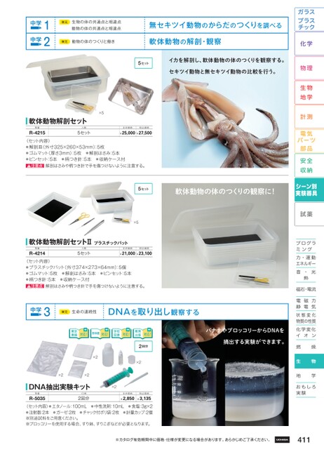 単元生物の体の共通点と相違点動物の体の共通点と相違点単元動物の体のつくりと働き無動物調軟体動物解剖・観察5イカを解剖し、軟体動物の体のつくりを観察する。セキツイ動物と無セキツイ動物の比較を行う。軟体動物解剖セット×5型番R-4215入数5セット本体価格税込価格¥25,000¥27,500〈セット内容〉●解剖皿(外寸325×260×53mm):5枚●ゴムマット(厚さ3mm):5枚●解剖はさみ:5本●ピンセット:5本●柄つき針:5本●収納ケース付注意点解剖はさみや柄つき針で手を傷つけないように注意する。5軟体動物の体のつくりの観察に!×5軟体動物解剖セットⅡプラスチックバット型番R-4214入数5セット本体価格税込価格¥21,000¥23,100〈セット内容〉●プラスチックバット(外寸374×273×64mm):5個●ゴムマット:5枚●解剖はさみ:5本●ピンセット:5本●柄つき針:5本●収納ケース付注意点解剖はさみや柄つき針で手を傷つけないように注意する。単元生命の連続性DNA取出観察×2×2×22回分×2DNA抽出実験キット×2型番仕様本体価格税込価格バナナやブロッコリーからDNAを摘出する実験ができます。2回分R-5035¥3,135〈セット内容〉●エタノール:100mL●中性洗剤:10mL●食塩:3g×2●注射器:2本●ガーゼ:2枚●チャック付ポリ袋:2枚●計量カップ:2個※別途試料をご用意ください。※ブロッコリーを使用する場合、すり鉢、すりこぎなどが必要となります。¥2,850※カタログ有効期間中に価格・仕様が変更になる場合があります。あらかじめご了承ください。ガラスプラスチック化学物理生物地学計測電気パーツ部品安全収納シーン別実験器具試薬プログラミングミング力・運動エネルギーー音・光熱磁石・電流磁電力電気静状態変化物質の性質化学変化インオ燃生地焼物学おもしろ実験411