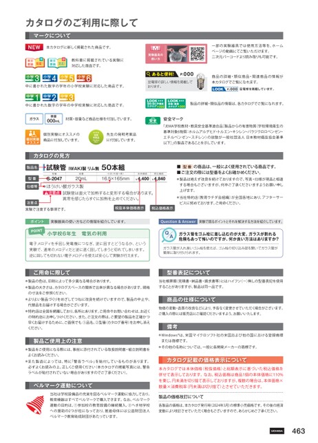 カタログのご利用に際してマークについて本カタログに新しく掲載された商品です。教科書に掲載されている実験に対応した商品です。中に書かれた数字の学年の小学校実験に対応した商品です。動画実験器具使方一部の実験器具では使用方法等を、ホームページの動画にてご覧いただけます。二次元バーコードより読み取りも可能です。あると便利!P.000豆電球詳情報掲載。商品の詳細・類似商品・関連商品の情報が本カタログでご覧になれます。LOOKP.000豆電球を掲載しています。中に書かれた数字の学年の中学校実験に対応した商品です。P.000P.000製品の詳細・類似品の情報は、各カタログでご覧になれます。容量000mL材質・容量など商品仕様を付加しています。安全マーク個別実験にオススメの商品に付加しています。先生の発明考案品に付加しています。「JEMA学校教材・教具安全基準適合品[製品からの有害物質(学校環境衛生の基準対象6物質:ホルムアルデヒド・トルエン・キシレン・パラジクロロベンゼン・エチルベンゼン・スチレン)の放散が一般社団法人日本教材備品協会基準以下]」の製品であることを示しています。カタログの見方製品名型番仕様等試験管IWAKI製リム無50本組型番S-2047容量20mL●ほうけい酸ガラス製寸法(外径×長)16.5×165mm本体価格税込価格¥4,400¥4,840注意点試験管は直火で加熱すると変形する場合があります。異常を感じたらすぐに加熱を止めてください。注意点実験で注意する事項です。税抜本体価格表示税込価格表示型番の商品は、一般によく使用されている商品です。■■ご注文の際には型番をよくお確かめください。●製品は絶えず改良を続けておりますので、写真・仕様が現品と相違する場合もございますが、何卒ご了承くださいますようお願い申し上げます。●当社特約店(教育ウチダ会組織)が全国各地にあり、アフターサービスに努めております。ご用命ください。実験器具の使い方などの情報を紹介しています。Question&Answer実験で困るポイントとそれを解決する方法を紹介しています。ポイントPOINT小学校6年生電気利用電子手回発電機、逆回、実験、通常逆速回切。逆回切電子使安心実験行。管栓差込大変。割危険怖、何良方法?管入易栓使、栓切込部開管簡単取付。ご用命に際して型番表記について●製品の色は、印刷によって多少異なる場合があります。●製品の大きさは、カタログスペースの関係で比率が異なる場合があります。規格当社帳票類(見積書・納品書・請求書等)にはハイフン(-)無しの型番表記を使用することがありますが、製品は同一品です。の寸法をご参照ください。●よりよい製品づくりをめざしてつねに改良を続けていますので、製品の中止や、代替品をお届けする場合がございます。●特約店は全国を網羅しており、各所にあります。ご用命やお問い合わせは、お近くの特約店にお申しつけください。また、ご注文の際は、ご要望の製品を正確かつ早くお届けするために、ご面倒でも①品名、②型番(カタログ番号)をお申し添えください。製品ご使用上の注意●製品をご使用になる際には、事前に添付されている取扱説明書・組立説明書をよくお読みください。●また製品によっては、特に「警告ラベル」を貼付しているものがあります。必ずよくお読みの上、正しくご使用ください(本カタログの掲載写真には、警告ラベルが貼付されていない場合がありますのでご了承ください)。ベルマーク運動について当社は学校設備品の充実を図るベルマーク運動に協力しており、教育機器はすべてベルマークで購入できます。なお、ベルマーク運動の目的は、①参加校の教育設備の継続購入、②へき地学校への援助の2つが柱になっており、推進母体には公益財団法人ベルマーク教育助成財団があたっています。商品の仕様について物価の変動・品質の改良などにより、予告なく変更させていただく場合がございます。ご購入の際には販売店にご確認くださいますよう、お願いいたします。備考●Windows®は、米国マイクロソフト社の米国および他の国における登録商標または商標です。●その他の名称については、一般に各開発メーカーの商標です。カタログ記載の価格表示について本カタログでは本体価格(税抜価格)と総額表示に基づいた税込価格を併せて表示しております。なお、税込価格は商品1個の本体価格に110%を乗じ、円未満を切り捨て表示しておりますが、複数の場合は、本体価格×数量×消費税率(円未満は切り捨て)とさせていただきます。製品の価格改訂について各製品の価格は、本カタログ発行時(2024年3月)の標準小売価格です。その後の経済変動により改訂させていただく場合もございますので、あらかじめご了承ください。463