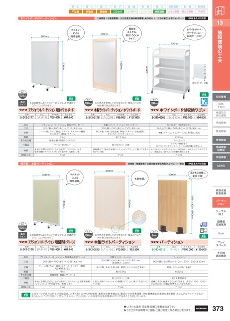 13施設環境の工夫知的障害肢体不自由病弱及び身体虚弱視覚障害聴覚障害言語障害情緒障害自閉症学習障害ADHD特別支援教室家具パーティションテーブル椅子整理棚収納家具マットプレイスペースその他施設備品読む不注意書く多動性聞く衝動性話すこだわり推論論計算見る人との関わりコミュニケーション感覚過敏空間理解大きな運動記憶細かな運動規則性不器用ホワイトボード付パーティション①自閉症|②発達障害|③④注意欠陥多動性障害(ADHD)①②③衝立④ホワイトボード1学級あたり1程度ホワイトボード・パーティション・収納が一つに!850mmホワイトボード面高さ1236mmホワイトボード付収納ワゴン1236mm1500mm1336mm956mmマグネットによる簡易連結。900mm視線をさえぎる、高さ150cmタイプ。高さ1336mm連結タイプ※床の状態によっては上下のマグネットが連結できないことがあります。プチジョイントパーティション両面ホワイトボード高さ1500mm※天然木を使用しておりますので、商品ごとに色・木目・節の数が異なります。木製ライトパーティションホワイトボード型番8-343-0177型式SPJP-W本体価格¥58,400税込価格¥64,240型番8-343-0176型式UT-L150WB本体価格¥98,000税込価格¥107,800型番8-340-0003型式SK-812W本体価格¥86,000税込価格¥94,600品名寸法材質質量その他仕様付属品特長詳細Lookプチジョイントパーティション両面ホワイトボード956(幅)×400(奥行)×1336(高さ)mmフレーム部/アルミ、脚部/スチール、キャスター/樹脂、ホワイトボード板面/スチール13kg板面仕様:両面ホワイトボード木製ライトパーティションホワイトボード900(幅)×360(奥行)×1500(高さ)mm枠/木製、本体/化粧合板、脚部/スチール(白色塗装)、ホワイトボード/スチールシート約13.5kgーマーカー受けトレー取り付けネジ、工具手軽に空間を区切ることができます。マグネットによる簡易連結(プチジョイント)が可能です。直線、L字)P.46両面書けて、貼れる木製パーティションです。上に乗っても安心のフラット脚。P.46ホワイトボード付収納ワゴン外寸/850(幅)×509(奥行)×1236(高さ)mm本体/スチール、キャスター/ゴム、粉受け/ABS約34kgキャスター付マグネット付粉受け(ホワイトボードマーカー、ラーフルは付属しません。)ホワイトボード×パーティション×収納が一体となったマルチワゴン。本製品は1台で3つの役割を果たします。P.254掲示板/木製パーティション956mmマグネットによる簡易連結。自閉症|発達障害|注意欠陥多動性障害(ADHD)衝立1学級あたり1程度900mm木製軽量。900mm高さを3段階に変更可能!1100・1300・1500mm高さ3段階パーティション施工費別1500mm1336mm高さ1336mm連結タイプ※床の状態によっては上下のマグネットが連結できないことがあります。プチジョイントパーティション両面掲示板(グリーン)高さ1500mm※天然木を使用しておりますので、商品ごとに色・木目・節の数が異なります。木製ライトパーティション型番8-343-0178型式SPJP-RG本体価格¥58,400税込価格¥64,240型番8-342-0815型式UT-L150本体価格¥75,000税込価格¥82,500型番8-343-0018型式TF-N63本体価格¥100,000税込価格¥110,000品名寸法材質質量その他仕様付属品特長詳細Lookプチジョイントパーティション両面掲示板(グリーン)956(幅)×400(奥行)×1336(高さ)mmフレーム部/アルミ、脚部/スチール、キャスター/樹脂、掲示板板面/塩ビ板面仕様:両面レザーボード9kgーP.46木製ライトパーティション900(幅)×360(奥行)×1500(高さ)mm(本体厚み:30mm)パーティション900(幅)×30(厚さ)×1100・1300・1500(高さ)mm枠/木製、本体/化粧合板、脚部/スチール(白色塗装)脚部/スチール(焼付塗装)約10.9kgー取り付けネジ、工具P.44約22kgー高さ変更用部品P.368手軽に空間を区切ることができます。マグネットによる簡易連結(プチジョイント)が可能です。(直線、L字)人気の木製パーティションの軽量タイプ。上に乗っても安心のフラット脚。目線の高さに配慮することができます。高さを1100・1300・1500mmの3段階に変更することができます。このマークが表示されている製品は、いずれも「JEMA学校教材・教具安全基準適合品[製品からの有害物質(学校環境衛生の基準対象6物質:ホルムアルデヒド・トルエン・キシレン・パラジクロロベンゼン・エチルベンゼン・スチレン)の放散が当協会基準以下]」であることを示しています。いずれも運賃・荷造費・設置工事費は別途です。▲カタログ有効期間中に価格・仕様が変更になる場合があります。373