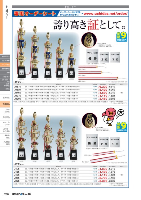 トロフィー専用オーダーシートオーダーシートはWEBからご利用ください。www.uchidas.net/order/誇り高き証として。※レリーフの種類、発注の流れにつきましては235ページをご参照ください。※角ゴシック体の印刷プレートとなります。JB520JB465JB375JB305長さ:25cm長さ:30cm長さ:50cm※ペナントは高さに応じて3タイプございます。JB575トロフィータイプ商品種別寸法/105(幅)×105(奥)×553(高)mm、質量/500g、名入プレートサイズ/44(幅)×40高)mm寸法/110(幅)×110(奥)×602(高)mm、質量/585g、名入プレートサイズ/55(幅)×50高)mmJB575JB520JB465JB375JB305●材質/人形:アンチ、本体・台座:樹脂●ペナント3本付(長さ50cmはJB575、JB520に付属、30cmはJB465、JB375に付属、25cmはJB305に付属)●包装数:1※高さはベース部を含みます。寸法/85幅)×75(奥)×490(高)mm、質量/445g、名入プレートサイズ/44(幅)×40高)mm寸法/85幅)×75(奥)×420(高)mm、質量/405g、名入プレートサイズ/44(幅)×40高)mm寸法/85幅)×75(奥)×353(高)mm、質量/365g、名入プレートサイズ/44(幅)×40高)mm¥6,220¥5,420¥4,590¥4,110¥3,460¥6,780¥5,745¥5,145¥4,3301個税込価格¥6,842¥5,962¥5,049¥4,521¥3,806税抜価格M価税抜¥7,780単位※プレート名入れ代込みの価格です。※レリーフの種類、発注の流れにつきましては235ページをご参照ください。※角ゴシック体の印刷プレートとなります。長さ:25cm長さ:30cm※ペナントは高さに応じて2タイプございます。トロフィータイプ商品種別J495J455J405J365J285寸法/120(幅)×90奥)×538(高)mm、質量/500g、名入プレートサイズ/55幅)×50(高)mm寸法/120(幅)×75奥)×496(高)mm、質量/445g、名入プレートサイズ/44幅)×40(高)mmJ495J455J405J365J285●材質/人形:アンチ、本体・台座:樹脂●ペナント3本付(長さ30cmはJ495、J455、J405、J365に付属、長さ25cmはJ285に付属)●包装数:1寸法/120(幅)×75奥)×457(高)mm、質量/435g、名入プレートサイズ/44幅)×40(高)mm寸法/120(幅)×75奥)×412(高)mm、質量/400g、名入プレートサイズ/44幅)×40(高)mm寸法/80幅)×75(奥)×342(高)mm、質量/345g、名入プレートサイズ/44(幅)×40高)mm¥5,545¥5,145¥4,745¥4,130M価税抜¥6,045税抜価格¥4,830¥4,430¥4,110¥3,790¥3,300単位1個税込価格¥5,313¥4,873¥4,521¥4,169¥3,630※高さはベース部を含みます。※プレート名入れ代込みの価格です。トロフィー学習ペーパークラフト・素材イベント用品学習支援用品保育安全・安心OA・サプライ用品文具・事務用品日用品装飾用品装飾用式典用品文集・文集・記念品記念品掲示用品掲示用品スタンプ・シールシールレクリエーレクリエーション用品運動会運動会用品用品AV関連AV関連機器機器236Vol.18