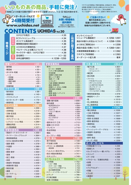 いつものあの商品、手軽に発注!※地域によりお届け日数が異なりますのでご留意ください。※土・日・祝日を除きます。行事用品、学習支援用品、日用品、学校、幼稚園・保育園生活必要取揃。、発注簡便、迅速行、皆様期待応。オンラインショップP.1256・1257リニューアル機能紹介………………P.1258・1259商品のお届けとお支払いについて……よくあるご質問Q&A……………………………P.1259P.1260・1261商品の返品・交換について…………お客様情報変更連絡シートP.1262…………………ウチダスご利用規約……………………………P.1263オーダーシート記入例………………………………巻末利用関案内カタログの見方…………………………………………P.33ECサイトリニューアル…………………………………P.34オリジナル商品紹介……………………………………P.35期間限定価格の商品紹介………………………………P.36UCHIDASの環境対応…………………………………P.37ベルマークによる購入について………………………P.38キャラクター紹介/カタログ紹介……………………P.39品名索引……………………………………………P.1〜32お申込番号索引……………………………P.1238〜1255おすすめ活動紹介索引特集インターネット・FAXで24時間受付www.uchidas.netCONTENTSUCHIDASONLINESHOPうれしいお買い得価格&送料無料※地域によりお届け日数が異なりますのでご留意ください。Vol.20ご注意ください!働き方改革法により、配達にお時間や、日数がかかる地域が出る可能性がございます。P.40〜学習ペーパーP.40〜●画用紙……………………………………………P.55〜●模造紙……………………………………………P.58〜●おりがみ・和紙………………………………P.74〜●ノート……………………………………………P.74〜●学習帳………………………………………………P.84〜●連絡帳………………………………………………P.85〜●横罫・縦罫…………………………………………P.85〜●方眼…………………………………………………P.94〜●各種用紙………………………………………P.98〜クラフト・素材P.98〜●制作素材………………………………………●描画用品………………………………………P.140〜●クラフトパンチ………………………………P.171〜●はさみ・カッター・定規……………………P.176〜●接着用品………………………………………P.189〜イベント用品P.206〜●装飾用品………………………………………P.206〜●式典用品………………………………………P.216〜…………………………………P.239〜●文集・記念品●掲示用品………………………………………P.250〜●スタンプ・シール……………………………P.274〜●レクリエーション用品……………………P.289〜●運動会用品……………………………………P.314〜●AV関連機器…………………………………P.337〜学習支援用品P.356〜●発表ボード・ホワイトボード……………P.356〜●タイマー・ストップウォッチ……………P.364〜………………………………P.370〜●黒板関連用品●SDGs・総合的な学習……………………P.375〜●国語・書写………………………………………P.378〜●外国語……………………………………………P.388〜●社会………………………………………………P.394〜●算数・数学………………………………………P.400〜●音楽………………………………………………P.418〜●図工・美術………………………………………P.432〜●技術………………………………………………P.442〜…………………………P.448〜●家庭科・学校給食●保健体育・球技………………………………P.474〜P.498〜P.535P.536〜P.548〜………………………………………………カードゲーム……………………………●図書室……………………………………………………………………………別支援特●道徳……………●●学習支援用品●理科……………………………………P.560〜●ビーカー・容器類………………………………P.560〜………………………P.585〜●スタンド類・加熱器具…………………………………………P.594〜●安全配慮●温度計・計量・計測……………………………P.597〜●鏡・レンズ・磁石…………………………………P.609〜●電気・パーツ類…………………………………P.612〜●エネルギー………………………………………P.626〜……………………P.631〜●ろ紙・試験紙・環境測定●薬品・実験材料…………………………………P.635〜●実験キット・おもしろ実験…………………P.646〜●理科教材・実験器………………………………P.656〜…………………………………………………P.675〜●観察●飼育・栽培インデックス……………………P.685●収納・管理…………………………………………P.686〜保育P.690〜●運動・屋外遊具………………………………P.690〜●室内遊具………………………………………P.694〜●乳幼児おもちゃ…………………………………P.694〜●ごっこあそび……………………………………P.696〜●ままごと…………………