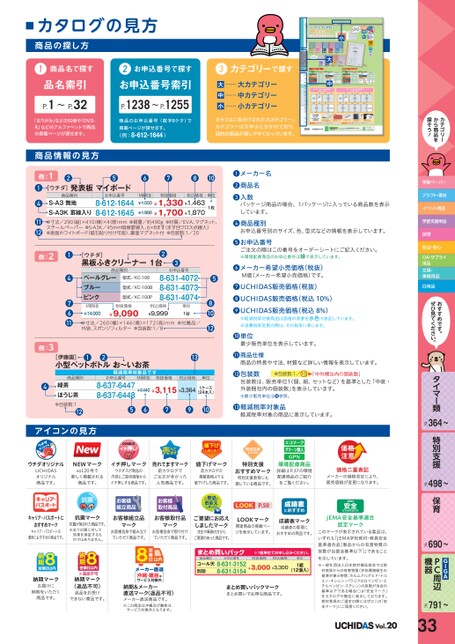 カテゴリーから商品を探そう!学習ペーパークラフト・素材イベント用品学習支援用品保育安全・安心OA・サプライ用品文具・事務用品日用品おすすめです。ぜひ見てください。タイマー類P.364〜特別支援P.498〜保育P.690〜GIGAPC周辺機器P.791〜納期マークお届けに納期をいただく商品です。※返品不可納期マーク(返品不可)返品をお受けできない商品です。商品種別まとめ買いパックコール天8-631-31528-631-3154別珍お申込番号※1組単位申込。税抜価格税込価格単位¥3,000¥3,3001組(12個入)まとめ買いパックマークまとめ買いでお得な商品です。沖縄・離島はサービス対象外納期&メーカー直送マーク(返品不可)メーカー直送商品です。※この商品は沖縄及び離島はサービス対象外となります。JEMA安全基準適合認定マークこのマークが表示されている製品は、いずれも「JEMA学校教材・教具安全基準適合品[製品からの有害物質の放散が当協会基準以下]」であることを示しています。※一般社団法人日本教材備品協会では教材教具からの有害物質(学校環境衛生の基準対象6物質:ホルムアルデヒド・トルエン・キシレン・パラジクロロベンゼン・エチルベンゼン・スチレン)の放散が当会の基準以下である場合には「安全マーク」をカタログや梱包に表示しております。教材教具のご選定の際にはぜひこの「安全マーク」にご留意ください。Vol.2033カタログの見方商品の探し方1商品名で探す品名索引P.1〜P.32「おりがみ」などの50音や「DVD-R」などのアルファベットで商品の掲載ページが探せます。商品情報の見方お申込番号で探す2お申込番号索引P.1238〜P.1255商品のお申込番号(数字8ケタ)で掲載ページが探せます。(例:8-612-1644)3カテゴリーで探す大……大カテゴリー中……中カテゴリー小……小カテゴリーカラフルに色分けされた大カテゴリー。カテゴリーは大中小に分かれており、目的の商品が探しやすくなっています。小大中例:12[ウチダ]発表板マイボード567810商品種別お申込番号M価税抜税抜価格税込価格単位8-612-16448-612-1645S-A3無地S-A3K罫線入り●寸法/290(縦)×410(横)×4(厚)mm●質量/約490g●材質/EVA、マグネット、スチールペーパー●S-A3K/45mm暗線罫線入、6×8ます(ます目クロス点線入)●表面ホワイトボード(磁石貼り付け可能)、裏面マグネット付●包装数:1/20¥1,550¥1,330¥1,463¥1,986¥1,700¥1,8701枚141112例:21476112[ウチダ]黒板ふきクリーナー1台3商品種別ペールグレーブルーピンク型式/KC-100型式/KC-100B型式/KC-100Pお申込番号8-631-40728-631-40738-631-4074M価税抜¥14,000税抜価格¥9,090税込価格¥9,999単位1台●寸法/260(幅)×146(奥)×172(高)mm●付属品/外袋、スポンジフィルター●包装数:1/81メーカー名2商品名3入数パッケージ商品の場合、1パッケージに入っている商品数を表示しています。4商品種別お申込番号別のサイズ、色、型式などの情報を表示しています。5お申込番号ご注文の際はこの番号をオーダーシートにご記入ください。※環境配慮商品のお申込番号は緑で表示しています。5810126メーカー希望小売価格(税抜)M価(メーカー希望小売価格)です。7UCHIDAS販売価格(税抜)8UCHIDAS販売価格(税込10%)9UCHIDAS販売価格(税込8%)※軽減税率対象商品は価格の背景を水色で表記しています。※消費税率変更の際は、その税率に準じます。10単位最少販売単位を表示しています。例:34商品種別緑茶ほうじ茶●包装数:112[伊藤園]小型ペットボトルお〜いお茶1213税込価格単位軽減税率対象品M価税抜税抜価格お申込番号8-637-64478-637-6448¥4,40¥3,115¥3,3641ケース(24本入)11商品仕様商品の特長や寸法、材質など詳しい情報を表示しています。12包装数●包装数:1/10⬅「中外梱包内の個装数」包装数は、販売単位1(個、組、セットなど)を基準とした「中装・外装梱包内の個装数」を表示しています。※最少販売単位は❿参照。56791013軽減税率対象品軽減税率対象の商品に表示しています。アイコンの見方売れてます!ウチダオリジナルUCHIDASオリジナル商品です。NEWマークvol.20号で新しく掲載される商品です。イチ押しマークウチダスが商品の内容とご提供価格からイチ押しする商品です。キャリア・パスポート抗菌売れてますマーク前カタログでご注文が多かった人気商品です。キャリア・パスポートにおすすめマークキャリア・パスポートの運用におすすめの商品です。抗菌マーク抗菌が施された商品です。※全ての菌に対して効果を保証するものではありません。お客様組立品お客様取付品マークマークお客様自身で組み立てていただく商品です。お客様自身で取り付けていただく商品です。値下げマーク前カタログの掲載価格よりも値下げした商品です。特別支援おすすめマーク特別支援教育にも適している商品です。環境配慮商品詳細はP.37の環境配慮商品のご紹介をご覧ください。価格二重表記メーカーの価格改定により、販売価格が変更になります。LOOKP.50成績表におすすめLOOKマーク関連商品の掲載ページを表示しています。成績表マーク成績表の管理におすすめの商品です。ご要望にお応えしましたマーク先生