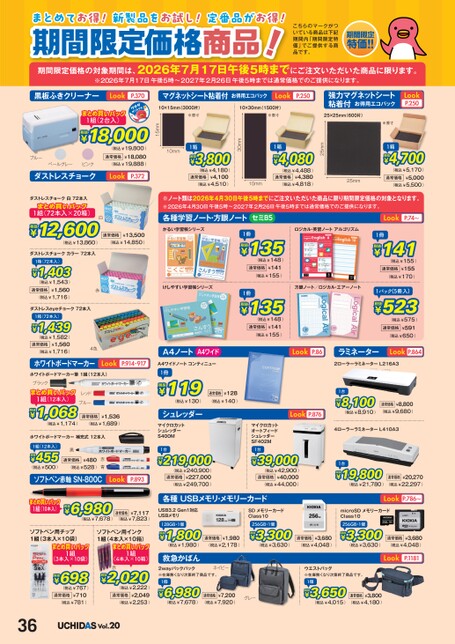 まとめてお得!新製品をお試し!定番品がお得!期間限定価格商品!商品下記期間内「期間限定特価」提供商品。期間限定価格対象期間、2026年7月17日午後5時注文商品限。※2026年7月17日午後5時〜2027年2月26日午後5時通常価格提供。黒板ふきクリーナーLookP.370マグネットシート粘着付お得用エコパックLookP.250強力マグネットシート粘着付お得用エコパックLookP.2501箱税抜¥4,700通常価格(税込¥5,170)¥5,000(税込¥5,500)25mm25mm1箱税抜¥4,080通常価格(税込¥4,488)¥4,380(税込¥4,818)10mm30mm1箱税抜¥3,800通常価格(税込¥4,180)¥4,100(税込¥4,510)※原寸※原寸25×25mm(600片)※原寸10mm15mm10×15mm(3000片)10×30mm(1500片)まとめ買いパック1組(2台入)税抜¥18,000通常価格(税込¥19,800)¥18,080(税込¥19,888)ブルーペールグレーピンクダストレスチョークLookP.372ダストレスチョーク白72本入まとめ買いパック1組(72本入×20箱)税抜¥12,600(税込¥13,860)ダストレスチョークカラー72本入1箱(72本入)税抜¥1,403通常価格(税込¥1,543)¥1,560(税込¥1,716)ダストレスeyeチョーク72本入1箱(72本入)税抜¥1,439通常価格(税込¥1,582)¥1,560(税込¥1,716)4色※類2026年4月30日午後5時注文商品限期間限定価格対象。※2026年4月30日午後5時〜2027年2月26日午後5時通常価格提供。白各種学習ノート・方眼ノートセミB5LookP.74〜通常価格¥13,500(税込¥14,850)かるい学習帳シリーズ1冊税抜¥135通常価格(税込¥148)¥141(税込¥155)赤けしやすい学習帳シリーズ1冊税抜¥135通常価格(税込¥148)¥141(税込¥155)ロジカル・英習ノートアルゴリズム方眼ノート/ロジカル・エアーノート1冊税抜¥141通常価格(税込¥155)¥155(税込¥170)1パック(5冊入)税抜¥523通常価格(税込¥575)¥591(税込¥650)A4ノートA4ワイドA4ワイドノートコンティニューLookP.86ラミネーターLookP.8642ローラーラミネーターL216A31冊税抜¥119(税込¥130)通常価格¥128(税込¥140)シュレッダーマイクロカットシュレッダーS400MLookP.876マイクロカットオートフィードシュレッダーSF402M1台税抜¥8,100(税込¥8,910)¥8,800通常価格(税込¥9,680)4ローラーラミネーターL410A31台税抜¥219,000通常価格(税込¥240,900)¥227,000(税込¥249,700)1台税抜¥39,000通常価格(税込¥42,900)¥40,000(税込¥44,000)各種USBメモリ・メモリーカードUSB3.2Gen1対応USBメモリSDメモリーカードClass10128GB・1個税抜¥1,800(税込¥1,980)通常価格¥1,980(税込¥2,178)256GB・1個税抜¥3,300(税込¥3,630)通常価格¥3,680(税込¥4,048)1台税抜¥19,800(税込¥21,780)¥20,270通常価格(税込¥22,297)LookP.786〜microSDメモリーカードClass10256GB・1個税抜¥3,300(税込¥3,630)通常価格¥3,680(税込¥4,048)LookP.1181救急かばん2wayバックパック※在庫無次第終了商品。ネイビーウエストバッグ※在庫無次第終了商品。1個税抜¥6,980(税込¥7,678)¥7,200通常価格(税込¥7,920)グレー1個税抜¥3,650(税込¥4,015)¥3,800通常価格(税込¥4,180)ホワイトボードマーカーLookP.914・917ホワイトボードマーカー筆1組(12本入)ブラックまとめ買いパック1組(12本入)¥1,068税抜(税込¥1,174)レッドブルー通常価格¥1,536(税込¥1,689)ホワイトボードマーカー補充式12本入ソフトペン赤軸SN-800CLookP.893まとめ買いパック1組(10本入)税抜¥6,980(税込¥7,678)通常価格¥7,117(税込¥7,823)赤青通常価格¥480(税込¥528)黒1組(12本入)税抜¥455(税込¥500)ソフトペン用チップ1組(3本入×10袋)まとめ買いパック(3本入×10袋)1組税抜¥698通常価格(税込¥767)¥710(税込¥781)ソフトペン用インク1組(4本入×10箱)まとめ買いパック(4本入×10箱)赤1組¥2,020税抜通常価格(税込¥2,222)¥2,049(税込¥2,253)36Vol.20