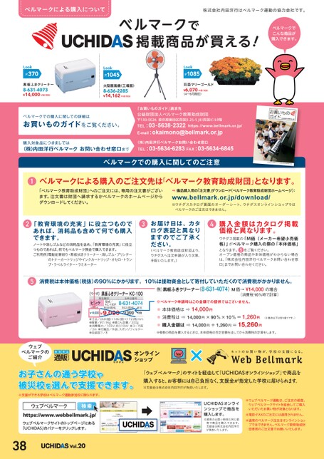 ベルマークによる購入について株式会社内田洋行はベルマーク運動の協力会社です。ベルマークで掲載商品が買える!ベルマークでこんな商品が購入できます。LookP.370黒板ふきクリーナー8-631-4073¥14,000M価(税抜)LookP.1045大型扇風機(工場扇)8-636-2285¥14,162M価(税抜)LookP.1085花苗マリーゴールド¥6,070M価(税抜)(4〜6月限定)ベルマークでの購入に関しての詳細はお買いものガイドをご覧ください。「お買いものガイド」請求先公益財団法人ベルマーク教育助成財団〒130-0026東京都墨田区両国3-25-5JEI両国ビル9階TEL:03-5638-2322E-mail:okaimono@bellmark.or.jphttps://www.bellmark.or.jp/購入対象品につきましては(株)内田洋行ベルマークお問い合わせ窓口まで(株)内田洋行ベルマークお問い合わせ窓口TEL:03-5634-6283FAX:03-5634-6845ベルマークでの購入に関してのご注意1ベルマークによる購入のご注文先は「ベルマーク教育助成財団」となります。「ベルマーク教育助成財団」へのご注文には、専用の注文書がございます。注文書は財団へ請求するかベルマークのホームページからダウンロードしてください。➡備品購入用の「注文書」ダウンロード(ベルマーク教育助成財団ホームページ):www.bellmark.or.jp/download/※ウチダスカタログ裏面のオーダーシート、ウチダスオンラインショップではベルマークのご注文はできません。2「教育環境の充実」に役立つものであれば、消耗品も含めて何でも購入できます。ノートや消しゴムなどの消耗品を含め、「教育環境の充実」に役立つものであれば、何でもベルマーク預金で購入できます。ご利用例)電動鉛筆削り・黒板拭きクリーナー・消しゴム・プリンターのトナーカートリッジやインクカートリッジ・オセロ・トランプ・ラベルライター・ラミネーター3お届け日は、カタログ表記と異なりますのでご了承ください。(ベルマーク教育助成財団より、ウチダスへ注文申請が入り次第、手配いたします。)4購入金額はカタログ掲載価格と異なります。ウチダス掲載の「M価(メーカー希望小売価格)」がベルマーク購入の際の「本体価格」となります。5をご覧ください。オープン価格の商品や本体価格がわからない場合は、「株式会社内田洋行ベルマークお問い合わせ窓口」までお問い合わせください。5消費税は本体価格(税抜)の90%にかかります。10%は援助資金として寄付していただくので消費税がかかりません。[ウチダ]黒板ふきクリーナーKC-100商品種別お申込番号8-631-4074M価税抜型式/KC-100P税抜価格ピンク¥14,00¥9,090¥9,999税込価格単位1台●寸法/260(幅)×146(奥)×172(高)mm●質量/約1.9kg●集じん容量/200g●消費電力/100V-約310W●コード長/2m●付属品/外袋、スポンジフィルター●包装数:1/8例)黒板ふきクリーナー(8-631-4074)M価→¥14,000の場合(消費税10%時で計算)※ベルマーク申請時はこの金額での提供ではございません。本体価格は➡14,000円消費税は➡14,000円×90%×10%=1,260円購入金額は➡14,000円+1,260円=15,260円(小数点以下は切り捨てです。)※複数の商品を購入するときは、本体価格の合計金額を出してから消費税の計算をします。お子さんの通う学校や被災校を選んで支援できます。※支援ができる学校はベルマーク運動参加校に限られます。ウェブベルマークhttps://www.webbellmark.jp/ウェブベルマークサイトのトップページにある「UCHIDAS」のバナーをクリックします。38Vol.20「ウェブベルマーク」のサイトを経由して「UCHIDASオンラインショップ」で商品を購入すると、お客様には自己負担なく、支援金が指定した学校に届けられます。※支援金は株式会社内田洋行が負担いたします。UCHIDASオンラインショップで商品を購入します。※通常のお買い物時と同じ価格で商品を購入できます。支援金は株式会社内田洋行が負担いたします。※ウェブベルマーク運動は、ご注文の都度、ウェブベルマークサイトを経由してご購入いただいたお買い物が対象となります。※電話・FAXのご注文には適用されません。※通常のベルマーク注文はオンラインショップではできません。ベルマーク教育助成財団専用のご注文書でお願いいたします。×オンラインショップ品育用タログ通販カ教ウェブベルマークのご紹介