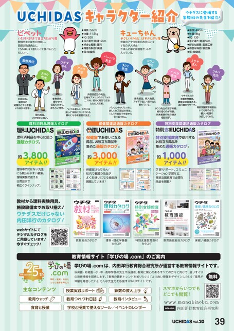 UCHIDASキャラクター紹介ウチダスに登場する各教科の先生を紹介!ピペットいたずら好きで目立ちたがり屋教頭先生とは大の仲良し。日課は教頭先生に「うめぼしを1個もらって食べること」らしい…。教頭先生タロウ先生ウチダさんアヤコ先生●体長:52cm●体重:11.5kg●IQ:200●泳ぐ速さ:時速12km●好きな授業:理科●得意な科目:英語●係:給食係バーバラ先生キューちゃんやさしいけれど、はずかしがり屋保健のアヤコ先生のお手伝いをするのが大好き!かばんの中には救急セットが入っている。ヨウコ先生タクミ先生●体長:40cm●体重:8kg●IQ:130●泳ぐ速さ:時速5km●好きな授業:図画工作●得意な科目:家庭科●係:保健係ミサキさんハルカ先生フタバ先生社会担当。雑学系の知識がとても豊富。メカは少々苦手。理科担当。メカ全般に強い。事務担当。細やかで気配りがきく。涙もろい性格。外国語担当の先生。出身はアメリカのカリフォルニア州。明るく陽気で生徒たちの人気者。“いつも優しく、ときには厳しく”相談にのってくれる、頼りになる保健室の先生。パソコンやタブレットに詳しいICT担当の先生。1人1台端末で生徒から引っ張りだこ。音楽担当。新人教師。アイデア出し・創作力に優れている。ウチダさんの後輩事務職員。趣味は文具集めと、流行物のリサーチ。ヨウコ先生の双子の姉。絵を描くのが得意。新米教師の妹の良き相談相手。特別支援教育を担当。いつも穏やかで、優しい笑顔で対応してくれる。理科消耗品通販カタログ保健関連品通販カタログ特別支援関連品通販カタログ理科消耗品中心扱通販。約3,800!!理科専門先生親編集。理科実験使日用品幅広。教材理科実験用具、施設設備取揃!内田洋行!web用意!今!保健室使商品、役立商品集通販。約3,000!!特別支援教育使用役立商品集通販。約1,000!!保健室!校内養護先生使商品掲載!学習、学習、特別支援教育必要商品掲載!教材総合カタログ理科・理化学機器カタログ特別支援教育教材カタログ教育施設総合カタログ保健/健康カタログ教育情報サイト「学びの場.com」のご案内学びの場.comは、内田洋行教育総合研究所が運営する教育情報サイトです。保育園・幼稚園・小・中・高等学校の先生や保護者、教育に関心のあるすべての方々に向けて、選りすぐりの教育情報を提供します。「教育の最新トレンドを知りたい」「より良い授業をデザインしたい」「意見や体験を発信したい」、そんな先生方を応援するWEBサイトです。無料主なコンテンツ教育ウォッチ食育と授業授業実践リポート教育つれづれ日誌算数の教え上手教育インタビュースマホからいつでもどこでも閲覧!学校と授業で使えるツール/イベントカレンダー内田洋行教育総合研究所Vol.2039