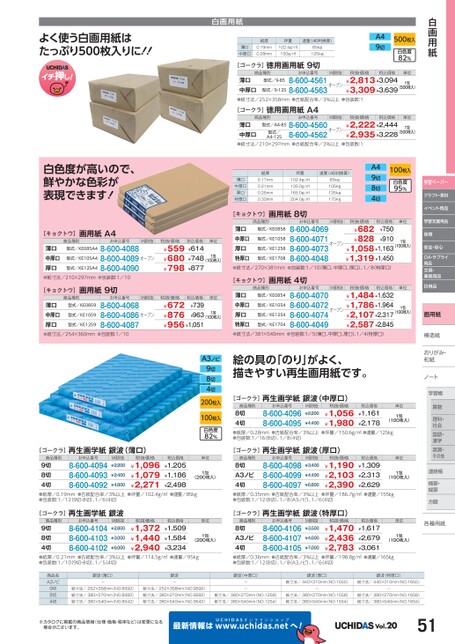 白画用紙A49切500枚入白色度82%白画用紙紙厚0.19mm0.28mm坪量連量(46判換算)102.4g/㎡150g/㎡85kg125kg薄口中厚口[ゴークラ]徳用画用紙9切商品種別お申込番号M価税抜税抜価格税込価格型式/9-85薄口中厚口●紙寸法/252×358mm●古紙配合率/3%以上●包装数:18-600-4561オープン8-600-4563型式/9-125¥2,813¥3,094¥3,309¥3,639単位1包(500枚入)[ゴークラ]徳用画用紙A4商品種別お申込番号M価税抜税抜価格税込価格型式/A4-85薄口中厚口●紙寸法/210×297mm●古紙配合率/3%以上●包装数:18-600-4560オープン8-600-4562型式/A4-125¥2,222¥2,444¥2,935¥3,228単位1包(500枚入)よく使う白画用紙はたっぷり500枚入りに!!白色度が高いので、鮮やかな色彩が表現できます!薄口中厚口厚口特厚口紙厚0.17mm0.21mm0.25mm0.33mm坪量102.4g/㎡135.0g/㎡165.0g/㎡204.0g/㎡連量(46判換算)85kg105kg125kg170kg100枚入白色度95%A49切8切4切学習ペーパークラフト・素材イベント用品単位学習支援用品[キョクトウ]画用紙A4商品種別お申込番号型式/KE085A4薄口中厚口厚口●紙寸法/210×297mm●包装数:1/108-600-40888-600-40898-600-4090型式/KE105A4型式/KE125A4[キョクトウ]画用紙9切商品種別お申込番号型式/KE0859薄口中厚口厚口●紙寸法/254×360mm●包装数:1/108-600-40688-600-40868-600-4087型式/KE1059型式/KE1259M価税抜オープン税抜価格¥559¥680¥798税込価格¥614¥748¥877単位1包(100枚入)M価税抜オープン税抜価格税込価格¥672¥739¥876¥963¥956¥1,051単位1包(100枚入)A3ノビ9切8切4切200枚入100枚入白色度82%単位[ゴークラ]再生画学紙銀波(薄口)商品種別税抜価格お申込番号M価税抜¥2,2008-600-40948-600-40938-600-40929切8切4切●紙厚/0.19mm●古紙配合率/3%以上●坪量/102.4g/㎡●連量/85kg●包装数:1/129切・8切)、1/64切)¥1,096¥1,079¥2,271¥2,400¥4,800税込価格¥1,205¥1,186¥2,4981包(200枚入)[キョクトウ]画用紙8切M価税抜商品種別税抜価格お申込番号型式/KE1058型式/KE0858薄口中厚口厚口特厚口●紙寸法/270×381mm●包装数:1/10(薄口、中厚口、厚口)、1/8特厚口)8-600-40698-600-40718-600-40738-600-4048税込価格¥750¥910¥1,058¥1,163¥1,319¥1,450¥682¥828型式/KE1708型式/KE1258オープン1包(100枚入)[キョクトウ]画用紙4切商品種別お申込番号M価税抜税抜価格税込価格単位型式/KE1054型式/KE0854薄口中厚口厚口特厚口●紙寸法/381×540mm●包装数:1/5薄口、中厚口、厚口)、1/4特厚口)8-600-40708-600-40728-600-40748-600-4049¥1,484¥1,632¥1,786¥1,964¥2,107¥2,317¥2,587¥2,845型式/KE1254型式/KE1704オープン1包(100枚入)絵の具の「のり」がよく、描きやすい再生画用紙です。[ゴークラ]再生画学紙銀波(中厚口)税抜価格M価税抜¥2,200商品種別お申込番号8-600-40968-600-40958切4切●紙厚/0.28mm●古紙配合率/3%以上●坪量/150.6g/㎡●連量/125kg●包装数:1/168切)、1/8(4切)¥1,056¥1,980¥4,400税込価格¥1,161¥2,178単位1包(100枚入)[ゴークラ]再生画学紙銀波(厚口)商品種別税抜価格お申込番号M価税抜¥3,4008-600-40988-600-40998-600-40978切A3ノビ4切●紙厚/0.35mm●古紙配合率/3%以上●坪量/186.7g/㎡●連量/155kg●包装数:1/128切)、1/8(A3ノビ)、1/6(4切)¥1,190¥2,103¥2,390¥4,400¥6,800税込価格¥1,309¥2,313¥2,629単位1包(100枚入)保育安全・安心OA・サプライ用品文具・事務用品日用品画用紙模造紙模造紙おりがみ・おりがみ・和紙和紙ノートノート学習帳習帳学習算数理科・社会国語・漢字英習・その他連絡帳絡帳横罫・罫・縦罫縦罫方眼眼[ゴークラ]再生画学紙銀波商品種別税抜価格お申込番号M価税抜¥2,8008-600-41048-600-41038-600-41029切8切4切●紙厚/0.21mm●古紙配合率/3%以上●坪量/114.5g/㎡●連量/95kg●包装数:1/109切・8切)、1/54切)¥1,372¥1,440¥2,940¥3,000¥6,000税込価格¥1,509¥1,584¥3,234単位1包(200枚入)[ゴークラ]再生画学紙銀波(特厚口)商品種別税抜価格お申込番号M価税抜¥3,5008-600-41068-600-41078-600-41058切A3ノビ4切●紙厚/0.36mm●古紙配合率/3%以上●坪量/198.8g/㎡●連量/165kg●包装数:1/128切)、1/8(A3ノビ)、1/6(4切)¥1,470¥2,436¥2,783¥4,600¥7,000税込価格¥1,617¥2,679¥3,061単位各種用紙種1包(100枚入)商品名A3ノビ9切8切4切銀波(薄口)ー銀波ー紙寸法/252×358mm(NO.8592)紙寸法/380×270mm(NO.8582)紙寸法/380×540mm(NO.8542)紙寸法/252×358mm(NO.9592)紙寸法/380×270mm(NO.9582)紙寸法/380×540mm(NO.9542)銀波(中厚口)ーー銀波(厚口)銀波(特厚口)紙寸法/440×310mm(NO.1555)紙寸法/440×310mm(NO.1655)ーー紙寸法/380×270mm(NO.1258)紙寸法/380×540mm(NO.1254)紙寸法/380×270mm(NO.1558)紙寸法/380×540mm(NO.1554)紙寸法/380×270mm(NO.1658)紙寸法/380×540mm(NO.1654)※カタログに掲載の商品情報(仕様・価格・税率など)は変更になる場合がございます。最新情報はUCHIDASww.uchidas.netwへ!Vol.2051