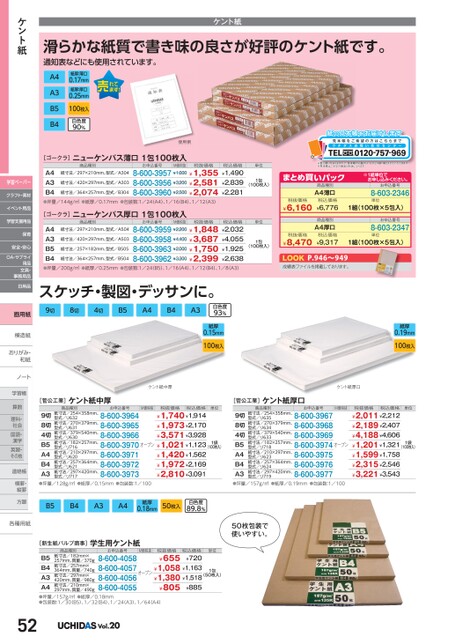 ケント紙滑らかな紙質で書き味の良さが好評のケント紙です。通知表などにも使用されています。A4A3B5B4紙厚:薄口0.17mm紙厚:厚口0.25mm100枚入白色度90%使用例[ゴークラ]ニューケンパス薄口1包100枚入商品種別お申込番号M価税抜税抜価格紙寸法/420×297mm、型式/A303紙寸法/297×210mm、型式/A304A4A3B4●坪量/144g/㎡●紙厚/0.17mm●包装数:1/24(A4)、1/16(B4)、1/12(A3)8-600-3957¥1,600¥1,3558-600-3956¥3,200¥2,5818-600-3960¥2,500¥2,074紙寸法/364×257mm、型式/B304[ゴークラ]ニューケンパス厚口1包100枚入M価税抜商品種別お申込番号紙寸法/420×297mm、型式/A503紙寸法/297×210mm、型式/A504税込価格¥2,032A4¥4,055A3¥1,925B5¥2,638B4●坪量/200g/㎡●紙厚/0.25mm●包装数:1/24(B5)、1/16(A4)、1/12(B4)、1/8A3)8-600-3959¥2,200¥1,8488-600-3958¥4,400¥3,6878-600-3963¥2,000¥1,7508-600-3962¥3,300¥2,399紙寸法/364×257mm、型式/B504紙寸法/257×182mm、型式/B505税抜価格スケッチ・製図・デッサンに。9切8切4切B5A4B4A3白色度93%紙の見本帳をお届けします紙本見本帳をご希望の方はこちらまでウーチダ問スお合せいセンタTEL0120-757-969※数に限りがありますので、見本帳のお届けは、おひとり様1冊とさせていただきます。※見本帳はご注文の商品と別送になります。商品種別A4薄口税込価格¥6,776商品種別A4厚口税込価格¥9,317※1組単位申込。お申込番号8-603-2346単位1組(100枚×5包入)お申込番号8-603-2347単位1組(100枚×5包入)税込価格¥1,490¥2,839¥2,281単位1包(100枚入)まとめ買いパック税抜価格¥6,160単位1包(100枚入)税抜価格¥8,470LOOK成績表ファイルを掲載しております。P.946〜949紙厚0.15mm100枚入紙厚0.19mm100枚入ケント紙中厚ケント紙厚口[菅公工業]ケント紙中厚[菅公工業]ケント紙厚口商品種別お申込番号M価税抜税抜価格税込価格単位商品種別お申込番号M価税抜税抜価格税込価格単位紙寸法/254×358mm、型式/リ632紙寸法/270×379mm、型式/リ631紙寸法/379×540mm、型式/リ630紙寸法/182×257mm、型式/リ716紙寸法/210×297mm、型式/リ620紙寸法/257×364mm、型式/リ621紙寸法/297×420mm、型式/リ7179切8切4切B5A4B4A3●坪量/128g/㎡●紙厚/0.15mm●包装数:1/1008-600-39648-600-39658-600-39668-600-39708-600-39718-600-39728-600-3973オープン¥1,740¥1,914¥1,973¥2,170¥3,571¥3,928¥1,021¥1,123¥1,420¥1,562¥1,972¥2,169¥2,810¥3,0911袋(100枚入)紙寸法/254×358mm、型式/リ635紙寸法/270×379mm、型式/リ634紙寸法/379×540mm、型式/リ633紙寸法/182×257mm、型式/リ718紙寸法/210×297mm、型式/リ623紙寸法/257×364mm、型式/リ624紙寸法/297×420mm、型式/リ7199切8切4切B5A4B4A3●坪量/157g/㎡●紙厚/0.19mm●包装数:1/1008-600-39678-600-39688-600-39698-600-39748-600-39758-600-39768-600-3977オープン¥2,011¥2,212¥2,189¥2,407¥4,188¥4,606¥1,201¥1,321¥1,599¥1,758¥2,315¥2,546¥3,221¥3,5431袋(100枚入)B5B4A3A4紙厚0.18mm50枚入白色度89.8%50枚包装で使いやすい。単位[新生紙パルプ商事]学生用ケント紙商品種別お申込番号M価税抜紙寸法/182mm×257mm、質量/370g紙寸法/257mm×364mm、質量/740g紙寸法/297mm×420mm、質量/980g紙寸法/210mm×297mm、質量/490gB5B4A3A4●坪量/157g/㎡●紙厚/0.18mm●包装数:1/30B5)、1/32(B4)、1/24(A3)、1/64(A4)8-600-40588-600-40578-600-40568-600-4055オープン税抜価格¥655税込価格¥720¥1,058¥1,163¥1,380¥1,518¥885¥8051包(50枚入)52Vol.20ケント紙学習ペーパークラフト・素材イベント用品学習支援用品保育安全・安心OA・サプライ用品文具・事務用品日用品画用紙模造紙模造紙おりがみ・おりがみ・和紙和紙ノートノート学習帳学帳算数算理科・社会国語・漢字英習・その他その他連絡帳連帳横罫・横・縦罫縦罫方眼眼各種用紙各種用