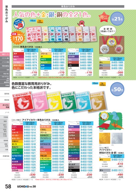 全21色金・銀・銅3色揃ってます!!サイズ単位作品例色きんぎんどうM価税抜税抜価格税込価格15×15cm1冊(100枚入)8-602-18898-602-18908-602-1891オープン¥350¥385人気の色+金・銀・銅の全21色。の2単色おりがみ15cm1色/100枚入1701冊たり税込¥187税抜¥お得[ウチダ]単色おりがみ100枚入サイズ単位色あかぼたんももうすももきだいだいだいだいM価税抜税抜価格税込価格15×15cm1冊(100枚入)8-602-18718-602-18728-602-18738-602-18748-602-18758-602-1876オープン¥170¥187サイズ単位色クリームきみどりきみどりあおみずM価税抜税抜価格税込価格15×15cm1冊(100枚入)8-602-18778-602-18788-602-18798-602-18808-602-18818-602-1882オープン¥170¥187サイズ単位色うすみずむらさきふじちゃくろしろM価税抜税抜価格税込価格15×15cm1冊(100枚入)8-602-18838-602-18848-602-18858-602-18868-602-18878-602-1888オープン¥170¥187●紙厚/0.07mm●包装数:1/10※表組の色見本は、実物の色とは印刷の都合上異なる場合があります。●紙厚/0.05mm●包装数:1/10色数豊富な教育用おりがみ。色にこだわった本格派です。15cm1色/100枚入全50色[エヒメ紙工]アイアイカラー単色おりがみ100枚入サイズ単位色しんくあかしゅいろだいだいきだいだいひまわりきいろきみどりみどりビリジャンコバルトブルーあおむらさきあかむらさきぼたんうすももM価税抜税抜価格税込価格15×15cm1冊(100枚入)8-602-15128-602-15138-602-15148-602-15158-602-15168-602-15178-602-15188-602-15198-602-15208-602-15218-602-15228-602-15238-602-15248-602-15258-602-15268-602-1527オープン¥230¥253サイズ単位色うすだいだいくちなしクリームわかみどりアイスグリーンみずわすれなぐさふじさんごにんじんやまぶきレモンイエローエメラルドグリーンあおみどりあさぎそらM価税抜税抜価格税込価格15×15cm1冊(100枚入)8-602-15288-602-15298-602-15308-602-15318-602-15328-602-15338-602-15348-602-15358-602-15368-602-15378-602-15388-602-15398-602-15408-602-15418-602-15428-602-1543オープン¥230¥253サイズ単位色すみれももあかちゃこげちゃちゃいろこはくおうどオリーブピーコックグリーンピーコックブルーあいワインレッドしろぎんねずねずみくろM価税抜税抜価格税込価格15×15cm1冊(100枚入)8-602-15448-602-15458-602-15468-602-15478-602-15488-602-15498-602-15508-602-15518-602-15528-602-15538-602-15548-602-15558-602-15568-602-15578-602-15588-602-1559オープン¥230¥253作品例ぎんきん[エヒメ紙工]アイアイカラー単色おりがみ(金・銀)100枚入サイズ単位色きんM価税抜税抜価格税込価格ぎんM価税抜税抜価格税込価格15×15cm1冊(100枚入)8-602-1510オープン¥510¥5618-602-1511オープン¥480¥528単色おりがみ学習ペーパークラフト・素材イベント用品学習支援用品保育安全・安心OA・サプライ用品文具・事務用品日用品画用紙画用紙模造紙模造紙おりがみ・和紙ノートノート学習帳学帳算数算理科・社会国語・漢字英習・その他その他連絡帳連帳横罫・横・縦罫縦罫方眼眼各種用紙各種用●紙厚/0.08mm●包装数:1/10※表組の色見本は、実物の色とは印刷の都合上異なる場合があります。●紙厚/0.08mm●包装数:1/1058Vol.20