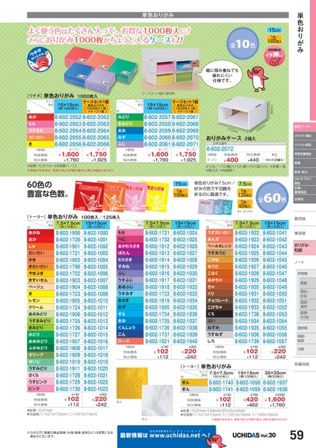単色おりがみ15cm1色/1000枚入全10色単色おりがみよく使う色たくさん入って、お得な1000枚入に!はちょうど入るケースも!!さらにおりがみ1000枚が学習ペーパークラフト・素材イベント用品学習支援用品保育安全・安心OA・サプライ用品文具・事務用品日用品画用紙用模造紙模造紙おりがみ・和紙ノートノート学習帳習帳学習算数理科・社会国語・漢字英習・その他連絡帳絡帳横罫・罫・縦罫縦罫方眼眼各種用紙種90mm170mmmm551おりがみケース2個入お申込番号8-602-2072税抜価格¥400M価税抜オープン●寸法/170(幅)×155(奥)×90(高)mm●材質/紙●組立式●包装数:1税込価格¥4401セット(2個入)単位色みどりきみどりあおみずふじサイズ単位15×15cm1冊(1000枚入)ケースセット1組1000枚入1冊単色おりがみ+ケース1個8-602-20578-602-20678-602-20588-602-20688-602-20598-602-20698-602-20608-602-20708-602-20618-602-2071オープン¥1,600¥1,760オープン¥1,750¥1,925縦に積み重ねても崩れにくい仕様です。ケースセット4組の使用例15cm1色/100枚入単色おりがみ7.5cm!好みの色で千羽鶴を折るのに最適です。7.5cm1色/125枚入1色/60枚入きん・ぎんのみ全60色7.5×7.5cm1冊(125枚入)8-602-17318-602-17328-602-19128-602-19138-602-19148-602-19158-602-19168-602-19178-602-19188-602-17338-602-19198-602-19208-602-17348-602-17358-602-17368-602-17378-602-1921¥102¥112¥14015×15cm1冊(100枚入)8-602-10248-602-10258-602-10268-602-10278-602-10288-602-10298-602-10308-602-10318-602-10328-602-10338-602-10348-602-10358-602-10368-602-10378-602-10388-602-10398-602-1040¥220¥242¥350サイズ単位色うすだいだいあんずペールオレンジうすおうどこがねおうどこはくあかちゃちゃくりチョコレートこげちゃくろはいねずみうすねずしろM価税抜税抜価格税込価格色サイズ単位1冊(60枚入)[トーヨー]単色おりがみ7.5×7.5cm8-602-17408-602-1741¥102¥112税抜価格税込価格きんぎんM価税抜¥1407.5×7.5cm1冊(125枚入)8-602-19228-602-19238-602-19248-602-19258-602-19268-602-19278-602-19288-602-19298-602-19308-602-19318-602-19328-602-19338-602-17388-602-19348-602-19358-602-19368-602-1739¥102¥112¥14015×15cm1冊(100枚入)8-602-10418-602-10428-602-10438-602-10448-602-10458-602-10468-602-10478-602-10488-602-10498-602-10508-602-10518-602-10528-602-10538-602-10548-602-10558-602-10568-602-1057¥220¥242¥35015×15cm1冊(100枚入)8-602-10588-602-1059¥420¥462¥70035×35cm1冊(50枚入)8-602-19378-602-1938¥1,600¥1,760¥2,000[ウチダ]単色おりがみ1000枚入サイズ単位15×15cm1冊(1000枚入)ケースセット1組1000枚入1冊単色おりがみ+ケース1個色あかももうすももだいだいきM価税抜税抜価格税込価格8-602-20528-602-20628-602-20538-602-20638-602-20548-602-20648-602-20558-602-20658-602-20568-602-2066オープン¥1,600¥1,760オープン¥1,750¥1,925●紙厚/0.07mm●包装数:1/12※表組の色見本は、実物の色とは印刷の都合上異なる場合があります。60色の豊富な色数。[トーヨー]単色おりがみ100枚入/125枚入サイズ単位色あかねあかしゅだいだいかききだいだいやまぶききすいせんベージュきレモンクリームあさみどりうすきみどりきみどりみどりあおみどりふかみどりオリーブせいじうすみどりさくらうすピンクピンクM価税抜税抜価格税込価格7.5×7.5cm1冊(125枚入)8-602-19008-602-17208-602-19018-602-17218-602-19028-602-17908-602-17228-602-19038-602-19048-602-17238-602-19058-602-17248-602-19068-602-17258-602-17268-602-17278-602-19078-602-19088-602-19098-602-19108-602-19118-602-17288-602-17298-602-1730¥102¥112¥14015×15cm1冊(100枚入)8-602-10008-602-10018-602-10028-602-10038-602-10048-602-10058-602-10068-602-10078-602-10088-602-10098-602-10108-602-10118-602-10128-602-10138-602-10148-602-10158-602-10168-602-10178-602-10188-602-10198-602-10208-602-10218-602-10228-602-1023¥220¥242¥350M価税抜税抜価格税込価格サイズ単位色ももべにあかむらさきぼたんむらさきすみれふじうすふじあおふじうすみずあさぎみずそらあおぐんじょうこんローズM価税抜税抜価格税込価格きん●紙厚/0.07mm●包装数:1/57.5×7.5cm)、1/10(15×15cm)ぎん●紙厚/0.07mm、0.04mm(35×35cmのみ)●包装数:1/5(7.5×7.5cm)、1/10(15×15cm)、1/3(35×35cm)※表組の色見本は、実物の色とは印刷の都合上異なる場合があります。※カタログに掲載の商品情報(仕様・価格・税率など)は変更になる場合がございます。最新情報はUCHIDASww.uchidas.netwへ!Vol.2059