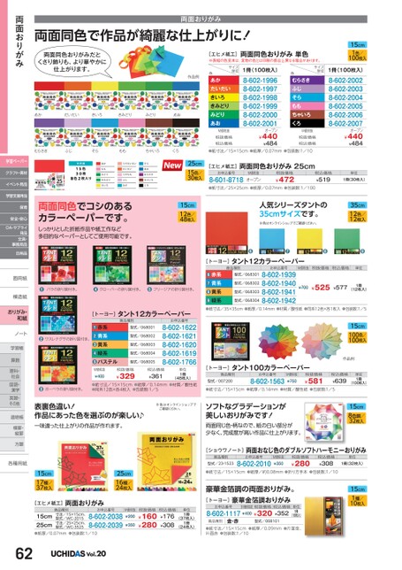 ●紙寸法/35×35cm●紙厚/0.14mm●材質/酸性紙●同系12色×各1枚入●包装数:1/5[トーヨー]タント100カラーペーパー商品種別型式/007200お申込番号8-602-1563M価税抜¥750税抜価格¥58115cm100色/100枚入作品例税込価格¥639単位1冊(100枚入)●紙寸法/15×15cm●紙厚/0.14mm●材質/酸性紙●包装数:1/5ソフトなグラデーションが美しいおりがみです!両面同じ色・柄なので、紙の白い部分が少なく、完成度が高い作品に仕上がります。15cm8色調/32枚入[ショウワノート]両面おなじ色のダブルソフトハーモニーおりがみ商品種別型式/23-1523お申込番号8-602-2010M価税抜¥350税抜価格¥280税込価格¥308●紙寸法/15×15cm●紙厚/約0.08mm●折り方手本●包装数:1/10単位1冊(32枚入)15cm1種/10枚入豪華金箔調の両面おりがみ。[トーヨー]豪華金箔調おりがみお申込番号M価税抜税抜価格税込価格8-602-1117¥400¥320¥352単位1冊(10枚入)商品種別金・赤型式/008101●紙寸法/15×15cm●紙厚/0.09mm●片面金、片面赤●包装数:1/10両面同色で作品が綺麗な仕上がりに!両面おりがみ両面同色おりがみだとくさり飾りも、より華やかに仕上がります。作品例あかだいだいきいろきみどりみどりあお[エヒメ紙工]両面同色おりがみ単色※表組の色見本は、実物の色とは印刷の都合上異なる場合があります。サイズ単位色あかだいだいきいろきみどりみどりあおM価税抜税抜価格税込価格1冊(100枚入)8-602-19968-602-19978-602-19988-602-19998-602-20008-602-2001オープン¥440¥484サイズ単位色むらさきふじそらももちゃいろくろM価税抜税抜価格税込価格むらさきふじそらももちゃいろくろ●紙寸法/15×15cm●紙厚/0.07mm●包装数:1/1015cm1色/100枚入1冊(100枚入)8-602-20028-602-20038-602-20048-602-20058-602-20068-602-2007オープン¥440¥48425cm15色/30枚入15cm12色/48枚入両面同色でコシのあるカラーペーパーです。しっかりとした折紙作品や紙工作など多目的なペーパーとしてご使用可能です。[エヒメ紙工]両面同色おりがみ25cmお申込番号8-601-8718M価税抜オープン税抜価格¥472税込価格¥519●紙寸法/25×25cm●紙厚/0.07mm●包装数:1/100人気シリーズタントの35cmサイズです。※色はオンラインショップでご確認ください。単位1冊(30枚入)35cm12色/12枚入●●●●[トーヨー]タント12カラーペーパー商品種別M価税抜税抜価格税込価格単位¥700¥525¥5771冊(12枚入)型式/068301型式/068302型式/068303型式/068304お申込番号8-602-19398-602-19408-602-19418-602-1942赤系青系黄系緑系●●●●●バラの折り図付き。●クローバーの折り図付き。●フリージアの折り図付き。[トーヨー]タント12カラーペーパー商品種別型式/068001型式/068002型式/068003型式/068004型式/068005お申込番号8-602-16228-602-16218-602-16208-602-16198-602-1766赤系青系黄系緑系パステル●●●●●●ワスレナグサの折り図付き。M価税抜¥400税抜価格¥329税込価格¥361単位1冊(48枚入)●紙寸法/15×15cm●紙厚/0.14mm●材質/酸性紙●同系12色×各4枚入●包装数:1/5●ガーベラの折り図付き。表裏色違い!作品にあった色を選ぶのが楽しい♪一味違った仕上がりの作品が作れます。※色はオンラインショップでご確認ください。15cm17種/37枚入25cm16種/24枚入[エヒメ紙工]両面おりがみ商品種別寸法/15×15cm、型式/WC-2015寸法/25×25cm、型式/WC-352515cm25cm●紙厚/0.07mm●包装数:1/10お申込番号8-602-20388-602-2039M価税抜¥200¥350税抜価格¥160¥280税込価格¥176¥30862Vol.20単位1冊1冊(37枚入)(24枚入)両面おりがみ学習ペーパークラフト・素材イベント用品学習支援用品保育安全・安心OA・サプライ用品文具・事務用品日用品画用紙画用紙模造紙模造紙おりがみ・和紙ノートノート学習帳学帳算数算理科・社会国語・漢字英習・その他その他連絡帳連帳横罫・横・縦罫縦罫方眼眼各種用紙各種用