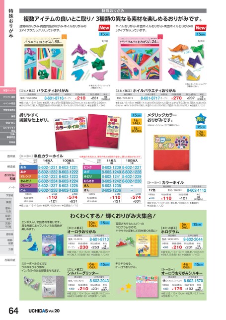 特殊おりがみ複数アイテムの良いとこ取り!3種類の異なる素材を楽しめるおりがみです。通常のおりがみ・両面同色おりがみ・ホイルおりがみの3タイプがたっぷり入っています。ホイルおりがみ・片面ホイルおりがみ・両面ホイルおりがみの3タイプが入っています。15cm制作例15cm制作例[エヒメ紙工]商品種別型式/VAR-2450バラエティおりがみお申込番号M価税抜8-601-8716オープン※色はオンラインショップでご確認ください。税抜価格¥210税込価格¥231単位1冊(50枚入)●紙寸法/15×15cm●紙厚/おりがみ・両面同色:0.07mm、ホイルおりがみ:0.05mm●おりがみ32枚入/両面同色おりがみ8枚入/ホイルおりがみ10枚入●包装数:1/240折りやすく綺麗な仕上がり。※色はオンラインショップでご確認ください。ホイルバラエティおりがみ[エヒメ紙工]商品種別型式/FVA-3015お申込番号M価税抜8-601-8717オープン税抜価格¥270税込価格¥297単位1冊(24枚入)●紙寸法/15×15cm●紙厚/ホイルおりがみ:0.05mm、片面ホイルおりがみ:0.08mm、両面ホイルおりがみ:0.06mm●ホイルおりがみ10枚入/片面ホイルおりがみ7枚入/両面ホイルおりがみ7枚入●包装数:1/320メタリックカラーおりがみです。※色はオンラインショップでご確認ください。15cm1色/14枚入1色/100枚入15cm12色/12枚入[トーヨー]単色カラーホイル色枚数単位14枚入1冊100枚入1冊あおあかオレンジきみどりグレープこん8-602-12218-602-12228-602-12238-602-12248-602-12258-602-1226¥574¥631●紙寸法/15×15cm●紙厚/0.04mm●包装数:1/108-602-12318-602-12328-602-12338-602-12348-602-12378-602-1238¥110¥121税抜価格税込価格M価税抜¥150¥700※表組の色見本は、実物の色とは印刷の都合上異なる場合があります。枚数単位色ピンクみずみどりむらさききんぎんM価税抜税抜価格税込価格14枚入1冊8-602-12398-602-12408-602-12418-602-12428-602-12358-602-1236¥110¥121¥150100枚入1冊8-602-12278-602-12288-602-12298-602-1230--¥574¥631¥700[トーヨー]カラーホイル12色M価税抜¥150商品種別型式/008001お申込番号8-602-1112税抜価格¥110税込価格¥121単位1冊(12枚入)●紙寸法/15×15cm●紙厚/0.04mm●裏面白●包装数:1/20エンボス入りで独特の手触りです。見る角度によっていろいろな発色が楽しめます。ミラーボールのようなラメのキラキラ感が、インパクトのある印象を与えます。わくわくする!輝くおりがみ大集合!10色/10枚入[エヒメ紙工]オーロラおりがみ15cm商品種別型式/O-3015お申込番号8-601-8713両面どちらもシルバーのホログラムなので、キラキラと反射して目を惹く作品に![エヒメ紙工]ホログラム商品種別型式/HOR-30155色/5枚入15cmお申込番号8-602-2044税抜価格¥230M価税抜オープン●紙寸法/15×15cm●紙厚/0.08mm●10枚入(10色各1枚)●包装数:1/240税込価格¥253(10枚入)単位1冊M価税抜¥300税抜価格¥210税込価格¥231単位1冊(5枚入)●紙寸法/15×15cm●紙厚/0.05mm●5枚入(5色各1枚)●包装数:1/4006柄/6枚入15cmキラキラ光る、オーロラおりがみ。[エヒメ紙工]シルバーグリッター商品種別型式/SIG-3015M価税抜¥300税抜価格¥210お申込番号8-602-2043税込価格¥231単位1冊(6枚入)4色/8枚入15cm[トーヨー]オーロラおりがみシルキー商品種別4色(ピンク、オレンジ、ブルー、イエロー)M価税抜¥220税抜価格¥176お申込番号8-602-1570税込価格¥193単位1冊(8枚入)特殊おりがみ学習ペーパークラフト・素材イベント用品学習支援用品保育安全・安心OA・サプライ用品文具・事務用品日用品画用紙画用紙模造紙模造紙おりがみ・和紙ノートノート学習帳学帳算数算理科・社会国語・漢字英習・その他その他連絡帳連帳横罫・横・縦罫縦罫方眼眼各種用紙各種用●紙寸法/15×15cm●紙厚/0.02mm●6枚入(6柄各1枚)●包装数:1/360●紙寸法/15×15cm●紙厚/0.11mm●包装数:1/1064Vol.20