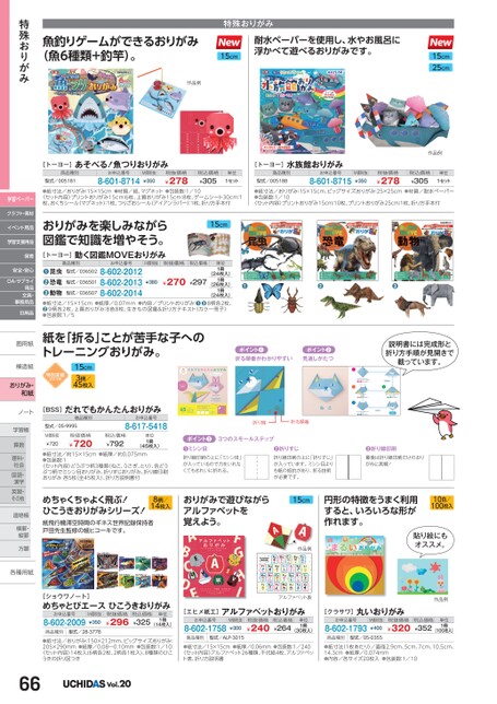 魚釣りゲームができるおりがみ(魚6種類+釣竿)。15cm耐水ペーパーを使用し、水やお風呂に浮かべて遊べるおりがみです。特殊おりがみ作品例15cm25cm作品例[トーヨー]あそべる!魚つりおりがみ[トーヨー]水族館おりがみ商品種別型式/005181お申込番号8-601-8714M価税抜¥350税抜価格¥278税込価格¥305単位1セット商品種別型式/005188お申込番号8-601-8715M価税抜¥350税抜価格¥278税込価格¥305単位1セット●紙寸法/おりがみ:15×15cm●材質/紙、マグネット●包装数:1/10〈セット内容〉プリントおりがみ15cm:6枚、上質おりがみ15cm:8枚、ゲームシート30cm:1枚、おくちシール(マグネット):1枚、つりざおシール(アイアンラバー)1枚、折り方手本付●紙寸法/おりがみ:15×15cm、ビッグサイズおりがみ:25×25cm●材質/耐水ペーパー●包装数:1/10〈セット内容〉プリントおりがみ15cm:10枚、プリントおりがみ25cm:1枚、折り方手本付紙を「折る」ことが苦手な子へのトレーニングおりがみ。15cm3柄/45枚入ポイント❶折る順番がわかりやすいポイント❷見通しがたつ説明書には完成形と折り方手順が見開きで載っています。[BSS]だれでもかんたんおりがみ商品種別型式/05-9995M価税抜¥720税抜価格¥720お申込番号8-617-5418税込価格¥792単位1冊(45枚入)●紙寸法/約15×15cm●紙厚/約0.075mm●包装数:1〈セット内容〉どうぶつ柄3種類(ねこ、うさぎ、とり)、各どうぶつ柄でミシン目おりがみ、折りすじおりがみ、折り線印刷おりがみ各5枚(全45枚入)、折り方説明書付ねこ折り線折る順番ポイント❸3つのスモールステップ❶ミシン目折り線印刷の上に「ミシン目」が入っているので力をいれなくてもきれいに折れる。❷折りすじ折り線印刷の上に「折りすじ」が入っています。ミシン目よりも紙の抵抗があり、折る技術が必要です。❸折り線印刷最後は折り線印刷だけのおりがみに挑戦!めちゃくちゃよく飛ぶ!ひこうきおりがみシリーズ!8柄/14枚入紙飛行機滞空時間のギネス世界記録保持者戸田先生監修の紙ヒコーキです。おりがみで遊びながらアルファベットを覚えよう。15cm作品例円形の特徴をうまく利用すると、いろいろな形が作れます。10色/100枚入貼り絵にもオススメ。●●●おりがみを楽しみながら図鑑で知識を増やそう。[トーヨー]動く図鑑MOVEおりがみ15cmM価税抜税抜価格税込価格¥380¥270¥297単位1冊1冊1冊(24枚入)(26枚入)お申込番号8-602-20128-602-20138-602-2014商品種別型式/036502型式/036501型式/036507昆虫恐竜動物❷●●(24枚入)●紙寸法/15×15cm●紙厚/0.07mm●内容/プリントおりがみ:❶❸8柄各2枚、❷9柄各2枚、上質おりがみ:8色8枚、生きもの図鑑&折り方テキスト(カラー冊子)●包装数:1/5特殊おりがみ学習ペーパークラフト・素材イベント用品学習支援用品保育安全・安心OA・サプライ用品文具・事務用品日用品画用紙画用紙模造紙模造紙おりがみ・和紙ノートノート学習帳学帳算数算理科・社会国語・漢字英習・その他その他連絡帳連帳横罫・横・縦罫縦罫方眼眼各種用紙各種用[ショウワノート]めちゃとびエースひこうきおりがみお申込番号8-602-2009M価税抜¥350商品種別型式/28-3778税抜価格¥296税込価格¥325単位1冊(14枚入)●紙寸法/おりがみ:150×212mm、ビッグサイズおりがみ:205×290mm●紙厚/0.08〜0.10mm●包装数:1/10〈セット内容〉14枚入(6柄各2枚、2柄各1枚入)、8種類のひこうきの折り図つき66Vol.20アルファベット表作品例[エヒメ紙工]アルファベットおりがみお申込番号8-602-1758M価税抜¥300税抜価格¥240税込価格¥264単位1冊(30枚入)商品種別型式/ALP-3015丸いおりがみ[クラサワ]お申込番号8-602-1793商品種別型式/05-0355M価税抜¥400税抜価格¥320税込価格¥352単位1冊(100枚入)●紙寸法/15×15cm●紙厚/0.06mm●包装数:1/240〈セット内容〉アルファベット26種類、千代紙4枚、アルファベット表、折り方説明書●紙寸法(1枚あたり)/直径2.9cm、5cm、7cm、10.5cm、14.3cm●紙厚/0.074mm●内容/各サイズ20枚入●包装数:1/10