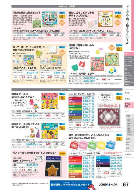 光沢のあるメタリックカラー。15cm1色/20枚入画用紙用模造紙模造紙タックシール[エヒメ紙工]タックシールホイル商品種別あかぼたんだいだいみどりきみどりあおむらさききんぎんお申込番号8-602-11348-602-11358-602-11368-602-11378-602-11388-602-11398-602-11408-602-11418-602-1142おりがみ・切り絵・タックシール14.8cm9色/27枚入単位1冊(27枚入)14.8cm30色/30枚入学習ペーパークラフト・素材イベント用品B学習支援用品だれでも簡単に折れるおりがみ。手順は1〜5回でできる簡単なおりがみ。優しい折り線付きで30柄(58種)と種類も豊富。組合せ自由にオリジナルの作品を作れます。作品例おりがみ・切り絵15cm30柄/30枚入簡単に切ることができるデザインの切り絵。難しい柄を省いた簡単に切ることができる切り絵。切った紙を貼り付けてオリジナル作品を作ろう♪[エヒメ紙工]つくってあそぶとってもかんたんおりがみ(おさんぽ編)商品種別型式/KOS-4015お申込番号M価税抜8-601-8708オープン税抜価格¥330税込価格¥363単位1冊(30枚入)[エヒメ紙工]はじめてのきりえいろがみ14.8cm商品種別型式/HKR-3515お申込番号M価税抜8-601-8709オープン税抜価格¥285税込価格¥313●紙寸法/15×15cm●紙厚/0.07mm●包装数:1/10※柄はオンラインショップでご覧ください。●紙寸法/14.8×14.8cm●紙厚/0.07mm●包装数:1/10※色はオンラインショップでご覧ください。折って、切って、シールを貼ったりお絵かきができます。●30種類30枚入り。●シール付き。作品例線にそって切るだけ!15cm切り絵が簡単に楽しめるいろがみ♪●裏面の実線をはさみで切ると作品が完成します。●手先を細かく動かすことで想像力や集中力を養えます。[トーヨー]はじめてのきりえあそび[トーヨー]たのしいきりえあそび商品種別型式/007039お申込番号8-602-1747商品種別型式/007040お申込番号8-602-1748M価税抜¥220税抜価格¥187税込価格¥205単位1冊(30種入)M価税抜¥220税抜価格¥187税込価格¥205単位1冊(30種入)●紙寸法/15×15cm●紙厚/0.07mm●包装数:1/10●紙寸法/15×15cm●紙厚/0.07mm●包装数:1/10作品例A[エヒメ紙工]切り絵いろがみ商品種別お申込番号M価税抜税抜価格税込価格単位型式/KRI-2415AAB●紙寸法/14.8×14.8cm●紙厚/0.07mm●30枚入(各色1枚)●包装数:1/2408-602-20368-602-2037¥192型式/KRI-2415B¥211¥2401冊(30枚入)保育安全・安心OA・サプライ用品文具・事務用品日用品裏面がシールになっているいろがみ!好きな形に切ってオリジナルシール作り♪作品例[エヒメ紙工]いろがみシール商品種別型式/CS-2215お申込番号8-602-204015cm15色/15枚入M価税抜¥220税抜価格¥162税込価格¥178単位1冊(15枚入)●紙寸法/15×15cm●紙厚/0.15mm●15枚入(各色1枚入)●包装数:1/240裏面がシールになっているホイルいろがみ!15cm9色/12枚入作品例[エヒメ紙工]ホイルシール商品種別型式/FS-2215お申込番号8-602-2041M価税抜¥220税抜価格¥162税込価格¥178単位1冊(12枚入)●紙寸法/15×15cm●紙厚/0.15mm●12枚入(9色)●包装数:1/240ポスターから貼り絵までいろいろ使える!ウラ面のり付き。[エヒメ紙工]型抜いろがみホイル商品種別お申込番号8-603-2026ほしM価税抜¥200税抜価格¥151税込価格¥166単位1冊(10枚入)●紙寸法/約67×67mm●紙厚/0.1mm●質量/約18g●色/金、銀各5枚●裏面のり付●包装数:1/10税抜価格¥283M価税抜オープン(20枚入)●紙寸法/15×15cm●紙厚/0.17mm●包装数:1/10税込価格¥311単位1冊※表組の色見本は、実物の色とは印刷の都合上異なる場合があります。場所、素材を問わず、いろんなところに切って貼って、楽しめます。15cm1色/20枚入あかももいろきみどりきいろそら10枚入[エヒメ紙工]タックシールいろがみ※表組の色見本は、実物の色とは印刷の都合上異なる場合があります。お申込番号商品種別商品種別あかだいだいももいろみどりきみどりきいろうすだいだいちゃいろお申込番号8-602-11218-602-11228-602-11238-602-11248-602-11258-602-11268-602-11278-602-1128そらあおむらさきくろしろ8-602-11298-602-11308-602-11318-602-11328-602-1133税抜価格¥243M価税抜オープン(20枚入)●紙寸法/15×15cm●紙厚/0.18mm●包装数:1/10税込価格¥267単位1袋おりがみ・和紙ノートノート学習帳習帳学習算数理科・社会国語・漢字英習・その他連絡帳絡帳横罫・罫・縦罫縦罫方眼眼各種用紙種※カタログに掲載の商品情報(仕様・価格・税率など)は変更になる場合がございます。最新情報はUCHIDASww.uchidas.netwへ!Vol.2067