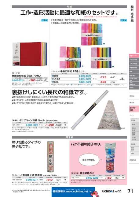 和紙・障子紙学習ペーパークラフト・素材イベント用品学習支援用品保育安全・安心OA・サプライ用品文具・事務用品日用品画用紙用模造紙模造紙おりがみ・和紙ノートノート学習帳習帳学習算数理科・社会国語・漢字英習・その他連絡帳絡帳横罫・罫・縦罫縦罫方眼眼各種用紙種工作・造形活動に最適な和紙のセットです。※天然素材を使用しているため、色・厚さなどが異なることがございます。和紙15cm●手漉き楮紙を一枚ずつ手染めした「板締染」と「もみ染め」。●楮繊維入り和紙を染めた「雲流紙」。15cm●●●お申込番号8-602-20228-602-20238-602-2024M価税抜税抜価格税込価格単位オープン¥773¥682¥850¥7501袋(15枚入)●紙寸法/15×15cm●紙厚/❶0.1mm、❷0.11〜0.12mm、❸0.11〜0.13mm●15柄各1枚入●包装数:1/10裏抜けしにくい長尺の和紙です。●墨や絵の具がにじまず、裏抜けしにくいので、下敷きがなくても机を汚しません。●薄くても丈夫。大書や共同制作の絵画・版画にも便利です。●薄くて下が透けて見えるので、お手本や下書きの上に置いてなぞって書けます。[墨運堂]ポップコーン和紙ロール95cm×20m商品種別型式/24401お申込番号8-602-1602M価税抜オープン税抜価格¥1,390税込価格¥1,529単位1巻●寸法/950幅)mm×20長)m●紙厚/0.08mm●質量/780g●材質/和紙(裏写り防止処理済)●包装数:1/6※油性インクは裏抜けしますのでご注意ください。使用例のりで貼るタイプの障子紙です。障子紙ハケ不要の障子のり。障子約4枚分。[ゴークラ]手染め和紙15色セット商品種別板締染もみ染め雲流紙●●●[ゴークラ]無地染め和紙35選70枚入お申込番号M価税抜税抜価格税込価格8-602-2021オープン¥960¥1,056単位1袋(70枚入)●紙寸法/15×15cm●紙厚/0.12〜0.13mm●35色各2枚入●包装数:1/30[アサヒペン]無地障子紙美濃判28cm×18.8m商品種別型式/05-6422お申込番号8-602-2077M価税抜¥600税抜価格¥540税込価格¥594単位1巻●寸法/280(幅)×60奥)mm●紙厚/0.11mm●坪量/45g/㎡●材質/パルプ90%、レーヨン、ビニロンバインダー10%、蛍光剤配合●障子約4枚分●包装数:1/25[菅公工業]障子紙用のり商品種別型式/ソ811お申込番号M価税抜8-602-2028オープン税抜価格¥189税込価格¥207単位1本●寸法/55(幅)×210(奥)mm●内容量/150g●主成分/小麦でんぷん●包装数:1/20※カタログに掲載の商品情報(仕様・価格・税率など)は変更になる場合がございます。最新情報はUCHIDASww.uchidas.netwへ!Vol.2071