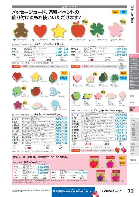 5枚入Mサイズ10枚入Sサイズ型抜いろがみ5枚入大判メッセージカード、各種イベントの飾り付けにもお使いいただけます!型抜いろがみ●熊(192×200mm)●ハート(175×180mm)●星(185×175mm)●りんご(183×205mm)●クローバー(188×195mm)●桜(180×188mm)お申込番号8-602-16968-602-16978-602-1698単位1袋(5枚入)商品種別色/シグナルレッド×3・リーフドロップ×2、型式/4101632色/グリーン×3・フレッシュレモン×2、型式/4101633色/ピーチ×3・チェリーブロッサム×2、型式/4101635税抜価格¥180税込価格¥198りんごクローバー桜●●●M価税抜¥200お申込番号8-602-16938-602-16948-602-1695単位1袋(5枚入)商品種別色/マホガニー×3・サンドベージュ×2、型式/4101627色/シグナルレッド×3・ピーチ×2、型式/4101629色/サニー×3・サニーデイジー×2、型式/4101630税抜価格¥180税込価格¥198M価税抜¥200熊ハート星●●●[ペーパーインテリジェンス]ダイカットペーパー大判5枚入●紙厚/約0.11mm●材質/タント紙(両面同色)●包装数:1/10LOOKP.49制作用型抜き色画用紙楽々キットを掲載しております。LOOKP.999ポスト・イット®シルエットノートを掲載しております。ポスター作りに最適!豊富な形でいろいろ作れる![エヒメ紙工]型抜いろがみビビットハートはなほしM価税抜¥200商品種別寸法/約62×68mm、質量/14g寸法/約69×67mm、質量/14g寸法/約67×67mm、質量/11gお申込番号8-603-20158-603-20168-603-2017税抜価格¥151税込価格¥166単位1冊(50枚入)さくらM価税抜¥200商品種別寸法/約69×70mm、質量/7g税抜価格¥151税込価格¥166単位1冊(20枚入)50枚入20枚入(さくらのみ)ハートはなお申込番号8-603-2021●紙厚/0.08mm●色/50枚入(黄橙・赤橙・緑・牡丹各5枚、橙・桃・黄・赤・紫各6枚)、20枚入(桃・黄各3枚、赤・紫・緑・赤橙・牡丹・黄橙・橙各2枚)●裏面白●包装数:1/10ほしさくら※カタログに掲載の商品情報(仕様・価格・税率など)は変更になる場合がございます。最新情報はUCHIDASww.uchidas.netwへ!Vol.2073学習ペーパークラフト・素材イベント用品学習支援用品保育安全・安心OA・サプライ用品文具・事務用品日用品画用紙用模造紙模造紙おりがみ・和紙ノートノート学習帳習帳学習算数理科・社会国語・漢字英習・その他連絡帳絡帳横罫・罫・縦罫縦罫方眼眼各種用紙種(55×78mm)球●気(75×55mm)きだし●吹(53×53mm)くら●さ(73×51mm)関車●機(51×50mm)んご●り⓰ハート(53×53mm)⓱スター(53×51mm)⓲葉っぱ(50×77mm)⓳四つ葉(52×56mm)商品種別色/ピーチ×2・ベリーレッド×6・ラディッシュ×2、型式/4101244色/ピーチ×1・フレッシュレモン×4・サニー×4・オーシャンブルー×1、型式/4101246色/モスグリーン×2・グリーンティ×2・リーフドロップ×2・グリーン×3・ドラゴンフライ×1、型式/4101252色/グリーン×2・リーフドロップ×2・セロリ×2・エメラルドアイス×2・プラネット×2、型式/4101255色/リーフドロップ×2・ベリーレッド×2・グリーン×4・ラディッシュ×2、型式/4101264色/サニー×2・オーシャンブルー×2・スカイブルー×3・カムザナイト×1・グリーン×2、型式/4101276色/ピーチ×4・ラディッシュ×2・チェリーブロッサム×4、型式/4101286色/バラ×3・ヒマワリ×3・白×2・うするり×2、型式/4101287色/ピーチ×4・オーシャンブルー×2・フレッシュレモン×4、型式/4101346税抜価格税込価格¥198¥180お申込番号8-602-16688-602-16698-602-16718-602-16728-602-16758-602-16778-602-16788-602-16798-602-1680単位1袋(10枚入)ハートスター葉っぱ四つ葉りんご機関車さくら吹きだし気球●●●●●●●●●M価税抜¥200[ペーパーインテリジェンス]ダイカットペーパーS10枚入●紙厚/約0.11mm●材質/タント紙(両面同色)●包装数:1/10LOOKP.172〜175クラフトパンチを掲載しております。(73×118mm)っぱ●葉(98×99mm)●とは(95×135mm)球●気(98×97mm)ター●ス(95×110mm)んご●り(95×65mm)きだし●吹(98×95mm)ート●ハ(99×101mm)つ葉●四(96×96mm)くら●さ商品種別色/ベリーレッド×3・ピーチ×1・ラディッシュ×1、型式/4101243色/サニー×2・ピーチ×1・オーシャンブルー×1・フレッシュレモン×1、型式/4101245色/ドラゴンフライ×1・グリーン×1・リーフドロップ×1・モスグリーン×1・グリーンティー×1、型式/4101251色/リーフドロップ×1・セロリ×1・グリーン×1・エメラルドアイス×1・プラネット×1、型式/4101254色/ベリーレッド×1・グリーン×2・ラディッシュ×1・リーフドロップ×1、型式/4101263色/オーシャンブルー×1・スノーホワイト×2・サーモンピンク×1・クールシャワー×1、型式/4101270色/ラディッシュ×1・チェリーブロッサム×2・ピーチ×2、型式/4101285色/バラ×2・ヒマワリ×1・白×1・うするり×1、型式/4101288色/オーシャンブルー×1・フレッシュレモン×2・ピーチ×2、型式/4101347税抜価格税込価格¥198¥180お申込番号8-602-16568-602-16578-602-16598-602-16608-602-16628-602-16648-602-16658-602-16668-602-1667単位1袋(5枚入)ハートスター葉っぱ四つ葉りんごはとさくら吹きだし気球●●●●●●●●●M価税抜¥200[ペーパーインテリジェンス]ダイカットペーパーM5枚入●紙厚/約0.11mm●材質/タント紙(両面同色)●包装数:1/10