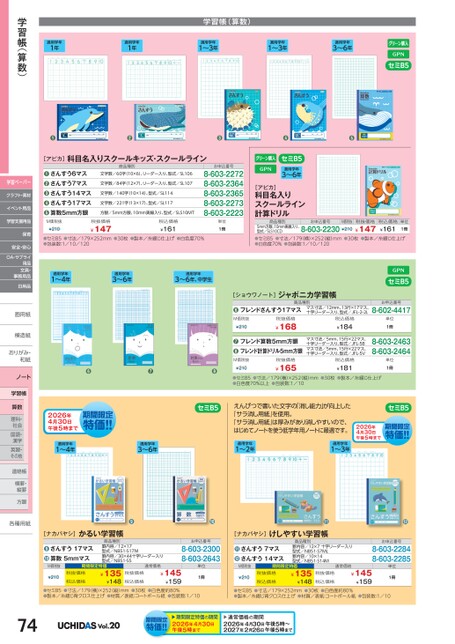 セミB5税込価格¥161単位1冊●●セミB5適用学年3〜6年[アピカ]科目名入りスクールライン計算ドリル商品種別5mm方眼、10mm実線入り、型式/SLS10CD8-603-2230¥210¥147お申込番号M価税抜税抜価格商品種別文字数/60字(10×6)、リーダー入り、型式/SL106文字数/84字(12×7)、リーダー入り、型式/SL107文字数/140字(10×14)、型式/SL114文字数/221字(13×17)、型式/SL117方眼/5mm方眼、10mm実線入り、型式/SLS10MTお申込番号8-603-22728-603-23648-603-23658-603-22738-603-2223さんすう6マスさんすう7マスさんすう14マスさんすう17マス算数5mm方眼❶❷❸❹❺[アピカ]科目名入りスクールキッズ・スクールラインM価税抜¥210税抜価格¥147税込価格¥161単位1冊●●●●セミB5●寸法/179×252mm●30枚●製本/糸綴じ仕上げ●白色度70%●包装数:1/10/120●セミB5●寸法/179(横)×252(縦)mm●30枚●製本/糸綴じ仕上げ●白色度70%●包装数:1/10/120適用学年1年適用学年1年適用学年1〜3年適用学年1〜3年適用学年3〜6年学習帳(算数)セミB5お申込番号8-602-4417単位1冊8-603-24638-603-2464単位1冊●セミB5●寸法/179(横)×252(縦)mm●30枚●製本/糸綴じ仕上げ●白色度70%以上●包装数:1/10マス寸法/5mm、15行×22マス、十字リーダー入り、型式/JFL-5Bマス寸法/5mm、15行×22マス、十字リーダー入り、型式/JFL-5V税込価格¥181フレンド算数5mm方眼フレンド計算ドリル5mm方眼❼❽M価税抜¥210税抜価格¥165[ショウワノート]ジャポニカ学習帳商品種別フレンドさんすう17マスマス寸法/12mm、13行×17マス、十字リーダー入り、型式/JFL-2-2L税抜価格¥168税込価格¥184❻M価税抜¥210適用学年1〜4年適用学年3〜6年適用学年3〜6年、中学生●●●2026年4月30日午後5時適用学年1〜4年セミB5えんぴつで書いた文字の「消し能力」が向上した『サラ消し用紙』を使用。『サラ消し用紙』は厚みがあり消しやすいので、はじめてノートを使う低学年用ノートに最適です。適用学年3〜6年適用学年1〜2年適用学年1〜3年セミB52026年4月30日午後5時●●●●お申込番号8-603-22848-603-2285単位1冊1冊¥210税抜価格税込価格¥135¥148税抜価格税込価格¥145¥159商品種別罫内容/12×7十字リーダー入り型式/NB51-S7ML罫内容/10×14型式/NB51-S14M通常価格M価税抜期間限定特価さんすう7マスさんすう14マス●●[ナカバヤシ]けしやすい学習帳お申込番号8-603-23008-603-2643単位¥210税抜価格税込価格¥135¥148税抜価格税込価格¥145¥159商品種別罫内容/12×17型式/NB51-S17M罫内容/30×44十字リーダー入り型式/NB51-S5通常価格さんすう17マス算数5mmマス価税抜期間限定特価❾●M[ナカバヤシ]かるい学習帳●セミB5●寸法/179横)×252縦)mm●30枚●白色度約80%●製本/糸綴じ背クロス仕上げ●材質/表紙:コートボール紙●包装数:1/10●セミB5●寸法/179×252mm●30枚●白色度約80%●製本/糸綴じ背クロス仕上げ●材質/表紙:コートボール紙●包装数:1/10通常価格の期間2026年4月30日午後5時〜2027年2月26日午後5時期間限定特価の期間2026年4月30日午後5時74Vol.20学習帳(算数)学習ペーパークラフト・素材イベント用品学習支援用品保育安全・安心OA・サプライ用品文具・事務用品日用品画用紙画用紙模造紙模造紙おりがみ・おりがみ・和紙和紙ノート学習帳算数理科・社会国語・漢字英習・その他その他連絡帳連帳横罫・横・縦罫縦罫方眼眼各種用紙各種用