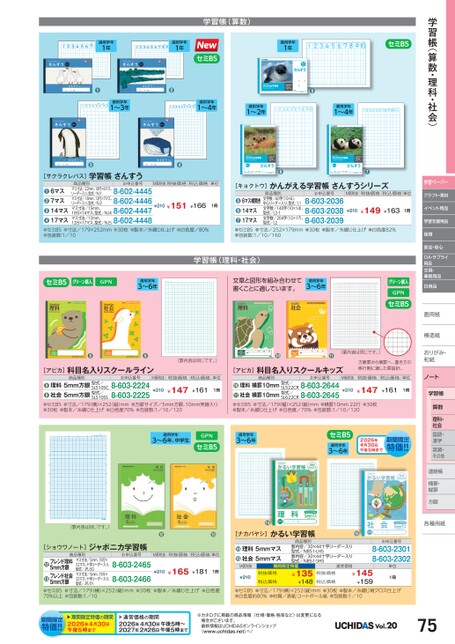 学習帳(算数・理科・社会)学習ペーパークラフト・素材イベント用品学習支援用品保育安全・安心OA・サプライ用品文具・事務用品日用品画用紙用模造紙模造紙おりがみ・おりがみ・和紙和紙ノートセミB5(罫内容は同じです。)方眼罫から横罫へ、書き方の移行期に適した罫設計。税抜価格税込価格単位¥210¥147¥1611冊学習帳学習●●[アピカ]科目名入りスクールキッズ商品種別お申込番号M価税抜理科横罫10mm型式/社会横罫10mm型式/SL522CR8-603-2644SL622CR8-603-2645●●¥210¥147¥1611冊(罫内容は同じです。)税抜価格税込価格単位M価税抜学習帳(算数)適用学年1年適用学年1年セミB5適用学年1年セミB5●●適用学年1〜3年適用学年1〜4年適用学年1〜2年●適用学年1〜4年●●M価税抜税抜価格税込価格単位¥210¥149¥1631冊商品種別文字数/60字(10×6)、中心リーダー入り、型式/L1文字数/140字(10×14)、型式/L2-1文字数/204字(12×17)、型式/L2お申込番号8-603-20368-603-20388-603-20396マス横開き14マス17マス●●●[キョクトウ]かんがえる学習帳さんすうシリーズ●●M価税抜税抜価格税込価格単位¥210¥151¥1661冊お申込番号商品種別マス寸法/22mm、10行×6マス、リーダー入り、型式/NJ1マス寸法/18mm、12行×7マス、リーダー入り、型式/NJ2マス寸法/15mm、8-602-44458-602-444610行×14マス、型式/NJ48-602-444712行×17マス、型式/NJ58-602-4448マス寸法/12mm、6マス7マス14マス17マス●●●●[サクラクレパス]学習帳さんすう●セミB5●寸法/179×252mm●30枚●製本/糸綴じ仕上げ●白色度/80%●包装数:1/10●セミB5●寸法/252×179mm●30枚●製本/糸綴じ仕上げ●白色度82%●包装数:1/10/160学習帳(理科・社会)セミB5適用学年3〜6年文章と図形を組み合わせて書くことに適しています。適用学年3〜6年算数理科・社会国語・漢字英習・その他連絡帳絡帳横罫・罫・縦罫縦罫方眼眼各種用紙種●セミB5●寸法/179横)×252縦)mm●方眼サイズ/5mm方眼、10mm実線入り●30枚●製本/糸綴じ仕上げ●白色度70%●包装数:1/10/120●セミB5●寸法/179幅)×252縦)mm●横罫10mm22行●30枚●製本/糸綴じ仕上げ●白色度/70%●包装数:1/10/120適用学年3〜6年、中学生セミB5適用学年3〜6年セミB5適用学年3〜6年2026年4月30日午後5時お申込番号8-603-23018-603-2302¥145¥159単位1冊[ナカバヤシ]かるい学習帳●商品種別罫内容/30×44十字リーダー入り型式/NB51-LH5罫内容/30×44十字リーダー入り型式/NB51-SH5通常価格¥135¥148税抜価格税込価格価税抜期間限定特価理科5mmマス社会5mmマス⓮●M¥210税抜価格税込価格●(罫内容は同じです。)[ショウワノート]ジャポニカ学習帳商品種別●●フレンド理科5mm方眼フレンド社会5mm方眼マス寸法/5mm、15行×22マス、十字リーダー入り、型式/JFL-5Gマス寸法/5mm、15行×22マス、十字リーダー入り、型式/JFL-5Yお申込番号8-603-24658-603-2466●●M価税抜税抜価格税込価格単位¥210¥165¥1811冊Vol.2075※カタログに掲載の商品情報(仕様・価格・税率など)は変更になる場合がございます。最新情報はUCHIDASオンラインショップ(www.uchidas.net)へ!通常価格の期間2026年4月30日午後5時〜2027年2月26日午後5時期間限定特価の期間2026年4月30日午後5時●セミB5●寸法/179(横)×252(縦)mm●30枚●製本/糸綴じ仕上げ●白色度70%以上●包装数:1/10●セミB5●寸法/179(横)×252(縦)mm●30枚●製本/糸綴じ背クロス仕上げ●白色度約80%●材質/表紙:コートボール紙●包装数:1/10●●[アピカ]科目名入りスクールラインお申込番号8-603-22248-603-2225商品種別理科5mm方眼型式/社会5mm方眼型式/SLS10SCSLS10SS●●