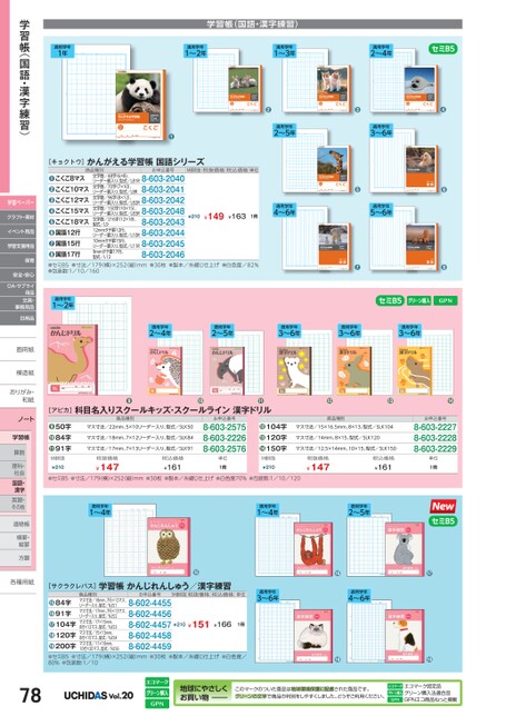 学習帳(国語・漢字練習)適用学年1年適用学年1〜2年適用学年1〜3年適用学年2〜4年セミB5適用学年3〜6年適用学年5〜6年●❺❼❹❻❽●●適用学年2〜5年¥210¥149¥1631冊適用学年4〜6年[キョクトウ]かんがえる学習帳国語シリーズ商品種別お申込番号M価税抜税抜価格税込価格単位文字数/48字(6×8)、文字数/150字(10×15)、文字数/70字(7×10)、リーダー罫入り、型式/L8R文字数/96字(8×12)、リーダー罫入り、型式/L81R8-603-20408-603-2041リーダー罫入り、型式/L82R8-603-2042リーダー罫入り、型式/L83R8-603-20488-603-2043リーダー罫入り、型式/L10R8-603-2044リーダー罫入り、型式/L11R8-603-20458-603-2046文字数/216字(12×18)、型式/L912mmタテ罫12行、9mmタテ罫17行、型式/L1210mmタテ罫15行、こくご8マスこくご10マスこくご12マスこくご15マスこくご18マス国語12行国語15行国語17行❶●●●●●●●●セミB5●寸法/179(横)×252縦)mm●30枚●製本/糸綴じ仕上げ●白色度/82%●包装数:1/10/160適用学年1〜2年セミB5グリーン購入GPN適用学年2〜4年適用学年2〜5年適用学年3〜6年適用学年3〜6年適用学年3〜6年お申込番号8-603-22278-603-22288-603-2229単位1冊セミB5●●●●マス寸法/15×16.5mm、8×13、型式/SLK104マス寸法/14mm、8×15、型式/SLK120マス寸法/12.5×14mm、10×15、型式/SLK150税抜価格¥147税込価格¥161104字120字150字⓬⓭⓮M価税抜¥210マス寸法/22mm、5×10リーダー入り、型式/SLK50マス寸法/18mm、7×12リーダー入り、型式/SLK84マス寸法/17mm、7×13リーダー入り、型式/SLK91お申込番号8-603-25758-603-22268-603-2576税抜価格¥147税込価格¥161単位1冊50字84字91字❾❿⓫M価税抜¥210[アピカ]科目名入りスクールキッズ・スクールライン漢字ドリル●●●商品種別●商品種別●セミB5●寸法/179横)×252縦)mm●30枚●製本/糸綴じ仕上げ●白色度70%●包装数:1/10/120適用学年1〜4年適用学年1〜4年適用学年2〜5年適用学年4〜6年●●M価税抜税抜価格税込価格単位適用学年3〜6年¥210¥151¥1661冊商品種別マス寸法/18mm、7行×12マス、リーダー入り、型式/NJ51マス寸法/17mm、7行×13マス、リーダー入り、型式/NJ52マス寸法/17×15mm、8行×13マス、型式/NJ53マス寸法/15×13mm、8行×15マス、型式/NJ54マス寸法/11×10mm、10行×20マス、型式/NJ56お申込番号8-602-44558-602-44568-602-44578-602-44588-602-445984字91字104字120字200字●●●●●[サクラクレパス]学習帳かんじれんしゅう/漢字練習●●セミB5●寸法/179(横)×252(縦)mm●30枚●製本/糸綴じ仕上げ●白色度/80%●包装数:1/10学習帳(国語・漢字練習)学習ペーパークラフト・素材イベント用品学習支援用品保育安全・安心OA・サプライ用品文具・事務用品日用品画用紙画用紙模造紙模造紙おりがみ・おりがみ・和紙和紙ノート学習帳算数算理科・社会国語・漢字英習・その他その他連絡帳連帳横罫・横・縦罫縦罫方眼眼各種用紙各種用78Vol.20地球にやさしくお買い物このマークのついた商品は地球環境保護に配慮された商品です。グリーンの文字で商品の判別をしやすくしました。どうぞご利用ください。エコマーク認定品グリーン購入法適合品GPNエコ商品ねっと掲載