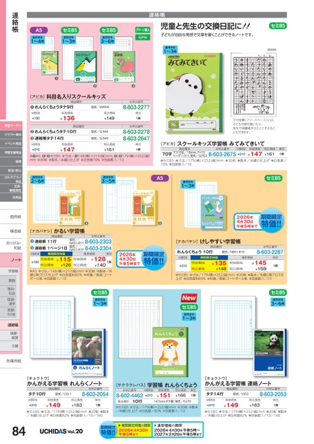 連絡帳A5適用学年1〜4年セミB5適用学年1〜3年セミB5適用学年3〜6年グリーン購入GPN児童と先生の交換日記に!!子どもが自由な発想で文章を書くことができるノートです。適用学年1〜3年セミB5使用例●●●下の空欄(フリースペース)には、子どもが絵を描いたり、先生や保護者がひとことそえることもできます。[アピカ]スクールキッズ学習帳みてみてきいて商品種別お申込番号M価税抜税抜価格リーダー入り、型式/SL9528-603-2675¥21070字マス寸法/18mm、7×10●セミB5●寸法/179(横)×252(縦)mm●30枚●製本/糸綴じ仕上げ●白色度/70%●包装数:1/10¥147税込価格¥161単位1冊A5●適用学年1〜3年セミB52026年4月30日午後5時[ナカバヤシ]けしやすい学習帳商品種別れんらくちょう10行型式/NB51-R10お申込番号8-603-2287M価税抜¥210期間限定特価通常価格税抜価格税込価格¥135¥148税抜価格税込価格¥145¥159単位1冊●セミB5●寸法/179(横)×252(縦)mm●30枚●製本/糸綴じ背クロス仕上げ●白色度約80%●材質/表紙:コートボール紙●包装数:1/10セミB5適用学年1〜3年セミB5適用学年3〜6年型式/SM945税込価格¥149型式/SL944型式/SL949お申込番号8-603-2277単位1冊お申込番号8-603-22788-603-2647税込価格¥161単位1冊[アピカ]科目名入りスクールキッズれんらくちょうタテ9行商品種別税抜価格¥136価税抜¥180●M商品種別れんらくちょうタテ10行連絡帳タテ14行●●M価税抜¥210税抜価格¥147●●A5、●❷・●セミB5●寸法/●148(横)×210縦)mm、●・●179(横)×252(縦)mm●30枚●製本/糸綴じ仕上げ●白色度70%●包装数:1/10適用学年2〜6年適用学年3〜5年●2026年4月30日午後5時お申込番号型式/型式/NA51-R118-603-2303NA51-R1P8-603-2304¥1281冊税抜価格通常価格単位税込価格¥140商品種別連絡帳11行連絡帳1ページ1日❹❺M価税抜¥180期間限定特価税抜価格税込価格¥115¥126[ナカバヤシ]かるい学習帳●A5●寸法/148(横)×210(縦)mm●30枚●製本/糸綴じ背クロス仕上げ●白色度約80%●材質/表紙:コートボール紙●包装数:1/10セミB5適用学年1〜3年連絡帳学習ペーパークラフト・素材イベント用品学習支援用品保育安全・安心OA・サプライ用品文具・事務用品日用品画用紙画用紙模造紙模造紙おりがみ・おりがみ・和紙和紙ノート学習帳学帳算数算理科・社会国語・漢字英習・その他その他連絡帳横罫・横・縦罫縦罫方眼眼各種用紙各種用[キョクトウ]かんがえる学習帳連絡ノート商品種別タテ14行型式/L502お申込番号8-603-2053M価税抜¥210税抜価格¥149税込価格¥163単位1冊●セミB5●寸法/179(横)×252(縦)mm●30枚●製本/糸綴じ仕上げ●白色度82%●包装数:1/10/160[サクラクレパス]学習帳れんらくちょうお申込番号8-602-446210行商品種別M価税抜¥210税抜価格¥151税込価格¥166単位1冊14.5mmタテ罫、型式/NJ70通常価格の期間2026年4月30日午後5時〜2027年2月26日午後5時期間限定特価の期間2026年4月30日午後5時●セミB5●寸法/179(横)×252縦)mm●30枚●製本/糸綴じ仕上げ●白色度/80%●包装数:1/10[キョクトウ]かんがえる学習帳れんらくノート商品種別タテ10行型式/L50-1お申込番号8-603-2054M価税抜¥210税抜価格¥149税込価格¥163単位1冊●セミB5●寸法/179横)×252(縦)mm●30枚●製本/糸綴じ仕上げ●白色度82%●包装数:1/10/16084Vol.20