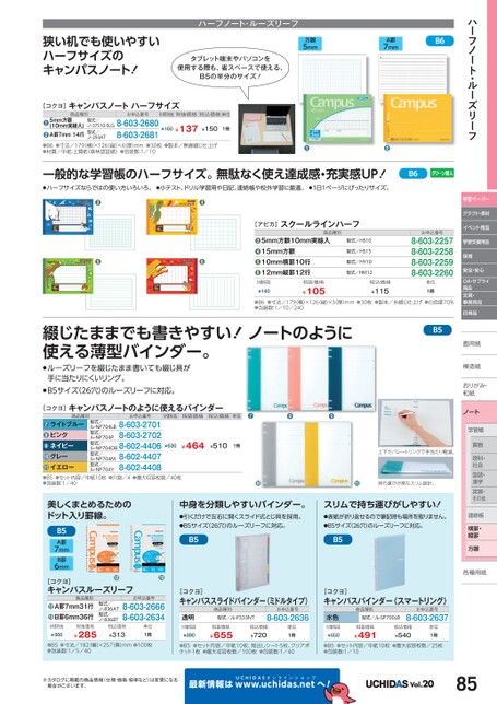 ハーフノート・ルーズリーフ学習ペーパークラフト・素材イベント用品学習支援用品保育安全・安心OA・サプライ用品文具・事務用品日用品画用紙用模造紙模造紙おりがみ・おりがみ・和紙和紙ノート学習帳習帳学習算数理科・社会国語・漢字英習・その他連絡帳絡帳横罫・縦罫方眼各種用紙種¥630¥464¥5101冊上下セパレートリングで手当たり軽減。●B5●セット内容/中紙10枚●穴数/4●最大収容枚数/40枚●包装数:1/40●●持ち運びが楽なスリム設計。美しくまとめるためのドット入り罫線。B5A罫7mmB罫6mm中身を分類しやすいバインダー。●引くだけで左右に開くスライド式とじ具を採用。●B5サイズ(26穴)のルーズリーフに対応。スリムで持ち運びがしやすい!●表紙が折り返せるので筆記時も場所を取りません。●B5サイズ(26穴)のルーズリーフに対応。B5B5[コクヨ]キャンパススライドバインダー(ミドルタイプ)[コクヨ]キャンパスバインダー〈スマートリング〉透明M価税抜¥890商品種別型式/ル-P333NTお申込番号8-603-2636税抜価格¥655税込価格¥720単位1冊水色M価税抜¥650商品種別型式/ル-SP700LBお申込番号8-603-2637税抜価格¥491税込価格¥540単位1冊[コクヨ]キャンパスルーズリーフ●●型式/ノ-836AT型式/ノ-836BTお申込番号8-603-26668-603-2634税込価格¥313単位1冊商品種別A罫7mm31行B罫6mm36行●●M価税抜¥360税抜価格¥285●B5●寸法/182幅)×257奥)mm●100枚●包装数:1/5/40●B5●セット内容/中紙10枚、見出しシート5枚、クリアポケット1枚●最大収容枚数/100枚●包装数:1/40●B5●セット内容/中紙10枚●最大収容枚数/25枚●包装数:1/10※カタログに掲載の商品情報(仕様・価格・税率など)は変更になる場合がございます。最新情報はUCHIDASww.uchidas.netwへ!Vol.2085狭い机でも使いやすいハーフサイズのキャンパスノート!ハーフノート・ルーズリーフ方眼5mmA罫7mmB6タブレット端末やパソコンを使用する際も、省スペースで使える、B5の半分のサイズ!●B6●寸法/179(横)×126(縦)×4(厚)mm●30枚●製本/無線綴じ仕上げ●材質/中紙:上質紙(森林認証紙)●包装数:1/10●●一般的な学習帳のハーフサイズ。無駄なく使え達成感・充実感UP!●ハーフサイズならではの使い方いろいろ。●小テスト、ドリル学習用や日記、連絡帳や校外学習に最適。●1日1ページにぴったりサイズ。B6グリーン購入お申込番号8-603-22578-603-22588-603-22598-603-2260単位1冊M価税抜¥140税抜価格¥105税込価格¥115型式/HS10型式/HS15型式/HY10型式/HM125mm方眼10mm実線入15mm方眼10mm横罫10行12mm縦罫12行●●●●[アピカ]スクールラインハーフ商品種別●●●●●B6●寸法/179(横)×126縦)×3(厚)mm●30枚●製本/糸綴じ仕上げ●白色度70%●包装数:1/10/240綴じたままでも書きやすい!ノートのように使える薄型バインダー。●ルーズリーフを綴じたまま書いても綴じ具が手に当たりにくいリング。●B5サイズ(26穴)のルーズリーフに対応。B5[コクヨ]キャンパスノートハーフサイズ商品種別お申込番号M価税抜税抜価格税込価格単位¥160¥137¥1501冊型式/ノ-37S10-5LG型式/ノ-293AT8-603-26808-603-26815mm方眼(10mm実線入)A罫7mm14行●●[コクヨ]キャンパスノートのように使えるバインダー商品種別お申込番号M価税抜税抜価格税込価格単位❼❽❾型式/ル-NP704LB型式/ル-NP704P型式/8-603-27018-603-2702ル-NP704DB8-602-44068-602-44078-602-4408型式/ル-NP704M型式/ル-NP704Yライトブルーピンクネイビーグレーイエロー●●●●●