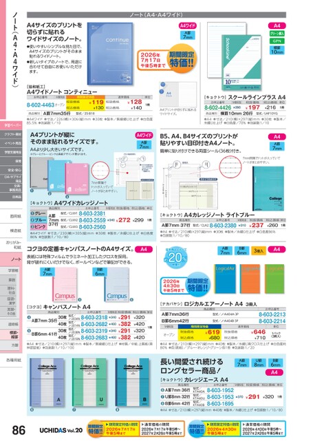 A4サイズのプリントを切らずに貼れるワイドサイズのノート。●使いやすいシンプルな見た目で、A4サイズのプリントがそのまま貼れるワイドノート。●新しいタイプのノートで、用途に合わせて自由にお使いいただけます。ノート(A4・A4ワイド)A4ワイドA罫7mm2026年7月17日午後5時A4横罫10mm[協和紙工]A4ワイドノートコンティニューお申込番号M価税抜期間限定特価8-602-4463オープン税抜価格税込価格商品種別A罫7mm35行型式/25-B18通常価格¥119¥130税抜価格税込価格¥128¥140単位1冊A4プリントが切らずに貼れるワイドサイズ。[キョクトウ]スクールラインプラスA4お申込番号8-602-4426M価税抜¥290商品種別横罫10mm26行税抜価格¥197税込価格¥216型式/LAP10YG単位1冊●A4ワイド●寸法/226(横)×306(縦)mm●30枚●製本/無線綴じ仕上げ●白色度85.5%●包装数:1/10●A4●寸法/210(横)×297縦)mm●30枚●製本/糸綴じ仕上げ●白色度/70%●包装数:1/10A4プリントが縦にそのまま貼れるサイズです。A4より少し大きいサイズです。※グレーとブルー・ピンクは表紙デザインが異なります。A4ワイドA罫7mmB5、A4、B4サイズのプリントが貼りやすい目印付きA4ノート。簡単に貼り付けできる両面シール(36枚)付き。A4A罫7mm7mm間隔でドットが入っていてノートがまとめやすい。[キョクトウ]A4カレッジノートライトブルー商品種別税込価格単位¥260A罫7mm37行1冊●A4●寸法/210(横)×297(縦)mm●30枚●製本/糸綴じ仕上げ●白色度86%●包装数:1/10/80型式/CLA28-603-2380¥237M価税抜¥310お申込番号税抜価格A罫7mmB罫6mm3冊入A42026年4月30日午後5時[ナカバヤシ]ロジカルエアーノートA43冊入A罫7mm36行B罫6mm42行商品種別型式/ノ-A404A-3P型式/ノ-A404B-3Pお申込番号8-603-22138-603-22141冊M価税抜オープン期間限定特価¥619¥680通常価格¥646¥710単位1パック(3冊入)税抜価格税込価格税抜価格税込価格7mm間隔でドットが入っていてノートがまとめやすい。お申込番号M価税抜税抜価格税込価格単位¥340¥272¥2991冊[キョクトウ]A4ワイドカレッジノート型式/CLW18-603-2381型式/CLW28-603-2559型式/CLW38-603-2560商品種別A罫7mm37行グレーブルーピンク●●●●❷❸●A4ワイド●寸法/230(横)×305(縦)mm●30枚●製本/糸綴じ仕上げ86%●包装数:1/10/80●白色度コクヨの定番キャンパスノートのA4サイズ。表紙には特殊フィルムでラミネート加工したクロスを採用。背が破れにくいだけでなく、ボールペンなどで筆記ができる。A4A罫7mmB罫6mm●●[コクヨ]キャンパスノートA4商品種別お申込番号M価税抜税抜価格税込価格単位●●A罫7mm35行B罫6mm41行30枚40枚30枚40枚型式/型式/ノ-203AN8-603-2318¥340ノ-201AN8-603-2682¥460ノ-203BN8-603-2319¥340ノ-201BN8-603-2683¥460型式/型式/¥291¥382¥291¥382¥320¥420¥320¥420●A4●寸法/210(横)×297(縦)mm●製本/無線綴じ仕上げ●材質/中紙:上質紙(森林認証紙)●包装数:1/10/100●A4●寸法/210(横)×297(縦)mm●40枚●製本/糸綴じ背クロス仕上げ●白色度約80%●色(表紙)/ブルー・オレンジ・グリーン各1冊●包装数:1/20A罫7mmU罫8mmB罫6mmA4M価税抜税抜価格税込価格単位¥370¥291¥3201冊長い間愛され続けるロングセラー商品![キョクトウ]カレッジエースA4型式/KTA40A型式/KTA40U型式/KTA40Bお申込番号8-603-19528-603-19538-603-1695商品種別A罫7mm36行U罫8mm32行B罫6mm42行❻❼❽●A4●寸法/210横)×297(縦)mm●40枚●製本/糸綴じ仕上げ●包装数:1/10/80●●●ノート(A4・A4ワイド)学習ペーパークラフト・素材イベント用品学習支援用品保育安全・安心OA・サプライ用品文具・事務用品日用品画用紙画用紙模造紙模造紙おりがみ・おりがみ・和紙和紙ノート学習帳学帳算数算理科・社会国語・漢字英習・その他その他連絡帳連帳横罫・縦罫方眼眼各種用紙各種用通常価格の期間2026年4月30日午後5時〜2027年2月26日午後5時期間限定特価の期間2026年4月30日午後5時86Vol.20期間限定特価の期間2026年7月17日午後5時通常価格の期間2026年7月17日午後5時〜2027年2月26日午後5時