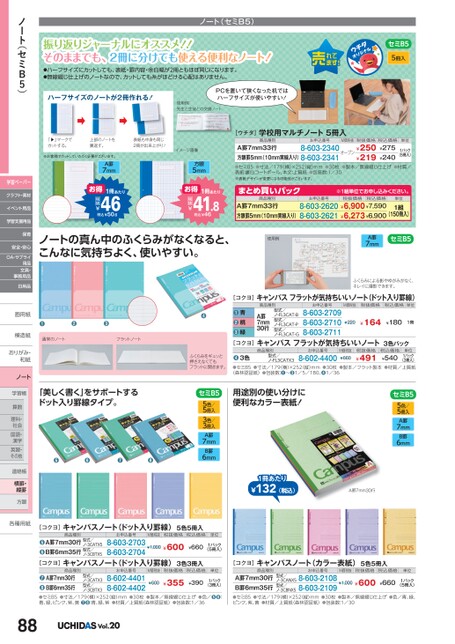 ノート(セミB5)振り返りジャーナルにオススメ!!そのままでも、2冊に分けても使える便利なノート!●ハーフサイズにカットしても、表紙・罫内容・余白幅が2冊ともほぼ同じになります。●無線綴じ仕上げのノートなので、カットしても糸がほどける心配はありません。セミB55冊入[ウチダ]学校用マルチノート5冊入商品種別A罫7mm33行方眼罫5mm(10mm実線入り)8-603-23418-603-2340オープン¥250¥219M価税抜税抜価格税込価格¥275¥240お申込番号単位1パック(5冊入)●セミB5●寸法/179横)×252(縦)mm●30枚●製本/無線綴じ仕上げ●材質/表紙:裏白コートボール、本文:上質紙●包装数:1/30※表紙デザインが変更になる可能性がございます。商品種別まとめ買いパック8-603-2620¥6,900¥7,590A罫7mm33行方眼罫5mm(10mm実線入り)8-603-2621¥6,273¥6,900お申込番号税抜価格税込価格単位1組(150冊入)※1組単位申込。1冊あたり41.8税込¥46税抜¥お得461冊あたり税込¥50.6税抜¥お得「▶」マークでカットする。上部のノートを裏返す。表紙も中身も同じ2冊が出来上がり!※お客様でカットしていただく必要がございます。A罫7mmイメージ画像方眼5mmハーフサイズのノートが2冊作れる!➡➡PCを置いて狭くなった机ではハーフサイズが使いやすい!使用例:先生と生徒との交換ノートノートの真ん中のふくらみがなくなると、こんなに気持ちよく、使いやすい。使用例A罫7mmセミB5ふくらみによる影やゆがみがなく、キレイに撮影できます。[コクヨ]キャンパスフラットが気持ちいいノート3色パック商品種別●3色(3冊入)●セミB5●寸法/179(横)×252(縦)mm●30枚●製本/フラット製本●材質/上質紙お申込番号8-602-4400M価税抜¥660税抜価格¥491税込価格¥540単位1パック型式/ノ-FL3CATX3(森林認証紙)●包装数:❶〜❸1/5/180、❹1/36用途別の使い分けに便利なカラー表紙!セミB55色/5冊入A罫7mmB罫6mm[コクヨ]キャンパスフラットが気持ちいいノート(ドット入り罫線)M価税抜税抜価格税込価格単位¥220¥164¥1801冊商品種別A罫7mm30行型式/ノ-FL3CAT-B型式/ノ-FL3CAT-P型式/ノ-FL3CAT-Gお申込番号8-603-27098-603-27108-603-2711青桃緑●●●●ふくらみをギュッと押さえなくてもフラットに開きます。セミB55色/5冊入3色/3冊入A罫7mmB罫6mm●●●通常のノートフラットノート「美しく書く」をサポートするドット入り罫線タイプ。●●●●ノート(セミB5)学習ペーパークラフト・素材イベント用品学習支援用品保育安全・安心OA・サプライ用品文具・事務用品日用品画用紙画用紙模造紙模造紙おりがみ・おりがみ・和紙和紙ノート学習帳学帳算数算理科・社会国語・漢字英習・その他その他連絡帳連帳横罫・縦罫方眼眼各種用紙各種用1冊あたり¥132(税込)A罫7mm30行単位[コクヨ]キャンパスノート(カラー表紙)5色5冊入商品種別お申込番号M価税抜税抜価格税込価格単位型式/ノ-3CANX58-603-21088-603-2109A罫7mm30行B罫6mm35行●セミB5●寸法/179横)×252(縦)mm●30枚●製本/無線綴じ仕上げ●色/青、緑、ピンク、紫、黄●材質/上質紙(森林認証紙)●包装数:1/30¥1,000¥600型式/ノ-3CBNX5¥660(5冊入)1パックM価税抜税抜価格税込価格¥1,000¥600¥6601パック(5冊入)お申込番号8-603-27038-603-2704商品種別ノ-3CBTX5ノ-3CATX5A罫7mm30行型式/B罫6mm35行型式/●●[コクヨ]キャンパスノート(ドット入り罫線)5色5冊入M価税抜税抜価格税込価格単位¥600¥355¥3901パック(3冊入)お申込番号8-602-44018-602-4402商品種別型式/ノ-3CATX3型式/ノ-3CBTX3A罫7mm30行B罫6mm35行●●[コクヨ]キャンパスノート(ドット入り罫線)3色3冊入●セミB5●寸法/179(横)×252(縦)mm●30枚●製本/無線綴じ仕上げ●色/❺❻:青、緑、ピンク、紫、黄❼❽:青、緑、紫●材質/上質紙(森林認証紙)●包装数:1/3688Vol.20